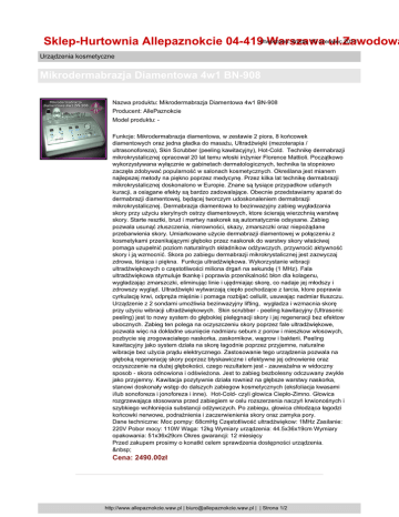 środa, 15 czerwiec 2011 Sklep-Hurtownia Allepaznokcie 04-419Utworzono: Warszawa ul.Zawodowa Urządzenia kosmetyczne Mikrodermabrazja Diamentowa 4w1 BN-908 Nazwa produktu: Mikrodermabrazja Diamentowa 4w1 BN-908 Producent: AllePaznokcie Model produktu: Funkcje: Mikrodermabrazja diamentowa, w zestawie 2 piora, 8 końcowek diamentowych oraz jedna gładka do masażu, Ultradźwięki (mezoterapia / ultrasonoforeza), Skin Scrubber (peeling kawitacyjny), Hot-Cold. Technikę dermabrazji mikrokrystalicznej opracował 20 lat temu włoski inżynier Florence Mattioli. Początkowo wykorzystywana wyłącznie w gabinetach dermatologicznych, technika ta stopniowo zaczęła zdobywać popularność w salonach kosmetycznych. Określana jest mianem najlepszej metody na piękno poprzez medycynę. Przez kilka lat technikę dermabrazji mikrokrystalicznej doskonalono w Europie. Znane są tysiące przypadkow udanych kuracji, a osiągane efekty są bardzo zadowalające. Obecnie przedstawiamy aparat do dermabrazji diamentowej, będącej tworczym udoskonaleniem dermabrazji mikrokrystalicznej. Dermabrazja diamentowa to bezinwazyjny zabieg wygładzania skory przy użyciu sterylnych ostrzy diamentowych, ktore ścierają wierzchnią warstwę skory. Starte resztki, brud i martwy naskorek są automatycznie odsysane. Zabieg pozwala usunąć złuszczenia, nierowności, skazy, zmarszczki oraz niepożądane przebarwienia skory. Umiarkowane użycie dermabrazji diamentowej w połączeniu z kosmetykami przenikającymi głęboko przez naskorek do warstwy skory właściwej pomaga uzupełnić poziom naturalnych składnikow odżywczych, przywrocić aktywność skory i ją wzmocnić. Skora po zabiegu dermabrazji mikrokrystalicznej jest zazwyczaj zdrowa, lśniąca i piękna. Funkcja ultradźwiękowa. Wykorzystanie wibracji ultradźwiękowych o częstotliwości miliona drgań na sekundę (1 MHz). Fala ultradźwiękowa stymuluje tkankę i poprawia przenikalność błon dla kolagenu, wygładzając zmarszczki, eliminując linie i ujędrniając skorę, co nadaje jej młodszy i zdrowszy wygląd. Ultradźwięki wytwarzają ciepło pochodzące z tarcia, ktore poprawia cyrkulację krwi, odpręża mięśnie i pomaga rozbijać cellulit, usuwając nadmiar tłuszczu. Urządzenie z 2 sondami umożliwia bezinwazyjny lifting, wygładza i wzmacnia skorę przy użyciu wibracji ultradźwiękowych. Skin scrubber - peeling kawitacyjny (Ultrasonic peeling) jest to nowy system do głębokiej pielęgnacji skory i jej regeneracji bez efektow ubocznych. Zabieg ten polega na oczyszczeniu skory poprzez fale ultradźwiękowe, pozwala więc na dokładne usunięcie nadmiaru sebum z porow i mieszkow włosowych, pozbycie się zrogowaciałego naskorka, zaskornikow, wągrow i bakterii. Peeling kawitacyjny jako system działa na skorę łagodnie poprzez przyjemne, naturalne wibracje bez użycia prądu elektrycznego. Zastosowanie tego urządzenia pozwala na głęboką regenerację skory poprzez błyskawiczne i efektywne jej odnowienie oraz oczyszczenie na dużej głębokości, czego rezultatem jest - zauważalna w widoczny sposob - skora odnowiona i odświeżona. Jest to zabieg bezbolesny odczuwany zwykle jako przyjemny. Kawitacja pozytywnie działa rownież na głębsze warstwy naskorka, stanowi doskonały wstęp do dalszych zabiegow kosmetycznych (eksfoliacja kwasami i/lub sonoforeza i jonoforeza i inne). Hot-Cold- czyli głowica Ciepło-Zimno. Głowica rozgrzewająca stosowana przed zabiegiem w celu rozszerzenia naczyń krwionośnych i szybkiego wchłonięcia substancji odżywczych. Po zabiegu, głowica chłodząca łagodzi końcowki nerwowe, podrażnienia i zaczerwienienia skory oraz zamyka pory. Dane techniczne: Moc pompy: 68cmHg Częstotliwość ultradźwiękow: 1MHz Zasilanie: 220V Pobor mocy: 110W Waga: 12kg Wymiary urządzenia: 44.5x36x19cm Wymiary opakowania: 51x36x29cm Okres gwarancji: 12 miesięcy Przed zakupem prosimy o konatkt celem sprawdzenia dostępności urządzenia. Cena: 2490.00zł http://www.allepaznokcie.waw.pl | [email protected] | | Strona 1/2 środa, 15 czerwiec 2011 Sklep-Hurtownia Allepaznokcie 04-419Utworzono: Warszawa ul.Zawodowa Urządzenia kosmetyczne Mikrodermabrazja Diamentowa 4w1 BN-908 Dostępność: Ten produkt został dodany do sklepu w dniu czwartek, 10 wrzesień 2009 http://www.allepaznokcie.waw.pl | [email protected] | | Strona 2/2