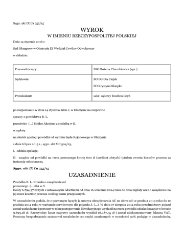Sygn. akt IX Ca 755/15 WYROK W IMIENIU RZECZYPOSPOLITEJ POLSKIEJ Dnia 14 stycznia 2016 r. Sąd Okręgowy w Olsztynie IX Wydział Cywilny Odwoławczy w składzie: Przewodniczący: SSO Bożena Charukiewicz (spr.) Sędziowie: SO Dorota Ciejek SO Krystyna Skiepko Protokolant: sekr. sądowy Ewelina Gryń po rozpoznaniu w dniu 14 stycznia 2016 r. w Olsztynie na rozprawie sprawy z powództwa B. L. przeciwko (...) Spółce Akcyjnej z siedzibą w S. o zapłatę na skutek apelacji powódki od wyroku Sądu Rejonowego w Olsztynie z dnia 6 lipca 2015 r., sygn. akt X C 504/15, I. oddala apelację, II. zasądza od powódki na rzecz pozwanego kwotę 600 zł (sześćset złotych) tytułem zwrotu kosztów procesu za instancję odwoławczą. Sygn. akt IX Ca 755/15 UZASADNIENIE Powódka B. L. wniosła o zasądzenie od pozwanego (...) SA w S. kwoty 6.794,37 złotych z ustawowymi odsetkami od dnia 16 września 2014 roku do dnia zapłaty oraz o zasądzenie na jej rzecz kosztów procesu według norm przepisanych. W uzasadnieniu podała, że z pozwanym łączyła ją umowa ubezpieczenia AC na okres od 12 grudnia 2013 roku do 12 grudnia 2014 roku w wariancie serwisowym dla pojazdu J. (...). W dniu 17 sierpnia 2014 roku przedmiotowy pojazd został uszkodzony i pozwany w toku postępowania likwidacyjnego wypłacił na rzecz powódki odszkodowanie w kwocie 9.693,18 zł. Rzeczywisty koszt naprawy samochodu wyniósł 16.487,55 zł i został udokumentowany fakturą VAT. Pozwany bezpodstawnie zastosował urealnienie cen części zamiennych w wysokości 50% podając w uzasadnieniu, iż powódka nie udokumentowała zakupu nowych części oryginalnych. Ponadto pozwany powinien był wypłacić odszkodowanie w żądanej przez nią kwocie bez przedkładania przez powódkę faktur VAT, bowiem rzeczywisty koszt naprawy pojazdu nie przekraczał wartości wyliczonej w oparciu o wariant kosztorysowy. Pozwany (...) SA w S. w wniósł o oddalenie powództwa. W uzasadnieniu podał, że łącząca strony umowa ubezpieczenia dobrowolnego daje podstawy do uzależnienia wypłaty odszkodowania w oparciu o fakturę od przedłożenia faktur dokumentujących zakup części zamiennych. Dodatkowo wskazał, iż nawet taka faktura podlega weryfikacji, której pozwany dokonał uznając stawkę za prace blacharskolakiernicze za zawyżoną. Pozwany wskazał, że przedłożona przez powódkę faktura nie dokumentuje zakupu części, bowiem jest to faktura zbiorcza za naprawę, do której załączony został kosztorys. Pozwany zakwestionował również prawidłowość postępowania powódki, która, zgodnie z ogólnymi warunkami ubezpieczenia przy wariancie serwisowym, winna była sposób naprawy i wysokość wynikających z niej kosztów uzgodnić z pozwanym przed rozpoczęciem naprawy pojazdu, a z ciążących na niej z mocy umowy obowiązków się nie wywiązała. Wyrokiem z dnia 6 lipca 2015 r. Sąd Rejonowy w Olsztynie oddalił powództwo. Zasądził od powódki na rzecz pozwanego kwotę 1.217 zł tytułem zwrotu kosztów procesu. Sąd Rejonowy ustalił, że powódka B. L. posiadała w (...) SA, obecnie (...) S.A. w S. umowę ubezpieczenia pojazdu marki J. (...), w tym ubezpieczenie auto- casco w wariancie serwisowym. Ubezpieczenie AC w wersji serwisowej obejmowało szkodę częściową lub całkowitą powstałą w pojeździe na skutek m.in. uszkodzenia pojazdu przez osoby trzecie. W zależności od wyboru dokonanego przez ubezpieczającego przy zawieraniu umowy ubezpieczenia, wartość szkody częściowej miała być ustalana w wariancie kosztorysowym lub po opłaceniu dodatkowej składki - w wariancie serwisowym. W tym ostatnim ustalenie wartości szkody następowało po przedłożeniu faktur dokumentujących naprawę pojazdu według uprzednio uzgodnionych z ubezpieczycielem kosztów i sposobu naprawy pojazdu przez zakład dokonujący naprawy w oparciu o normy czasowe producenta ujęte w systemie Audatex, średnią stawkę za roboczogodzinę adekwatną dla warsztatu naprawczego oraz ceny części i materiałów producenta ujęte w systemie Audatex, nie więcej niż średnie ceny zalecane przez producenta lub oficjalnego importera do stosowania przez ich sieć serwisową. Przy wariancie serwisowym rozpoczęcie naprawy pojazdu, sposób naprawy i wysokość jej kosztów wymagały każdorazowego uprzedniego uzgodnienia z ubezpieczycielem. OWU przewidywały również obowiązek przedłożenia przez ubezpieczającego kompletu faktur dotyczących robocizny, części zamiennych i materiałów ( również lakierniczych) w sytuacji, gdy koszty naprawy pojazdu przekraczają wartość ustaloną według wariantu kosztorysowego oraz weryfikację do średniej arytmetycznej cen usług naprawczych stosowanych na terenie powiatu właściwego dla miejsca zamieszkania ubezpieczającego oraz ceny części do maksymalnej wysokości zawartych w systemie Audatex w wypadku udokumentowania fakturami naprawy dokonanej bez uprzedniego uzgodnienia z ubezpieczycielem. W sierpniu 2014 roku należący do powódki pojazd został uszkodzony na parkingu przez nieznanego sprawcę. Uszkodzone zostały maska silnika, reflektor, przedni lewy błotnik, listwa drzwi przednich lewych, szyba drzwi przednich lewych oraz przednie lewe drzwi. W związku z tym, iż powódka zamierzała sprzedać przedmiotowy pojazd, zaś nabywcy zależało na szybkości transakcji, powódka, bez uprzedniego uzgodnienia z pozwanym po przeprowadzeniu oględzin oddała samochód do naprawy do (...) B. P. K. w O.. Za naprawę powódka zapłaciła 16.487,53 zł. W toku postępowania likwidacyjnego pozwany przyznał na rzecz powódki odszkodowanie w łącznej wysokości 9.693,18 złotych. W ocenie Sądu Rejonowego roszczenie powódki nie zasługiwało na uwzględnienie. Prawa i obowiązki stron wynikają z umowy ubezpieczenia i stanowiących jej integralną część ogólnych warunków ubezpieczenia. Wynika z nich, że powódka była zobowiązana uzgodnić przed rozpoczęciem naprawy pojazdu, jej rozpoczęcie, s