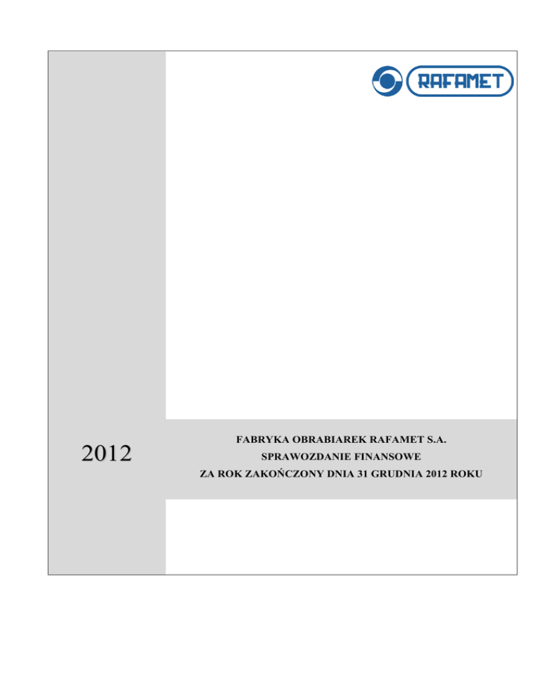 2012 FABRYKA OBRABIAREK RAFAMET S.A. SPRAWOZDANIE FINANSOWE ZA ROK ZAKOŃCZONY DNIA 31 GRUDNIA 2012 ROKU Fabryka Obrabiarek RAFAMET S.A. Sprawozdanie finansowe za rok zakończony dnia 31 grudnia 2012 roku ( w tysiącach złotych) SPIS TREŚCI Wybrane dane finansowe .. ................................................................................................................................................................... 4 I. Dane jednostki ................................................................................................................................................................................ 5 II. Czas trwania Jednostki ..................................................................................................................................................................... 5 III. Okresy prezentowane ...................................................................................................................................................................... 5 IV. Skład organów Jednostki ................................................................................................................................................................. 5 V. Biegli rewidenci ............................................................................................................................................................................... 6 VI. Banki ............................................................................................................................................................................................... 6 VII. Notowania na rynku regulowanym ................................................................................................................................................. 6 VIII. Znaczący akcjonariusze .................................................................................................................................................................. 7 IX. Spółki zależne ................................................................................................................................................................................. 7 X. Oświadczenie zarządu...................................................................................................................................................................... 7 XI. Zatwierdzenie sprawozdania finansowego ...................................................................................................................................... 8 SPRAWOZDANIE FINANSOWE RAFAMET S.A. ........................................................................................................................... 9 Rachunek zysków i strat .......................................................................................................................................................................... 9 Sprawozdanie z całkowitych dochodów .................................................................................................................................................. 9 Sprawozdanie z sytuacji finansowej ...................................................................................................................................................... 10 Sprawozdanie ze zmian w kapitale własnym ......................................................................................................................................... 12 Sprawozdanie z przepływów pieniężnych ............................................................................................................................................ 13 INFORMACJA DODATKOWA DO SPRAWOZDANIA FINANSOWEGO ..................................................................................... 14 I. Zgodność z MSSF ............................................................................................................................................................................ 14 II. Założenie kontynuacji działalności gospodarczej i porównywalność sprawozdań finansowych ..................................................... 14 III. Opis przyjętych zasad rachunkowości ............................................................................................................................................. 14 IV. Istotne wartości oparte na profesjonalnym osądzie i szacunkach .................................................................................................... 25 V. Zmiany zasad rachunkowości .......................................................................................................................................................... 26 1. Zmiany prezentacyjne .................................................................................................................................................................. 26 2. Korekta błędu ............................................................................................................................................................................... 26 VI. Wpływ nowych standardów i interpretacji na sprawozdanie finansowe ......................................................................................... 26 DODATKOWE NOTY I OBJAŚNIENIA DO SPRAWOZDANIA FINANSOWEGO ....................................................................... 34 Nota 1. Przychody ze sprzedaży .......................................................................................................................................................... 34 Nota 2. Koszty działalności operacyjnej .............................................................................................................................................. 37 Nota 3. Pozostałe przychody i koszty operacyjne ................................................................................................................................ 38 Nota 4. Przychody i koszty finansowe