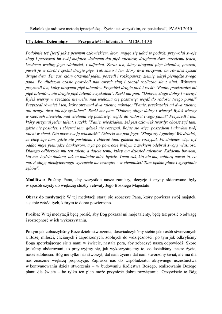 Rekolekcje radiowe metodą ignacjańską „Życie jest wszystkim, co posiadasz”, 9V-6VI 2010 I Tydzień, Dzień piąty Przypowieść o talentach Mt 25, 14-30 Podobnie też [jest] jak z pewnym człowiekiem, który mając się udać w podróż, przywołał swoje sługi i przekazał im swój majątek. Jednemu dał pięć talentów, drugiemu dwa, trzeciemu jeden, każdemu według jego zdolności, i odjechał. Zaraz ten, który otrzymał pięć talentów, poszedł, puścił je w obrót i zyskał drugie pięć. Tak samo i ten, który dwa otrzymał; on również zyskał drugie dwa. Ten zaś, który otrzymał jeden, poszedł i rozkopawszy ziemię, ukrył pieniądze swego pana. Po dłuższym czasie powrócił pan owych sług i zaczął rozliczać się z nimi. Wówczas przyszedł ten, który otrzymał pięć talentów. Przyniósł drugie pięć i rzekł: "Panie, przekazałeś mi pięć talentów, oto drugie pięć talentów zyskałem". Rzekł mu pan: "Dobrze, sługo dobry i wierny! Byłeś wierny w rzeczach niewielu, nad wieloma cię postawię: wejdź do radości twego pana!" Przyszedł również i ten, który otrzymał dwa talenty, mówiąc: "Panie, przekazałeś mi dwa talenty, oto drugie dwa talenty zyskałem". Rzekł mu pan: "Dobrze, sługo dobry i wierny! Byłeś wierny w rzeczach niewielu, nad wieloma cię postawię: wejdź do radości twego pana!" Przyszedł i ten, który otrzymał jeden talent, i rzekł: "Panie, wiedziałem, żeś jest człowiek twardy: chcesz żąć tam, gdzie nie posiałeś, i zbierać tam, gdzieś nie rozsypał. Bojąc się więc, poszedłem i ukryłem twój talent w ziemi. Oto masz swoją własność!" Odrzekł mu pan jego: "Sługo zły i gnuśny! Wiedziałeś, że chcę żąć tam, gdzie nie posiałem, i zbierać tam, gdziem nie rozsypał. Powinieneś więc był oddać moje pieniądze bankierom, a ja po powrocie byłbym z zyskiem odebrał swoją własność. Dlatego odbierzcie mu ten talent, a dajcie temu, który ma dziesięć talentów. Każdemu bowiem, kto ma, będzie dodane, tak że nadmiar mieć będzie. Temu zaś, kto nie ma, zabiorą nawet to, co ma. A sługę nieużytecznego wyrzućcie na zewnątrz - w ciemności! Tam będzie płacz i zgrzytanie zębów". Modlitwa: Prośmy Pana, aby wszystkie nasze zamiary, decyzje i czyny skierowane były w sposób czysty do większej służby i chwały Jego Boskiego Majestatu. Obraz do medytacji: W tej medytacji staraj się zobaczyć Pana, który powierza swój majątek, a siebie wśród tych, którym te dobra powierzono. Prośba: W tej medytacji będę prosić, aby Bóg pokazał mi moje talenty, będę też prosić o odwagę i roztropność w ich wykorzystaniu. Po tym jak zobaczyliśmy Boże dzieło stworzenia, doświadczyliśmy siebie jako osób stworzonych z Bożej miłości, chcianych i zaproszonych, zdolnych do wdzięczności, po tym jak odkryliśmy Boga spotykającego się z nami w świecie, nastała pora, aby zobaczyć naszą odpowiedź. Skoro jesteśmy obdarowani, to przyjrzyjmy się, jak wykorzystujemy to, co dostaliśmy: nasze życie, nasze zdolności. Bóg nie tylko nas stworzył, dał nam życie i dał nam stworzony świat, ale ma dla nas znacznie większą propozycję. Zaprasza nas do współudziału, aktywnego uczestnictwa w kontynuowaniu dzieła stworzenia – w budowaniu Królestwa Bożego, realizowaniu Bożego planu dla świata – bo tylko ten plan może przynieść dobre rozwiązania. Oczywiście to Bóg Rekolekcje radiowe metodą ignacjańską „Życie jest wszystkim, co posiadasz”, 9V-6VI 2010 działa, zbawcze czyny są Jego, ale nasz wkład, nasz udział jest też potrzebny. Kapitał do wykorzystania Dostajemy kapitał, bo wymieniony w Ewangelii talent to po prostu duża suma pieniędzy i mamy ją dobrze wykorzystać. Wymienione w przypowieści talenty są własnością Pana, ale co z nimi zrobimy, zależy od nas. To są pieniądze powierzone, obracając nimi służymy Panu, ale – jak się okazuje – wierność w małej rzeczy jest wynagradzana w sposób wielokrotnie ją przewyższający. Nie jest ważne, czy uda mi się to w stopniu większym czy mniejszym, czy efekt będzie pięcioczy dwukrotny. Ważna jest gotowość do poniesienia pewnego ryzyka, bo każde obracanie pieniędzmi, operacje finansowe – to ryzyko. Bóg jest „Bogiem z nami”, moje życie włączone jest w dzieło stworzenia i zbawienia, które należy doprowadzić do pełni. Mam więc żyć nie tylko dla siebie i z samym sobą, zakopawszy talent w ziemi, czyli pozornie bezpiecznie, ale mam żyć, działając z Bogiem i dla Boga, bo tylko to nadaje sens życiu, a raczej pozwala odkryć sens życia, który w nim jest. Bóg okazuje nam wielkie zaufanie, zapraszając do działania w Jego imieniu. Czy znam moje talenty? Które wykorzystuję, a których nie, jak mogę i powinienem z nich korzystać, by działać dla Boga? Zakończyć rozważanie rozmową z Panem o przebiegu mojej modlitwy. Odmówić „Ojcze nasz”