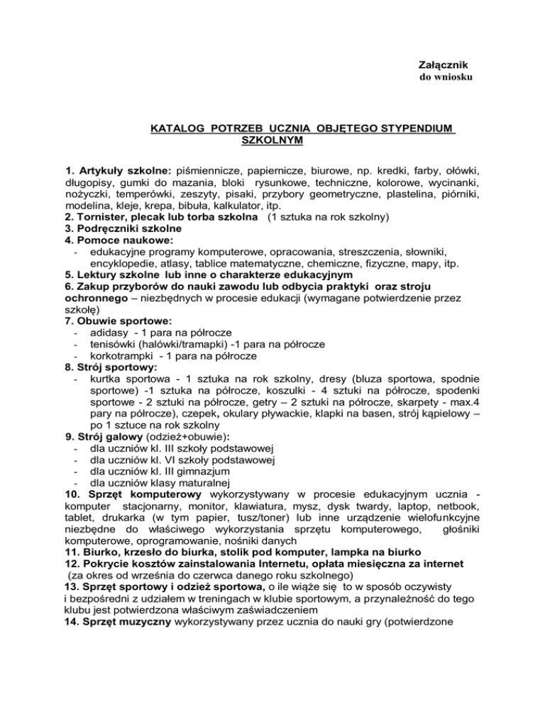 Załącznik do wniosku KATALOG POTRZEB UCZNIA OBJĘTEGO STYPENDIUM SZKOLNYM 1. Artykuły szkolne: piśmiennicze, papiernicze, biurowe, np. kredki, farby, ołówki, długopisy, gumki do mazania, bloki rysunkowe, techniczne, kolorowe, wycinanki, nożyczki, temperówki, zeszyty, pisaki, przybory geometryczne, plastelina, piórniki, modelina, kleje, krepa, bibuła, kalkulator, itp. 2. Tornister, plecak lub torba szkolna (1 sztuka na rok szkolny) 3. Podręczniki szkolne 4. Pomoce naukowe: - edukacyjne programy komputerowe, opracowania, streszczenia, słowniki, encyklopedie, atlasy, tablice matematyczne, chemiczne, fizyczne, mapy, itp. 5. Lektury szkolne lub inne o charakterze edukacyjnym 6. Zakup przyborów do nauki zawodu lub odbycia praktyki oraz stroju ochronnego – niezbędnych w procesie edukacji (wymagane potwierdzenie przez szkołę) 7. Obuwie sportowe: - adidasy - 1 para na półrocze - tenisówki (halówki/tramapki) -1 para na półrocze - korkotrampki - 1 para na półrocze 8. Strój sportowy: - kurtka sportowa - 1 sztuka na rok szkolny, dresy (bluza sportowa, spodnie sportowe) -1 sztuka na półrocze, koszulki - 4 sztuki na półrocze, spodenki sportowe - 2 sztuki na półrocze, getry – 2 sztuki na półrocze, skarpety - max.4 pary na półrocze), czepek, okulary pływackie, klapki na basen, strój kąpielowy – po 1 sztuce na rok szkolny 9. Strój galowy (odzież+obuwie): - dla uczniów kl. III szkoły podstawowej - dla uczniów kl. VI szkoły podstawowej - dla uczniów kl. III gimnazjum - dla uczniów klasy maturalnej 10. Sprzęt komputerowy wykorzystywany w procesie edukacyjnym ucznia komputer stacjonarny, monitor, klawiatura, mysz, dysk twardy, laptop, netbook, tablet, drukarka (w tym papier, tusz/toner) lub inne urządzenie wielofunkcyjne niezbędne do właściwego wykorzystania sprzętu komputerowego, głośniki komputerowe, oprogramowanie, nośniki danych 11. Biurko, krzesło do biurka, stolik pod komputer, lampka na biurko 12. Pokrycie kosztów zainstalowania Internetu, opłata miesięczna za internet (za okres od września do czerwca danego roku szkolnego) 13. Sprzęt sportowy i odzież sportowa, o ile wiąże się to w sposób oczywisty i bezpośredni z udziałem w treningach w klubie sportowym, a przynależność do tego klubu jest potwierdzona właściwym zaświadczeniem 14. Sprzęt muzyczny wykorzystywany przez ucznia do nauki gry (potwierdzone zaświadczeniem ze szkoły o uczęszczaniu ucznia na zajęcia muzyczne) 15. Pokrycie kosztów wyjazdów potwierdzonych biletem wstępu na: - basen, lodowisko, kino, teatr, muzeum, filharmonia, itp. 16. Wydatki związane ze zbiorowymi wyjazdami na wycieczki szkolne o charakterze edukacyjnym, wyjścia do kina, teatru, itp. (należy udokumentować na pisemnym oświadczeniem wystawionego przez szkołę z określeniem kosztu poniesionego przez ucznia) 17. Udział w zajęciach edukacyjnych realizowanych poza szkołą, np. sportowe, muzyczne, językowe, kółka tematyczne, itp. ( potwierdzony dowodem wpłaty) 18. Opłata za dojazd: - pokrycie kosztów dojazdów do szkoły (potwierdzenie biletem) 19. Opłata za internat lub placówkę specjalistyczną (faktura-rachunek) 20. Opłata za posiłki w internacie (faktura-rachunek)