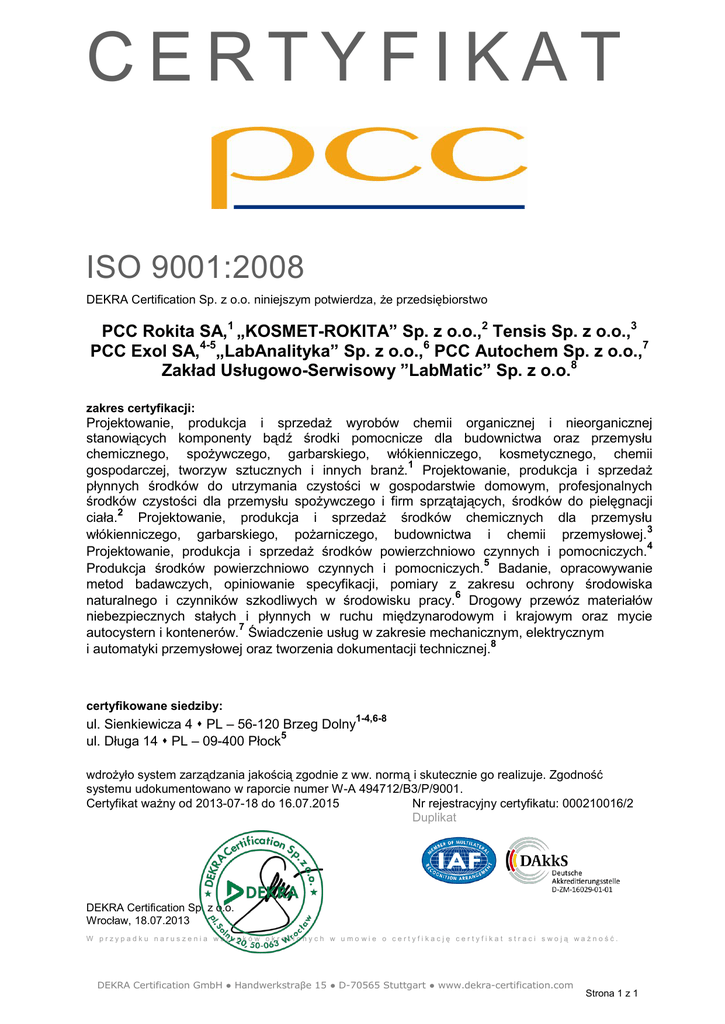 CERTYFIKAT ISO 9001:2008 DEKRA Certification Sp. z o.o. niniejszym potwierdza, że przedsiębiorstwo PCC Rokita SA,1 „KOSMET-ROKITA” Sp. z o.o.,2 Tensis Sp. z o.o.,3 PCC Exol SA,4-5„LabAnalityka” Sp. z o.o.,6 PCC Autochem Sp. z o.o.,7 Zakład Usługowo-Serwisowy ”LabMatic” Sp. z o.o.8 zakres certyfikacji: Projektowanie, produkcja i sprzedaż wyrobów chemii organicznej i nieorganicznej stanowiących komponenty bądź środki pomocnicze dla budownictwa oraz przemysłu chemicznego, spożywczego, garbarskiego, włókienniczego, kosmetycznego, chemii gospodarczej, tworzyw sztucznych i innych branż.1 Projektowanie, produkcja i sprzedaż płynnych środków do utrzymania czystości w gospodarstwie domowym, profesjonalnych środków czystości dla przemysłu spożywczego i firm sprzątających, środków do pielęgnacji ciała.2 Projektowanie, produkcja i sprzedaż środków chemicznych dla przemysłu włókienniczego, garbarskiego, pożarniczego, budownictwa i chemii przemysłowej. 3 Projektowanie, produkcja i sprzedaż środków powierzchniowo czynnych i pomocniczych.4 Produkcja środków powierzchniowo czynnych i pomocniczych.5 Badanie, opracowywanie metod badawczych, opiniowanie specyfikacji, pomiary z zakresu ochrony środowiska naturalnego i czynników szkodliwych w środowisku pracy.6 Drogowy przewóz materiałów niebezpiecznych stałych i płynnych w ruchu międzynarodowym i krajowym oraz mycie autocystern i kontenerów.7 Świadczenie usług w zakresie mechanicznym, elektrycznym i automatyki przemysłowej oraz tworzenia dokumentacji technicznej.8 certyfikowane siedziby: ul. Sienkiewicza 4 PL – 56-120 Brzeg Dolny1-4,6-8 ul. Długa 14 PL – 09-400 Płock5 wdrożyło system zarządzania jakością zgodnie z ww. normą i skutecznie go realizuje. Zgodność systemu udokumentowano w raporcie numer W-A 494712/B3/P/9001. Certyfikat ważny od 2013-07-18 do 16.07.2015 Nr rejestracyjny certyfikatu: 000210016/2 Duplikat DEKRA Certification Sp. z o.o. Wrocław, 18.07.2013 W przypadku naruszenia warunków określonych w umo wie o certyfikację certyfikat straci swoją ważność. DEKRA Certification GmbH ● Handwerkstraβe 15 ● D-70565 Stuttgart ● www.dekra-certification.com Strona 1 z 1