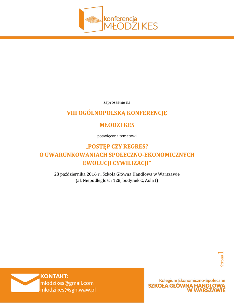 zaproszenie na VIII OGÓLNOPOLSKĄ KONFERENCJĘ MŁODZI KES poświęconą tematowi „POSTĘP CZY REGRES? O UWARUNKOWANIACH SPOŁECZNO-EKONOMICZNYCH EWOLUCJI CYWILIZACJI” Strona 1 28 października 2016 r., Szkoła Główna Handlowa w Warszawie (al. Niepodległości 128, budynek C, Aula I) TEMATYKA KONFERENCJI Szanowni Państwo, Doroczna Ogólnopolska Konferencja Naukowo-Dydaktyczna „Młodzi KES”, organizowana przez doktorantów i młodych pracowników nauki związanych z Kolegium EkonomicznoSpołecznym Szkoły Głównej Handlowej w Warszawie, jest wydarzeniem skierowanym do młodych naukowców, zarówno tych ze stopniem doktora, jak i tych jeszcze do niego aspirujących. Jej nadrzędnymi celami są budowa warsztatu badawczego i dydaktycznego, a także dorobku naukowego uczestników, co odbywa się poprzez prezentację wyników prowadzonych badań, dyskusję nad nimi i ich popularyzację. Tegoroczne spotkanie, które odbędzie się 28 października, zatytułowaliśmy „Postęp czy regres? O uwarunkowaniach społeczno-ekonomicznych ewolucji cywilizacji”. Jego celem będzie poszukiwanie odpowiedzi – w całym spektrum nauk społecznych, ekonomicznych, nauk o polityce i nauk o polityce publicznej – na pytanie jak współczesny świat zachowuje się jako miejsce, w którym spotykają się różne cywilizacje, każda z odmiennymi kulturami, wartościami i systemami społeczno-ekonomicznymi. Punktem wyjścia rozważań jest obserwowalna zmiana relacji między cywilizacjami w stosunku do nieodległej przeszłości, w której dominowała – głównie pod względem rozwoju gospodarczego, naukowego i technicznego – cywilizacja zachodnia. Wydaje się, że dzisiaj relacje między cywilizacjami są bardziej równoprawne, a zależności bardziej złożone. Jednak czy zmiana ta jest permanentna, czy też jest tylko etapem przejściowym, a cywilizacje zamiast dążyć do głębokiej współpracy w gruncie rzeczy w dalszym ciągu dążą do narzucenia swojego modelu innym? Co jest podstawą dokonującej się zmiany? Co warunkuje jej kierunki? Czy wzorce rozwoju gospodarczego i politycznego jednych cywilizacji są bardziej efektywne od innych? Czy możliwe jest przenoszenie wzorców jednych cywilizacji do innych? Czy integracja różnych społeczeństw, nawet w ramach jednej cywilizacji, jest możliwa w długim okresie? Czy możliwa jest koegzystencja reprezentantów różnych cywilizacji w ramach jednego społeczeństwa? Jak w obliczu zachodzących zmian przedstawia się kondycja państwa? Czy ewolucja cywilizacji jest ściśle powiązana z przekształceniami gospodarki, czy też procesy te są od siebie bardziej niezależne niż do niedawna zakładano? Gdzie w zmieniających się realiach znajduje się Europa, a w jej ramach Polska? Strona Z poważaniem, mgr Marta Dobrzycka, dr Jan Misiuna – koordynatorzy Konferencji „Młodzi KES” 2 Zapraszamy do zapoznania się z harmonogramem zgłoszeń i terminem wnoszenia opłaty konferencyjnej, wytycznymi dotyczącymi przedstawianych abstraktów i artykułów, a także warunków publikacji tych ostatnich w przygotowywanej monografii. Przede wszystkim zaś zapraszamy do Kolegium Ekonomiczno-Społecznego SGH. NAJWAŻNIEJSZE TERMINY: do 21 września 2016 r.: przyjmowanie zgłoszeń uczestnictwa czynnego wraz z abstraktami. do 28 września 2016 r.: informacja o przyjęciu lub odrzuceniu abstraktu. do 21 października 2016 r.: uiszczenie opłaty konferencyjnej za czynny udział oraz przesłanie Organizatorom dowodu wpłaty. do 26 października 2016 r.: przyjmowanie zgłoszeń udziału biernego (bezpłatnego) w konferencji. do 13 listopada 2016 r.: przesyłanie spełniających wymogi edytorskie artykułów i podpisanego zeskanowanego oświadczenia autora na adres mlodzikes [at] sgh.waw.pl. OPŁATY: Opłata konferencyjna wynosi 160 zł. Udział bierny jest bezpłatny. Organizatorzy nie zapewniają noclegu. Opłatę konferencyjną prosimy przesyłać na numer konta bankowego Szkoły Głównej Handlowej: 95 1240 1040 1111 0010 5574 7272 Prosimy o wpisanie w tytule przelewu: Konferencja Młodzi KES, opłata konferencyjna, (imię i nazwisko Uczestnika). Osoby zainteresowane otrzymaniem faktury za opłatę konferencyjną prosimy o przesłanie maila na adres: mlodzikes [at] sgh.waw.pl. W tytule maila prosimy napisać: Prośba o fakturę Młodzi KES 2016, nazwisko Uczestnika. W treści maila prosimy podać dane niezbędne do wypełnienia faktury, tj: Jednostkę zgłaszającą uczestnika (np. Szkoła Główna Handlowa w Warszawie Kolegium Ekonomiczno-Społeczne); Dokładny adres (pocztowy) jednostki zgłaszającej; NIP jednostki zgłaszającej; Tytuł wpłaty - opłata konferencyjna za (imię i nazwisko Uczestnika). Imię i nazwisko osoby indywidualnie dokonującej zgłoszenia; Dokładny adres; Strona Tytuł wpłaty - opłata konferencyjna za (imię i nazwisko Uczestnika). 3 lub KONTAKT: Internet: kolegia.sgh.waw.pl/pl/KES/konferencje/Strony/mlodzi_kes.aspx Facebook: facebook.com/konferencjamlodzikes Strona 4 e-mail: [email protected]