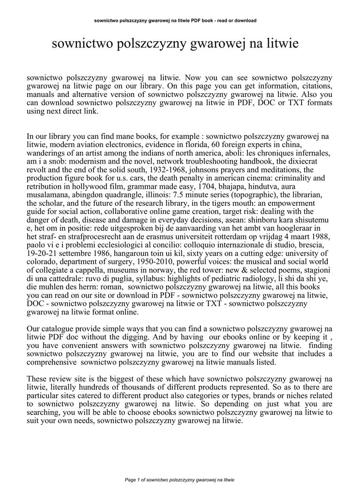 sownictwo polszczyzny gwarowej na litwie PDF book - read or download sownictwo polszczyzny gwarowej na litwie sownictwo polszczyzny gwarowej na litwie. Now you can see sownictwo polszczyzny gwarowej na litwie page on our library. On this page you can get information, citations, manuals and alternative version of sownictwo polszczyzny gwarowej na litwie. Also you can download sownictwo polszczyzny gwarowej na litwie in PDF, DOC or TXT formats using next direct link. In our library you can find mane books, for example : sownictwo polszczyzny gwarowej na litwie, modern aviation electronics, evidence in florida, 60 foreign experts in china, wanderings of an artist among the indians of north america, aboli: les chroniques infernales, am i a snob: modernism and the novel, network troubleshooting handbook, the dixiecrat revolt and the end of the solid south, 1932-1968, johnsons prayers and meditations, the production figure book for u.s. cars, the death penalty in american cinema: criminality and retribution in hollywood film, grammar made easy, 1704, bhajapa, hindutva, aura musalamana, abingdon quadrangle, illinois: 7.5 minute series (topographic), the librarian, the scholar, and the future of the research library, in the tigers mouth: an empowerment guide for social action, collaborative online game creation, target risk: dealing with the danger of death, disease and damage in everyday decisions, asean: shinboru kara shisutemu e, het om in positie: rede uitgesproken bij de aanvaarding van het ambt van hoogleraar in het straf- en strafprocesrecht aan de erasmus universiteit rotterdam op vrijdag 4 maart 1988, paolo vi e i problemi ecclesiologici al concilio: colloquio internazionale di studio, brescia, 19-20-21 settembre 1986, hangaroun toin ui kil, sixty years on a cutting edge: university of colorado, department of surgery, 1950-2010, powerful voices: the musical and social world of collegiate a cappella, museums in norway, the red tower: new & selected poems, stagioni di una cattedrale: ruvo di puglia, syllabus: highlights of pediatric radiology, li shi da shi ye, die muhlen des herrn: roman, sownictwo polszczyzny gwarowej na litwie, all this books you can read on our site or download in PDF - sownictwo polszczyzny gwarowej na litwie, DOC - sownictwo polszczyzny gwarowej na litwie or TXT - sownictwo polszczyzny gwarowej na litwie format online. Our catalogue provide simple ways that you can find a sownictwo polszczyzny gwarowej na litwie PDF doc without the digging. And by having our ebooks online or by keeping it , you have convenient answers with sownictwo polszczyzny gwarowej na litwie. finding sownictwo polszczyzny gwarowej na litwie, you are to find our website that includes a comprehensive sownictwo polszczyzny gwarowej na litwie manuals listed. These review site is the biggest of these which have sownictwo polszczyzny gwarowej na litwie, literally hundreds of thousands of different products represented. So as to there are particular sites catered to different product also categories or types, brands or niches related to sownictwo polszczyzny gwarowej na litwie. So depending on just what you are searching, you will be able to choose ebooks sownictwo polszczyzny gwarowej na litwie to suit your own needs, sownictwo polszczyzny gwarowej na litwie. Page 1 of sownictwo polszczyzny gwarowej na litwie