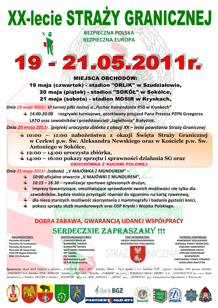 BEZPIECZNA POLSKA BEZPIECZNA EUROPA Dnia 19 maja 2011r. VI turniej piłki nożnej o „Puchar Komendanta PSG w Krynkach” 14:00-20:00 rozgrywki turniejowe, oczekiwany przyjazd Pana Prezesa PZPN Grzegorza LATO oraz zawodników i przedstawicieli „Jagiellonia” Białystok, Dnia 20 maja 2011r. (piątek) uroczysta zbiórka z okazji XX – lecia powstania Straży Granicznej 10:00 – 11:00 nabożeństwa z okazji Święta Straży Granicznej w Cerkwi p.w. Św. Aleksandra Newskiego oraz w Kościele p.w. Św. Antoniego w Sokółce, 12:00 – 14:00 uroczysta zbiórka, 14:00 – 16:00 pokazy sprzętu i sprawności działania SG oraz GROCHÓWKA Z KUCHNI POLOWEJ Dnia 21 maja 2011r. (sobota) „V MAJÓWKA Z MUNDUREM” – 10:00 oficjalne otwarcie „V MAJÓWKI Z MUNDUREM”, 10:15 – 16:30 – rywalizacje sportowe zgłoszonych drużyn, imprezy towarzyszące, umożliwiające sprawdzenie swoich możliwości nie tylko dla zawodników, będzie można przystąpić również do egzaminu na kartę rowerową, dla nieco starszych możliwość skorzystania z mammografu i badania gęstości kości, pokazy sprzętu służb mundurowych oraz OSP Krynki i Wojska Polskiego. DOBRA ZABAWA, GWARANCJĄ UDANEJ WSPÓŁPRACY SERDECZNIE ZAPRASZAMY !!! ORGANIZATORZY: Placówka SG Krynki Placówka SG Szudziałowo Placówka SG Kuźnica Placówka SG Nowy Dwór PGW IPA Region Białystok NSZZ FSG Białystok WSPÓŁORGANIZATORZY: STAROSTA SOKÓLSKI BURMISTRZ SOKÓŁKI BURMISTRZ KRYNEK WÓJT GMINY SZUDZIAŁOWO KPP Sokółka PSP Sokółka Nadleśnictwo Krynki 18 Pułk Rozpoznawczy POD PATRONATEM: URZĘDU MARSZAŁKOWSKIEGO WOJEWÓDZTWA PODLASKIEGO PATRONI HONOROWI: KOMENDANT PODLASKIEGO ODDZIAŁU STRAŻY GRANICZNEJ PODLASKI KOMENDANT WOJEWÓDZKI POLICJI PODLASKI KOMENDANT WOJEWÓDZKI PAŃSTWOWEJ STRAŻY POŻARNEJ JAGIELLONIA BIAŁYSTOK Sponsorzy: Bank BGś Oddział w Sokółce, „PARTNER AGD i RTV” Sokółka, Metal – Fach Spółka z o.o. Sokółka, P.W. „Agrino” Sokółka, PSS Społem Sokółka, „ESKIMOS” S.A. Sokółka, ZPM „SOMLEK” Sokółka, „EKO-GRIL” Sokółka, „FARMER” sp. z o.o., „SOKÓŁKA OKNA i DRZWI” S.A., „CONTRACTUS”sp. z o.o., Bank Spółdzielczy w Sokółce, PKO BP w Sokółce, „SUEMPOL” sp. z o.o., SPH „KRYNKA”, „ARTEZ” sp.j., „OSTROVIA” sp.j., Gospodarstwo Ogrodnicze J. Wilczewski,