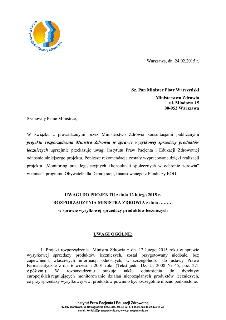 Warszawa, dn. 24.02.2015 r. Sz. Pan Minister Piotr Warczyński Ministerstwo Zdrowia ul. Miodowa 15 00-952 Warszawa Szanowny Panie Ministrze, W związku z prowadzonymi przez Ministerstwo Zdrowia konsultacjami publicznymi projektu rozporządzenia Ministra Zdrowia w sprawie wysyłkowej sprzedaży produktów leczniczych uprzejmie przekazuję uwagi Instytutu Praw Pacjenta i Edukacji Zdrowotnej odnośnie niniejszego projektu. Poniższe rekomendacje zostały wypracowane dzięki realizacji projektu „Monitoring prac legislacyjnych i konsultacji społecznych w ochronie zdrowia” w ramach programu Obywatele dla Demokracji, finansowanego z Funduszy EOG. UWAGI DO PROJEKTU z dnia 12 lutego 2015 r. ROZPORZĄDZENIA MINISTRA ZDROWIA z dnia ……… w sprawie wysyłkowej sprzedaży produktów leczniczych UWAGI OGÓLNE: 1. Projekt rozporządzenia Ministra Zdrowia z dn. 12 lutego 2015 roku w sprawie wysyłkowej sprzedaży produktów leczniczych, został przygotowany niedbale, bez zapewnienia właściwych informacji odnośnych, w szczególności do ustawy Prawo Farmaceutyczne z dn. 6 września 2001 roku (Tekst jedn. Dz. U. 2008 Nr 45, poz. 271 z póź.zm.). W rozporządzeniu brakuje także odniesienia do dyrektyw europejskich regulujących monitorowanie działań niepożądanych produktów leczniczych, co przy sprzedaży wysyłkowej ww. produktów powinno być szczególnie mocno podkreślone. Instytut Praw Pacjenta i Edukacji Zdrowotnej 02-002 Warszawa, ul. Nowogrodzka 62A l. 315, tel. 48 22 474 15 22, fax 48 22 474 15 23, e-mail: [email protected]; www.prawapacjenta.eu 2. Zbyt krótki jest okres vacatio legis, projekt ma wejść w życie w dniu następującym po dniu ogłoszenia. Brak jest usprawiedliwienia dla wprowadzenia tak krótkiego terminu. Nie ma w tym względzie istotnego znaczenia wskazywana w uzasadnieniu projektu okoliczność, że rozporządzenie obejmuje transpozycję przepisów unijnych do polskiego porządku prawnego, tym bardziej, że przepisy rozporządzenia wykonawczego Komisji 699/2014 z dnia 24 czerwca 2014 r. w sprawie projektu wspólnego logo umożliwiającego identyfikację osób oferujących ludności produkty lecznicze w sprzedaży na odległość oraz w sprawie technicznych, elektronicznych i kryptograficznych wymogów umożliwiających sprawdzenie autentyczności wspólnego logo zaczną obowiązywać dopiero od dnia 1 lipca 2015 r., więc nie sposób twierdzić, że obowiązywanie przepisów unijnych umożliwiało wcześniejsze dostosowanie się przez podmioty prowadzące sprzedaż wysyłkową produktów leczniczych do nowych wymogów przewidzianych w projektowanym rozporządzeniu. Nie można się też zgodzić z poglądem, że najważniejsza zmiana przewidziana w projektowanym rozporządzeniu, a dotycząca wymogów dla stron internetowych, za pośrednictwem których produkty są oferowane, usprawiedliwia skrócenie okresu vacatio legis. W istocie jest wręcz odwrotnie. Należy mieć na względzie, że podmioty prowadzące sprzedaż wysyłkową (apteki, punkty apteczne) nie dysponują zasobami i narzędziami umożliwiającymi dostosowanie treści stron internetowych do nowych wymogów w ciągu jednego dnia dzielącego ogłoszenie rozporządzenia od jego wejścia w życie. Wprowadzenie odpowiednich zmian będzie musiało zostać najczęściej powierzone zewnętrznym wykonawcom świadczącym usługi informatyczne, co wiązać się będzie z czasem niezbędnym dla realizacji tego rodzaju zleceń. W konsekwencji w okresie pomiędzy wejściem w życie nowych przepisów a dostosowaniem stron internetowych do wynikających z tych przepisów wymogów, apteki i punkty apteczne nie będą mogły realizować sprzedaży wysyłkowej produktów leczniczych. Należałoby więc uznać, że charakter nowych przepisów, z których wejściem w życie wiąże się konieczność dokonania określonych zmian w odniesieniu do stron internetowych, uzasadniałby raczej wprowadzenie dłuższego niż 14-dniowe vacatio legis, nie zaś drastyczne skracanie tego okresu. 3. Wyłączenie produktów leczniczych weterynaryjnych spod możliwości sprzedaży wysyłkowej budzi co najmniej wątpliwości. Po pierwsze dla wyroku WSA w Warszawie z dnia 25 marca 2013 r., sygn. akt VI SA/Wa 126/13, o którym mowa w uzasadnieniu projektowanego rozporządzenia, nie zostało sporządzone uzasadnienie, toteż nie wiadomo z jakich przyczyn sąd wojewódzki oddalił skargę na decyzję nakazującą zaprzestanie wysyłkowej sprzedaży produktów leczniczych weterynaryjnych. Pogląd wyrażony w uzasadnieniu projektu rozporządzenia, że "orzecznictwo wskazuje, że taka forma [tj. wysyłkowa] jest niedozwolona w świetle całokształtu przepisów ustawy" z powołaniem się na jedno orzeczenie sądu wojewódzkiego, dla którego nie sporządzono uzasadnienia, jest zatem zbyt daleko idący. Wydaje się przy tym, że z treści przepisów art. 68 ust. 2 w zw. z ust. 3 w zw. z art. 71 ust. 1a ustawy - Prawo farmaceutyczne nie wynika w sposób oczywisty, że dopuszczalność sprzedaży wysyłkowej produktów leczniczych nie dotyczy produktów Instytut Praw Pacjenta i Edukacji Zdrowotnej 02-002 Warszawa, ul. Nowogrodzka 62A l. 315, tel. 48 22 474 15 22, fax 48 22 474 15 23, e-mail: [email protected]; www.prawapacjenta.eu weterynaryjnych z zastrzeżeniem, że sprzedaż ta musiałby się ograniczać do aptek oraz punktów aptecznych. Rozstrzyganie tej kwestii na poziomie rozporządzenia nie wydaje się uzasadnione, tym bardziej, że delegacja ustawowa przewidziana w art. 68 ust. 3a cyt. ustawy nie zawiera wyłączenia produktów weterynaryjnych. Również względy natury celowościowej nie sprzeciwiają się prowadzeniu wysyłkowej sprzedaży produktów weterynaryjnych z uwzględnieniem wymogów statutowanych przez projektowane rozporządzenie dla produktów leczniczych przewidzianych dla ludzi. UWAGI SZCZEGÓŁOWE: 1) § 2. p. 2. Formularz zamówienia zawiera: pp. 4) dane dotyczące zamawianego produktu leczniczego: nazwę, dawkę, wie