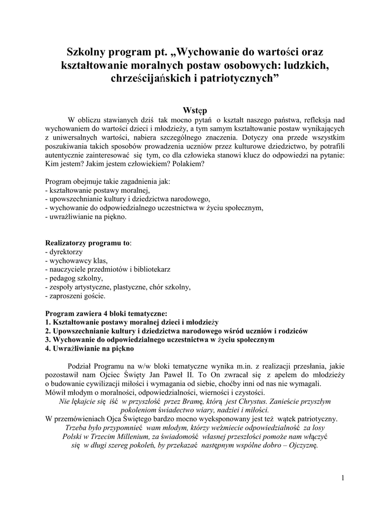 Szkolny program pt. „Wychowanie do wartości oraz kształtowanie moralnych postaw osobowych: ludzkich, chrześcijańskich i patriotycznych” Wstęp W obliczu stawianych dziś tak mocno pytań o kształt naszego państwa, refleksja nad wychowaniem do wartości dzieci i młodzieży, a tym samym kształtowanie postaw wynikających z uniwersalnych wartości, nabiera szczególnego znaczenia. Dotyczy ona przede wszystkim poszukiwania takich sposobów prowadzenia uczniów przez kulturowe dziedzictwo, by potrafili autentycznie zainteresować się tym, co dla człowieka stanowi klucz do odpowiedzi na pytanie: Kim jestem? Jakim jestem człowiekiem? Polakiem? Program obejmuje takie zagadnienia jak: - kształtowanie postawy moralnej, - upowszechnianie kultury i dziedzictwa narodowego, - wychowanie do odpowiedzialnego uczestnictwa w życiu społecznym, - uwrażliwianie na piękno. Realizatorzy programu to: - dyrektorzy - wychowawcy klas, - nauczyciele przedmiotów i bibliotekarz - pedagog szkolny, - zespoły artystyczne, plastyczne, chór szkolny, - zaproszeni goście. Program zawiera 4 bloki tematyczne: 1. Kształtowanie postawy moralnej dzieci i młodzieży 2. Upowszechnianie kultury i dziedzictwa narodowego wśród uczniów i rodziców 3. Wychowanie do odpowiedzialnego uczestnictwa w życiu społecznym 4. Uwrażliwianie na piękno Podział Programu na w/w bloki tematyczne wynika m.in. z realizacji przesłania, jakie pozostawił nam Ojciec Święty Jan Paweł II. To On zwracał się z apelem do młodzieży o budowanie cywilizacji miłości i wymagania od siebie, choćby inni od nas nie wymagali. Mówił młodym o moralności, odpowiedzialności, wierności i czystości. Nie lękajcie się iść w przyszłość przez Bramę, którą jest Chrystus. Zanieście przyszłym pokoleniom świadectwo wiary, nadziei i miłości. W przemówieniach Ojca Świętego bardzo mocno wyeksponowany jest też wątek patriotyczny. Trzeba było przypomnieć wam młodym, którzy weźmiecie odpowiedzialność za losy Polski w Trzecim Millenium, za świadomość własnej przeszłości pomoże nam włączyć się w długi szereg pokoleń, by przekazać następnym wspólne dobro – Ojczyznę. 1 Cele główne Programu - Wychowanie do wartości uniwersalnych i chrześcijańskich. - Kształtowanie dojrzałej postawy moralnej. - Kształtowanie postawy patriotycznej. - Podtrzymywanie i upowszechnianie tradycji narodowej i państwowej. - Upowszechnianie wiedzy dotyczącej polskiej historii, tradycji i zwyczajów. - Popularyzacja wiedzy o przeszłości Polski. - Wzmocnienie identyfikacji z miejscem pochodzenia i jego dziedzictwem kulturowym, budowanie więzi lokalnych. - Kształtowanie dojrzałej postawy społecznej. - Uwrażliwianie na piękno, w tym piękno ziemi ojczystej. Cele szczegółowe Programu - Ukazywanie uniwersalnych wartości chrześcijańskich. - Uczenie szacunku do drugiego człowieka. - Przekazywanie i pielęgnowanie kultury, tradycji i zwyczajów polskich. - Czerpanie z wzorów bohaterów narodowych i polskich świętych. - Uwrażliwianie na piękno polskiej sztuki i kultury ludowej. - Kształcenie takich cech charakteru jak: pracowitość, rzetelność, wytrwałość, uczciwość, pokora, odpowiedzialność, tolerancja. - Uczenie szacunku do własnych rodziców, osób słabszych, chorych, starszych. - Troska o środowisko społeczne, ekologiczne. Główne zasady realizacji Programu - Stworzenie atmosfery zachęcającej uczniów do uczestnictwa w zadaniach programowych. - Podmiotowe traktowanie uczniów i dawanie im dobrego własnego przykładu. - Atrakcyjny sposób przekazywania treści patriotycznych. - Obiektywna i budująca ocena uczniowskich zachowań. - Akceptacja i pochwała pozytywnych zachowań uczniów. - Dostosowanie materiałów programowych do potrzeb i możliwości uczniów. - Informowanie rodziców i zachęcanie do wpółpracy. Sposoby realizacji Programu - Sympozja, konferencje, sesje popularno-naukowe itp. (doskonalenie zawodowe nauczycieli: wewnętrzne i zewnętrzne). - Kursy dla nauczycieli i wychowawców. - Pogadanki. - Popularyzacja książek i czasopism. - Przekazywanie i udostępnianie artykułów, czasopism. - Tworzenie programów artystycznych. - Organizowanie lub uczestniczenie w konkursach poezji, prozy, plastyki. - Opracowanie scenariuszy. - Prelekcje, dyskusje. - Zajęcia artystyczne. 2 - Zebrania z rodzicami i zaproszonymi gośćmi. - Pedagogizacja rodziców. - Spacery i wycieczki. - Ankiety. - Organizowanie uroczystych akademii. - Konkursy dotyczące zbiórki surowców wtórnych. - Działalność charytatywna (np. w ramach szkolnego Kała Caritas lub innych). 1. Kształtowanie postawy moralnej dzieci młodzieży Cele Forma realizacji Realizatorzy Ukazywanie prawdy, uczenie altruizmu, rzetelności, wytrwałości, uczciwości, pokory, wolności. Rozmowy indywidualne. Udział uczniów w uroczystych akademiach. Czytanie odpowiednich lektur Przydział zadań do wykonania i rozliczenie z ich ilości i jakości. wychowawcy klas, poloniści, nauczyciele wychowania fizycznego, bibliotekarz, rodzice, katecheci Uczenie poszanowania mienia własnego i innych osób , przyjmowanie odpowiedzialności za własne działanie uczenie szacunku dla chleba, żywności i pracy ludzi Wychowanie do pracy nad sobą; umiejętności krytycznej samooceny, wyzwalania się z egoizmu, stawiania siebie w prawdzie. Uczenie szacunku do drugiego człowieka; do rodziców, osób starszych, samotnych, bezdomnych. Uczenie koleżeńskości i przyjaźni, świadomości, że akceptacja i oparcie w drugim człowieku jest jedną z głównych potrzeb ludzkich Troska o środowisko społeczne, ekologiczne, Pogadanka nt. szanowania rzeczy osobistych i cudzych własności Prelekcja, lekcje nt. poszanowania chleba i wytworów pracy innych ludzi. wychowawcy klas, poloniści, bibliotekarz, rodzice, katecheci Rozmowy, praca w grupach, Pogadanka Wystawianie sobie oceny z zachowania Akcja dzielenia się swoim z innymi wychowawcy klas, ws