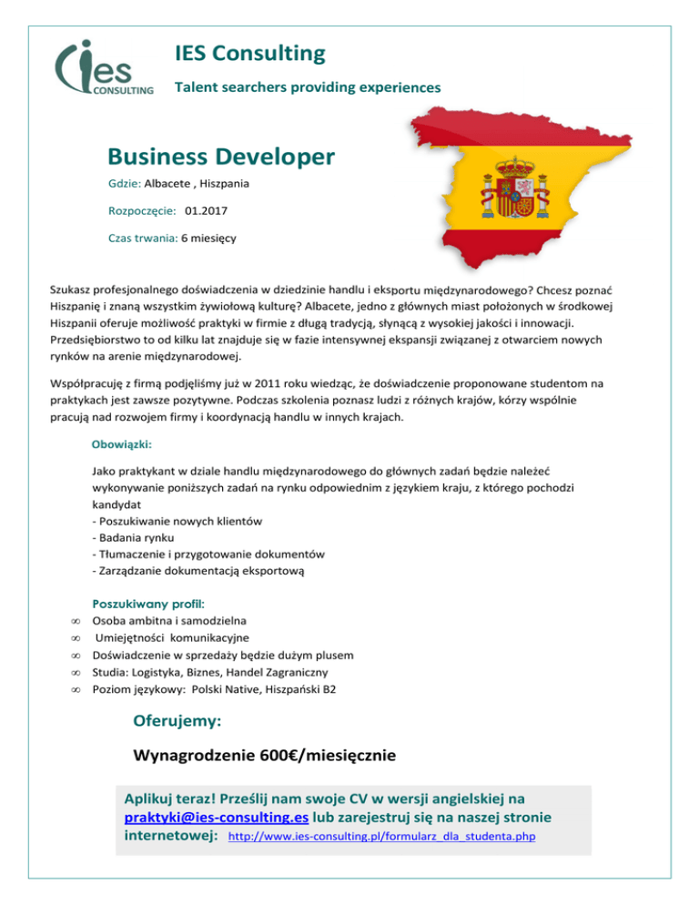 IES Consulting Talent searchers providing experiences Business Developer Gdzie: Albacete , Hiszpania Rozpoczęcie: 01.2017 Czas trwania: 6 miesięcy Szukasz profesjonalnego doświadczenia w dziedzinie handlu i eksportu międzynarodowego? Chcesz poznać Hiszpanię i znaną wszystkim żywiołową kulturę? Albacete, jedno z głównych miast położonych w środkowej Hiszpanii oferuje możliwość praktyki w firmie z długą tradycją, słynącą z wysokiej jakości i innowacji. Przedsiębiorstwo to od kilku lat znajduje się w fazie intensywnej ekspansji związanej z otwarciem nowych rynków na arenie międzynarodowej. Współpracuję z firmą podjęliśmy już w 2011 roku wiedząc, że doświadczenie proponowane studentom na praktykach jest zawsze pozytywne. Podczas szkolenia poznasz ludzi z różnych krajów, kórzy wspólnie pracują nad rozwojem firmy i koordynacją handlu w innych krajach. Obowiązki: Jako praktykant w dziale handlu międzynarodowego do głównych zadań będzie należeć wykonywanie poniższych zadań na rynku odpowiednim z językiem kraju, z którego pochodzi kandydat - Poszukiwanie nowych klientów - Badania rynku - Tłumaczenie i przygotowanie dokumentów - Zarządzanie dokumentacją eksportową • • • • • Poszukiwany profil: Osoba ambitna i samodzielna Umiejętności komunikacyjne Doświadczenie w sprzedaży będzie dużym plusem Studia: Logistyka, Biznes, Handel Zagraniczny Poziom językowy: Polski Native, Hiszpański B2 Oferujemy: Wynagrodzenie 600€/miesięcznie Aplikuj teraz! Prześlij nam swoje CV w wersji angielskiej na [email protected] lub zarejestruj się na naszej stronie internetowej: http://www.ies-consulting.pl/formularz_dla_studenta.php