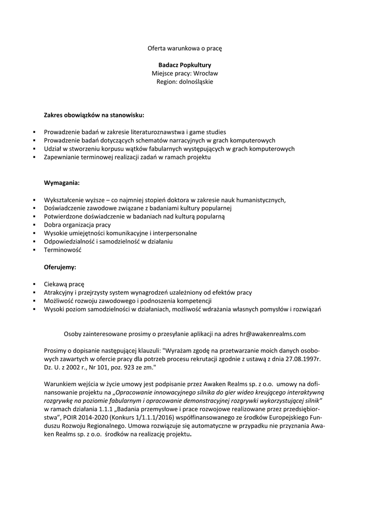 Oferta warunkowa o pracę Badacz Popkultury Miejsce pracy: Wrocław Region: dolnośląskie Zakres obowiązków na stanowisku: Prowadzenie badań w zakresie literaturoznawstwa i game studies Prowadzenie badań dotyczących schematów narracyjnych w grach komputerowych Udział w stworzeniu korpusu wątków fabularnych występujących w grach komputerowych Zapewnianie terminowej realizacji zadań w ramach projektu Wymagania: Wykształcenie wyższe – co najmniej stopień doktora w zakresie nauk humanistycznych, Doświadczenie zawodowe związane z badaniami kultury popularnej Potwierdzone doświadczenie w badaniach nad kulturą popularną Dobra organizacja pracy Wysokie umiejętności komunikacyjne i interpersonalne Odpowiedzialność i samodzielność w działaniu Terminowość Oferujemy: Ciekawą pracę Atrakcyjny i przejrzysty system wynagrodzeń uzależniony od efektów pracy Możliwość rozwoju zawodowego i podnoszenia kompetencji Wysoki poziom samodzielności w działaniach, możliwość wdrażania własnych pomysłów i rozwiązań Osoby zainteresowane prosimy o przesyłanie aplikacji na adres [email protected] Prosimy o dopisanie następującej klauzuli: "Wyrażam zgodę na przetwarzanie moich danych osobowych zawartych w ofercie pracy dla potrzeb procesu rekrutacji zgodnie z ustawą z dnia 27.08.1997r. Dz. U. z 2002 r., Nr 101, poz. 923 ze zm." Warunkiem wejścia w życie umowy jest podpisanie przez Awaken Realms sp. z o.o. umowy na dofinansowanie projektu na „Opracowanie innowacyjnego silnika do gier wideo kreującego interaktywną rozgrywkę na poziomie fabularnym i opracowanie demonstracyjnej rozgrywki wykorzystującej silnik” w ramach działania 1.1.1 „Badania przemysłowe i prace rozwojowe realizowane przez przedsiębiorstwa”, POIR 2014-2020 (Konkurs 1/1.1.1/2016) współfinansowanego ze środków Europejskiego Funduszu Rozwoju Regionalnego. Umowa rozwiązuje się automatyczne w przypadku nie przyznania Awaken Realms sp. z o.o. środków na realizację projektu.