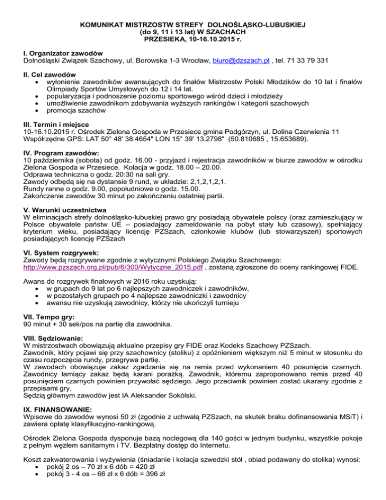 KOMUNIKAT MISTRZOSTW STREFY DOLNOŚLĄSKO-LUBUSKIEJ (do 9, 11 i 13 lat) W SZACHACH PRZESIEKA, 10-16.10.2015 r. I. Organizator zawodów Dolnośląski Związek Szachowy, ul. Borowska 1-3 Wrocław, [email protected] , tel. 71 33 79 331 II. Cel zawodów wyłonienie zawodników awansujących do finałów Mistrzostw Polski Młodzików do 10 lat i finałów Olimpiady Sportów Umysłowych do 12 i 14 lat. popularyzacja i podnoszenie poziomu sportowego wśród dzieci i młodzieży umożliwienie zawodnikom zdobywania wyższych rankingów i kategorii szachowych promocja szachów III. Termin i miejsce 10-16.10.2015 r. Ośrodek Zielona Gospoda w Przesiece gmina Podgórzyn, ul. Dolina Czerwienia 11 Współrzędne GPS: LAT 50° 48' 38.4654" LON 15° 39' 13.2798" (50.810685 , 15.653689). IV. Program zawodów: 10 października (sobota) od godz. 16.00 - przyjazd i rejestracja zawodników w biurze zawodów w ośrodku Zielona Gospoda w Przesiece. Kolacja w godz. 18.00 – 20.00. Odprawa techniczna o godz. 20:30 na sali gry. Zawody odbędą się na dystansie 9 rund, w układzie: 2,1,2,1,2,1. Rundy ranne o godz. 9.00, popołudniowe o godz. 15.00. Zakończenie zawodów 30 minut po zakończeniu ostatniej partii. V. Warunki uczestnictwa W eliminacjach strefy dolnośląsko-lubuskiej prawo gry posiadają obywatele polscy (oraz zamieszkujący w Polsce obywatele państw UE – posiadający zameldowanie na pobyt stały lub czasowy), spełniający kryterium wieku, posiadający licencję PZSzach, członkowie klubów (lub stowarzyszeń) sportowych posiadających licencję PZSzach VI. System rozgrywek: Zawody będą rozgrywane zgodnie z wytycznymi Polskiego Związku Szachowego: http://www.pzszach.org.pl/pub/6/300/Wytyczne_2015.pdf , zostaną zgłoszone do oceny rankingowej FIDE. Awans do rozgrywek finałowych w 2016 roku uzyskują: w grupach do 9 lat po 6 najlepszych zawodniczek i zawodników, w pozostałych grupach po 4 najlepsze zawodniczki i zawodnicy awansu nie uzyskują zawodnicy, którzy nie ukończyli turnieju VII. Tempo gry: 90 minut + 30 sek/pos na partię dla zawodnika. VIII. Sędziowanie: W mistrzostwach obowiązują aktualne przepisy gry FIDE oraz Kodeks Szachowy PZSzach. Zawodnik, który pojawi się przy szachownicy (stoliku) z opóźnieniem większym niż 5 minut w stosunku do czasu rozpoczęcia rundy, przegrywa partię. W zawodach obowiązuje zakaz zgadzania się na remis przed wykonaniem 40 posunięcia czarnych. Zawodnicy łamiący zakaz będą karani porażką. Zawodnik, któremu zaproponowano remis przed 40 posunięciem czarnych powinien przywołać sędziego. Jego przeciwnik powinien zostać ukarany zgodnie z przepisami gry. Sędzią głównym zawodów jest IA Aleksander Sokólski. IX. FINANSOWANIE: Wpisowe do zawodów wynosi 50 zł (zgodnie z uchwałą PZSzach, na skutek braku dofinansowania MSiT) i zawiera opłatę klasyfikacyjno-rankingową. Ośrodek Zielona Gospoda dysponuje bazą noclegową dla 140 gości w jednym budynku, wszystkie pokoje z pełnym węzłem sanitarnym i TV. Bezpłatny dostęp do Internetu. Koszt zakwaterowania i wyżywienia (śniadanie i kolacja szwedzki stół , obiad podawany do stolika) wynosi: pokój 2 os – 70 zł x 6 dób = 420 zł pokój 3 - 4 os – 66 zł x 6 dób = 396 zł pokój 1 osobowy – 100 zł x 6 dób = 600 zł Organizator dysponuje ograniczoną ilością miejsc w pokojach 1-osobowych. O przydziale poszczególnych rodzajów pokojów decyduje kolejność zgłoszeń. Koszty wpisowego, zakwaterowania i wyżywienia opłacić można przelewem na konto: Dolnośląski Związek Szachowy, 50-529 Wrocław ul. Borowska 1-3 Meritum Bank, Nr konta bankowego: 47 1300 0000 2076 7154 4490 0001 Wpłaty na miejscu po indywidualnych uzgodnieniach. X. Zgłoszenia: Zgłoszenie udziału zawodnika prosimy przesyłać wyłącznie drogą elektroniczną na adres: [email protected] do dnia 07.10.2015. Zgłoszenie powinno zawierać informacje na temat zakwaterowania i wyżywienia zawodników oraz opiekunów. XI. Nagrody: Puchary dla trzech najlepszych graczy w każdej z grup. Dyplomy i nagrody rzeczowe dla osób awansujących do rozgrywek finałowych w każdej grupie wiekowej. XII. Inne sprawy organizacyjne Zawodnicy startujący w turnieju przebywają pod opieką opiekunów przez cały czas trwania zawodów. Za stan zdrowia i ubezpieczenie zawodników odpowiadają kluby i jednostki delegujące. Ośrodek Zielona Gospoda nie zabezpiecza własnej opieki medycznej. Na terenie Przesieki i gminy Podgórzyn znajdują się placówki opieki medycznej. Na terenie ośrodka znajdują się: boisko do piłki siatkowej, koszykowej i mini piłki nożnej sala bilardowa i ping-pongowa, automaty rozrywkowe, miejsce na ognisko, grill, zadaszona wiata grillowa, itp. Odpłatnie można skorzystać z profesjonalnej siłowni i sauny. Ośrodek jest po kapitalnym remoncie. Posiada nowoczesną dużą kuchnię, stołówkę, salę bankietową, sieć internetową, repeatery GSM, wewnętrzną telewizję kablową itp. Dom Wczasowy "Zielona Gospoda" leży w malowniczej Dolinie Czerwienia, tuż nad górskim potokiem o tej właśnie nazwie. Nieopodal budynku przebiegają szlaki turystyczne prowadzące do Zamku Chojnik i w kierunku Przełęczy Karkonoskiej, która jest środkiem geograficznym Karkonoszy, tym samym wygodnie właśnie w tym miejscu rozpoczynać wędrówki górskie. Dojazd Autobusem MZK Jelenia Góra: Z Jeleniej Góry do Przesieki najłatwiej dojechać linią miejską MZK Jelenia Góra nr 9 z dworca Głównego PKP. Następnie na przystanku "Apteka 'Pod Koroną" należy przesiąść się w linię nr 18 lub nr 4 i nią dojechać do Przesieki do przystanku: "Przesieka Sklep". Ostateczna interpretacja komunikatu należy do organizatora. Organizator zastrzega sobie możliwość wprowadzenia zmian technicznych. Prezes DZSzach Dominik Kulaś Wiceprezes DZSzach ds. Młodzieżowych Robert Korpalski