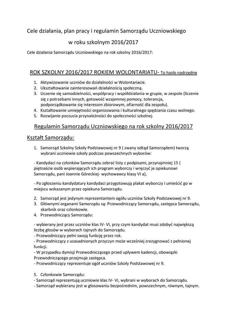 Cele działania, plan pracy i regulamin Samorządu Uczniowskiego w roku szkolnym 2016/2017 Cele działania Samorządu Uczniowskiego na rok szkolny 2016/2017: ROK SZKOLNY 2016/2017 ROKIEM WOLONTARIATU- To hasło nadrzędne 1. Aktywizowanie uczniów do działalności w Wolontariacie. 2. Ukształtowanie zainteresowań działalnością społeczną. 3. Uczenie się samodzielności, współpracy i współdziałania w grupie, w zespole (liczenie się z potrzebami innych, gotowość wzajemnej pomocy, tolerancja, podporządkowanie się interesom zbiorowym, ofiarność dla zespołu). 4. Kształtowanie umiejętności organizowania i kulturalnego spędzania czasu wolnego. 5. Rozwijanie poczucia przynależności do społeczności szkolnej. Regulamin Samorządu Uczniowskiego na rok szkolny 2016/2017 Kształt Samorządu: 1. Samorząd Szkolny Szkoły Podstawowej nr 9 ( zwany odtąd Samorządem) tworzą wybrani uczniowie szkoły podczas powszechnych wyborów: - Kandydaci na członków Samorządu zebrać listy z podpisami, przynajmniej 15 ( piętnaście osób wspierających ich program wyborczy i wręczyć je opiekunowi Samorządu, pani Joannie Góreckiej- wychowawcy klasy VI a), - Po zgłoszeniu kandydatury kandydaci przygotowują plakat wyborczy i umieścić go w miejscu wskazanym przez opiekuna Samorządu. 2. Samorząd jest jedynym reprezentantem ogółu uczniów Szkoły Podstawowej nr 9. 3. Głównymi organami Samorządu są: Przewodniczący Samorządu, zastępca Samorządu, skarbnik oraz członkowie. 4. Przewodniczący Samorządu: - wybierany jest przez uczniów klas IV- VI, przy czym kandydat musi zdobyć największą liczbę głosów w wyborach tajnych do Samorządu. - Przewodniczący pełni swoją funkcję przez rok. - Przewodniczący z uzasadnionych przyczyn może wcześniej zrezygnować z pełnionej funkcji. - W przypadku dymisji Przewodniczącego przed upływem kadencji, obowiązki Przewodniczącego przejmuje zastępca. - Przewodniczący reprezentuje ogół uczniów Szkoły Podstawowej nr 9. 5. Członkowie Samorządu: - Samorząd reprezentują uczniowie klas IV- VI, wybrani w wyborach do Samorządu. - Samorząd wybierany jest w głosowaniu bezpośrednim, powszechnym, równym, tajnym. - Wybory Samorządu odbędą się 26 września 2016 r. - Nad poprawnością wyborów czuwa opiekun Samorządu. - Członkami Samorządu są tylko uczniowie Szkoły Podstawowej nr 9. W momencie ukończenia szkoły uczniowie nie mogą pełnić funkcji samorządowych tejże szkoły. - Samorząd podejmuje decyzje większością głosów. - Na pierwszym posiedzeniu przyjęty jest podział obowiązków wszystkich członków oraz plan działania na rok szkolny 2016/2017. 6. Opiekun Samorządu: - Opiekun ma prawo uczestniczyć w zebraniach Samorządu. - Opiekun pełni funkcję doradczą. - Opiekun w uzasadnionych przypadkach może zrezygnować z pełnionej funkcji. - Opiekun Samorządu jest jedyną osobą, która może zwolnić uczniów z zajęć lekcyjnych w celach działalności Samorządu. 7. Zebrania Samorządu: - Spotkania Samorządu odbywają się raz w miesiącu, w uzasadnionych sytuacjach można zwołać zebranie niezależnie od podanej wcześniej daty spotkania. 8. Sposób dokumentowania działalności Samorządu: - Członkowie zdają sprawozdanie ze swojej działalności opiekunowi Samorządu raz w okresie ( na koniec pierwszego i drugiego okresu). 9. Postanowienia inne: - Samorząd może przedstawić Dyrektorowi Szkoły lub Radzie Pedagogicznej opinie i wnioski w sprawach naruszania podstawowych praw ucznia. 10. Postanowienia końcowe: - Wszyscy uczniowie klas IV-VI zobowiązani są do zapoznania się z regulaminem Samorządu. - Regulamin jest dostępny dla wszystkich uczniów. - Każdy uczeń ma prawo zgłaszania swoich innowacji, pomysłów podczas zebrań Samorządu. - Regulamin został opracowany przez członków Samorządu i opiekuna. Opiekun Samorządu: Joanna Górecka Plan pracy Samorządu Uczniowskiego w Szkole Podstawowej Nr 9 w Gorzowie Wlkp. Rok Szkolny 2016/2017 WRZESIEŃ: - Kampania wyborcza, ustalenie terminu wyborów. - Zapoznanie uczniów z ich prawami na lekcjach wychowawczych. - Akcja Ogólnoszkolna - Sprzątanie Świata. - organizacja Dnia Chłopaka. - Przedstawienie uczniom założeń Wolontariatu - akcja Pola Nadziei na rzecz Gorzowskiego Hospicjum. PAŹDZIERNIK: - Udział w przygotowaniach Dnia Nauczyciela. - Przygotowanie upominków dla pierwszoklasistów. - Aktualizacja gazetki i strony internetowej. - Jarmark jesienny. LISTOPAD: - Organizacja dyskoteki andrzejkowej. - Organizacja Szlachetnej Paczki. - Wykonanie gazetki okolicznościowej z okazji Święta Niepodległości. GRUDZIEŃ: - Pomoc w organizacji akcji- „ Mikołajkowe szaleństwa”- wspólne zdjęcie mikołajów. - Konkurs na dekorację świąteczną - Jarmark świąteczny. - Udział w akcji podsumowującej Szlachetną Paczkę. - Świąteczne przeboje, koncert kolęd z okazji świąt Bożego Narodzenia. - Wizyta w Domu Pomocy Społecznej i w Hospicjum im. św. Kamila. STYCZEŃ: - Niesiemy pomoc zwierzętom z gorzowskiego schroniska - zbiórka karmy oraz innych rzeczy potrzebnych zwierzakom. - Udział uczniów akcji WOŚP-u. - Dyskoteka Karnawałowa. - Podsumowanie pierwszego okresu - apel podsumowujący. LUTY: -Zorganizowanie poczty walentynkowej. - Aktualizacja strony internetowej. - Wizyta uczniów w schronisku dla zwierząt. - Dzień Języka Polskiego. MARZEC: - Pomoc w organizacji Dnia Kobiet, wykonanie gazetki szkolnej, przygotowanie życzeń. - Szkolny Konkurs Talentów. KWIECIEŃ: - Tydzień - ekologiczny - Ziemia czysta i radosna. - Jarmark świąteczny, konkurs na dekorację klas. - Odwiedziny w Hospicjum i w Domu Pomocy Społecznej. - Zredagowanie gazetki z okazji Wielkanocy. MAJ: - Organizacja DNIA DOBRYCH UCZYNKÓW - 15 maja 2017. - Aktualizacja strony internetowej. - Klasowe spotkania z okazji Dnia Matki. - Organizacja „ nocy filmowej” CZERWIEC: - Udział w przygotowaniach Dnia Dziecka. - Podsumowanie pracy Sam