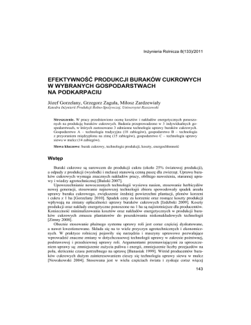 Inżynieria Rolnicza 8(133)/2011 EFEKTYWNOŚĆ PRODUKCJI BURAKÓW CUKROWYCH W WYBRANYCH GOSPODARSTWACH NA PODKARPACIU Józef Gorzelany, Grzegorz Zaguła, Miłosz Zardzewiały Katedra Inżynierii Produkcji Rolno-Spożywczej, Uniwersytet Rzeszowski Streszczenie. W pracy przedstawiono ocenę kosztów i nakładów energetycznych ponoszonych na produkcję buraków cukrowych. Badania przeprowadzono w 3 indywidualnych gospodarstwach, w których zastosowano 3 odmienne technologie uprawy buraków cukrowych. Gospodarstwo A – technologia tradycyjna (18 zabiegów), gospodarstwo B – technologia z przyoraniem międzyplonu na zimę (15 zabiegów), gospodarstwo C – technologia uprawy siewu w mulcz (14 zabiegów). Słowa kluczowe: burak cukrowy, technologie produkcji, koszty, energochłonność Wstęp Buraki cukrowe są surowcem do produkcji cukru (około 25% światowej produkcji), a odpady z produkcji (wysłodki i melasa) stanowią cenną paszę dla zwierząt. Uprawa buraków cukrowych wymaga znacznych nakładów pracy, obfitego nawożenia, starannej uprawy i wiedzy agrotechnicznej [Bański 2007]. Upowszechnianie nowoczesnych technologii wysiewu nasion, stosowanie herbicydów nowej generacji, stosowanie najnowszej technologii zbioru spowodowały spadek areału uprawy buraka cukrowego, zwiększenie średniej powierzchni plantacji, plonów korzeni i cukru z 1 ha [Gorzelany 2010]. Spadek ceny za korzenie oraz rosnące koszty produkcji wpływają na zmiany opłacalności uprawy buraków cukrowych [Izdebski 2009]. Koszty produkcji oraz nakłady energetyczne ponoszone na 1 ha są najistotniejsze dla producentów. Konieczność minimalizowania kosztów oraz nakładów energetycznych w produkcji buraków cukrowych zmusza plantatorów do poszukiwania niskonakładowych technologii [Zimny 2008]. Obecnie stosowanie płużnego systemu uprawy roli jest coraz częściej dyskutowane, a nawet kwestionowane. Składa się na to wiele przyczyn agrotechnicznych i ekonomicznych. W praktyce rolniczej pojawiły się narzędzia i maszyny uprawowe pozwalające wprowadzić znaczne zmiany w dotychczasowej technologii uprawy w zakresie pożniwnej, podstawowej i przedsiewnej uprawy roli. Argumentami przemawiającymi za uproszczeniem uprawy są: zmniejszenie zużycia paliwa i energii, zmniejszenie liczby przejazdów na polu, skrócenie czasu potrzebnego na uprawę [Banasiak 1999]. Wśród producentów buraków cukrowych dużym zainteresowaniem cieszy się technologia uprawy siewu w mulcz [Nowakowski 2004]. Stosowana jest w wielu częściach świata i zyskuje coraz więcej 143 Józef Gorzelany, Grzegorz Zaguła, Miłosz Zardzewiały zwolenników [Dobek 2005]. Technologia siewu w mulcz zwana inaczej konserwującą pozwala znacznie zmniejszyć nakłady finansowe poprzez eliminacje orki z zabiegów agrotechnicznych przy jednoczesnym zasianiu buraków w odpowiednio przygotowane pole [Gorzelany 2010]. W tym celu należy pozostawić do wiosny na polu resztki słomy ze zbieranego przedplonu lub międzyplonu, który został wysiany jesienią po zbiorze przedplonu [Zwierkowski 2007]. Cel pracy Celem pracy była ocena kosztów i nakładów energetycznych wytypowanych technologii produkcji buraków cukrowych stosowanych w gospodarstwach indywidualnych na Podkarpaciu. Zakres i metodyka badań Badania przeprowadzono w 3 indywidualnych gospodarstwach w województwie podkarpackim. Gospodarstwo „A” położone jest w gminie Przeworsk i zajmuje łącznie obszar 40 ha. Burak cukrowy uprawiany był na jednej plantacji, w strukturze zasiewów gospodarstwa stanowił 10 ha (25%). W gospodarstwie zastosowano technologię tradycyjną uprawy buraków cukrowych. Średni plon buraków cukrowych w roku 2009 wynosił 73 t·ha-1. Gleby klasy II, III a i III b. Gospodarstwo „B” położone jest w gminie Przemyśl i zajmuje łącznie obszar 100 ha. Burak cukrowy w strukturze zasiewów gospodarstwa zajmował 15 ha (15%) – jedna plantacja. W gospodarstwie zastosowano technologię przyoranie międzyplonu z gorczycy w okresie późnej jesieni. Średni plon buraków cukrowych w roku 2009 wynosił 72 t·ha-1. Gospodarstwo posiada gleby klasy I, II, III a i III b. Gospodarstwo „C” o powierzchni 350 ha położone jest w gminie Cieszanów. Burak cukrowy uprawiany był na jednej plantacji, w strukturze zasiewów gospodarstwa zajmował 50 ha (14%). W gospodarstwie tym zastosowano technologię siewu w mulcz z międzyplonu gorczycy. Średni plon buraków cukrowych w roku 2009 wynosił 65 t·ha-1. Gleby klasy II, III a, III b, IV a, IV b. W technologii tradycyjnej (18 zabiegów) oraz w technologii przyoraniem międzyplonu gorczycy (15 zabiegów) wykonano najbardziej energochłonny zabieg procesu produkcji buraków cukrowych - orkę przedzimową. W technologii z przyoraniem międzyplonu gorczycy wykonano w sumie 14 zabiegów bez orki przedzimowej. Na podstawie prowadzonych kart technologicznych produkcji buraków cukrowych w latach 2008/2009 oraz danych uzyskanych z gospodarstwa, literatury oraz obliczonych kosztów i nakładów energetycznych pracy maszyn dokonano oceny wybranych technologii pod kątem kosztów i nakładów energetycznych na paliwo i robociznę, kosztów materiałowych i eksploatacji maszyn, nakładów energetycznych, opłacalności , efektywności ekonomicznej i energetycznej uprawy buraków cukrowych. Ocenę kosztów pracy maszyn przeprowadzono w oparciu o metodykę opracowaną przez IBMER [Muzalewski 2006]. W rachunku kosztów uwzględnione zostały aktualne ceny i dane eksploatacyjno-ekonomiczne ciągników i maszyn rolniczych z 2007 i 2008 roku (tab. 1, 2, 3). 144 Efektywność produkcji buraków... Tabela 1. Ceny i wybrane dane techniczno-eksploatacyjne maszyn i ciągników wykorzystywanych w produkcji buraków cukrowych- gospodarstwo „A” (technologia tradycyjna) Table 1. Prices and selected technical and operating data of machines and tractors used in the process of sugar beet production – agricultural farm “A” (traditional tech