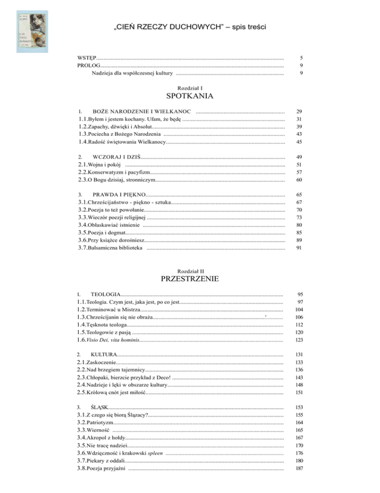 „CIEŃ RZECZY DUCHOWYCH” – spis treści WSTĘP.................................................................................................................................. PROLOG............................................................................................................................... Nadzieja dla współczesnej kultury ........................................................................... 5 9 9 Rozdział I SPOTKANIA 1. BOŻE NARODZENIE I WIELKANOC ............................................................. 1.1.Byłem i jestem kochany. Ufam, że będę ....................................................................... 1.2.Zapachy, dźwięki i Absolut............................................................................................ 1.3.Pociecha z Bożego Narodzenia .................................................................................... 1.4.Radość świętowania Wielkanocy.................................................................................. 29 31 39 43 45 2. WCZORAJ I DZIŚ.................................................................................................... 2.1.Wojna i pokój ............................................................................................................... 2.2.Konserwatyzm i pacyfizm.............................................................................................. 2.3.O Bogu dzisiaj, stronniczym.......................................................................................... 49 51 57 60 3. 65 67 70 73 80 85 89 91 PRAWDA I PIĘKNO................................................................................................. 3.1.Chrześcijaństwo - piękno - sztuka............................................................................... 3.2.Poezja to też powołanie.................................................................................................. 3.3.Wieczór poezji religijnej ................................................................................................ 3.4.Obłaskawiać istnienie ................................................................................................... 3.5.Poezja i dogmat............................................................................................................... 3.6.Przy książce dorośniesz.................................................................................................. 3.7.Balsamiczna biblioteka ................................................................................................ Rozdział II PRZESTRZENIE 1. TEOLOGIA................................................................................................................. 1.1.Teologia. Czym jest, jaka jest, po co jest........................................................................ 1.2.Terminować u Mistrza................................................................................................... 1.3.Chrześcijanin się nie obraża.............................................................................'............ 1.4.Tęsknota teologa............................................................................................................ 1.5.Teologowie z pasją ......................................................................................................... 1.6.Visio Dei, vita hominis.................................................................................................... 2. KULTURA................................................................................................................... 2.1.Zaskoczenie.................................................................................................................... 2.2.Nad brzegiem tajemnicy................................................................................................ 2.3.Chłopaki, bierzcie przykład z Deco! ............................................................................. 2.4.Nadzieje i lęki w obszarze kultury................................................................................ 2.5.Królową cnót jest miłość............................................................................................... 3. ŚLĄSK.......................................................................................................................... 3.1.Z czego się biorą Ślązacy?.............................................................................................. 3.2.Patriotyzm...................................................................................................................... 3.3.Wierność ....................................................................................................................... 3.4.Akropol z hołdy.............................................................................................................. 3.5.Nie tracę nadziei............................................................................................................. 3.6.Wdzięczność i krakowski spleen .................................................................................. 3.7.Piekary z oddali.............................................................................................................. 3.8.Poezja przyjaźni ............................................................................................................ 95 97 104 106 112 120 123 131 133 136 143 148 151 153 155 164 165 167 170 176 180 187 3.9.Siena. O Poecie, o Śląsku, o nas..................................................................................... 3.10.O lubelskich cnotach, szlifowaniu diamentów i o powrocie na Śląsk....................... 3.11.Kwestionariusz Prousta................................................................................................ 192 197 209 Rozdział III NAJWIĘKSI 1. CZESŁAW MIŁOSZ .............................................................................................