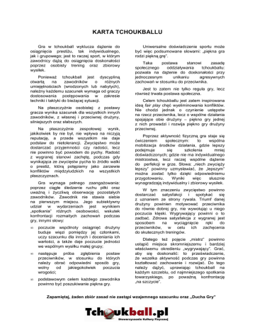 KARTA TCHOUKBALLU Gra w tchoukball wyklucza dążenie do osiągnięcia prestiżu, tak indywidualnego, jak i grupowego; jest to raczej sport, w którym zawodnicy dążą do osiągnięcia doskonałości poprzez osobisty trening oraz zbiorowy wysiłek. Ponieważ tchoukball jest dyscypliną otwartą na zawodników o różnych umiejętnościach (wrodzonych lub nabytych), należny każdemu szacunek wymaga od graczy dostosowania postępowania w zakresie techniki i taktyki do bieżącej sytuacji. Na płaszczyźnie osobistej: z postawy gracza wynika szacunek dla wszystkich innych zawodników, z własnej i przeciwnej drużyny, silniejszych oraz słabszych. Na płaszczyźnie zespołowej: wynik, jakikolwiek by nie był, nie wpływa na niczyją reputację, a przede wszystkim nie daje podstaw do nietolerancji. Zwycięstwo może dostarczać przyjemności czy radości, lecz nie powinno być powodem do pychy. Radość z wygranej stanowi zachętę, podczas gdy wynikająca ze zwycięstw pycha to źródło walki o prestiż, którą potępiamy jako zarzewie konfliktów międzyludzkich na wszystkich płaszczyznach. Gra wymaga pełnego zaangażowania: poprzez ciągłe śledzenie ruchu piłki oraz uważną i życzliwą obserwację pozostałych zawodników. Zawodnik nie stawia siebie na pierwszym miejscu. Jego subiektywny udział w wydarzeniach jest wynikiem „spotkania” różnych osobowości, wskutek konfrontacji rozmaitych zachowań podczas gry, innymi słowy: • poczucie wspólnoty osiągnięć drużyny buduje więzi pomiędzy jej członkami, uczy szacunku dla innych i doceniania ich wartości, a także daje poczucie jedności we wspólnym wysiłku małej grupy; • następuje próba zgłębienia postaw przeciwników, w stosunku do których należy obrać odpowiedni sposób gry, wolny od jakiegokolwiek poczucia wrogości; • podstawowym celem każdego zawodnika powinno być poszukiwanie piękna gry. Uniwersalne doświadczenie sportu może być więc podsumowane słowami: „piękna gra rodzi piękną grę”. Taka postawa stanowi zasadę społecznego oddziaływania tchoukballu: pozwala na dążenie do doskonałości przy jednoczesnym unikaniu agresywnych zachowań w stosunku do przeciwnika. Jest to zatem nie tylko reguła gry, lecz również trwała postawa społeczna. Celem tchoukballu jest zatem inspirowana ideą fair play chęć wyeliminowania konfliktów. Nie chodzi jednak o czynienie ustępstw na rzecz przeciwnika, lecz o wspólne działania spajające obie drużyny – piękno gry jednej z nich prowadzi i rozwija piękno gry drużyny przeciwnej. Poprzez aktywność fizyczną gra staje się ćwiczeniem społecznym: to wspólna mobilizacja środków działania, gdzie lepszy podejmuje się szkolenia mniej doświadczonych; gdzie nie ma indywidualnego mistrzostwa, lecz raczej wspólne dążenie do perfekcji w grze. Słowa: „niech zwycięży lepszy” powinny uzmysławiać, że „lepszym” można zostać tylko dzięki odpowiedniemu przygotowaniu. Wyniki więc słusznie wynagradzają indywidualny i zbiorowy wysiłek. W tym znaczeniu zwycięstwo powinno dostarczać satysfakcji i spotykać się z uznaniem ze strony rywala. Triumf danej drużyny powinien motywować przeciwnika do równie dobrej gry, nie wywołując u niego poczucia klęski. Wygrywający powinni o to zadbać. Zdrowa satysfakcja z wygranej jest sposobem na wyciągnięcie ręki do przeciwników, w celu ich zachęcenia do skutecznych treningów. Dlatego też pojęcie „mistrz” powinno ustąpić miejsca skromniejszemu i bardziej właściwemu określeniu „wygrywający”. Grać, aby się doskonalić: to przeświadczenie, że wszelka aktywność podczas gry powinna kształtować zachowanie i rozwijać. Do tego należy dążyć, uprawiając tchoukball na każdym szczeblu, od najmniejszego spotkania towarzyskiego, po poważną konfrontację „na szczycie”. Zapamiętaj, żaden zbiór zasad nie zastąpi wzajemnego szacunku oraz „Ducha Gry”