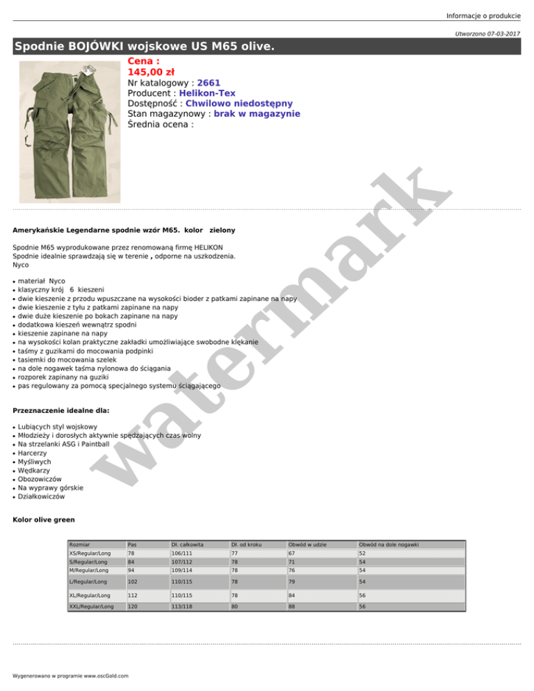 Informacje o produkcie Utworzono 07-03-2017 Spodnie BOJÓWKI wojskowe US M65 olive. Cena : 145,00 zł er m ar k Nr katalogowy : 2661 Producent : Helikon-Tex Dostępność : Chwilowo niedostępny Stan magazynowy : brak w magazynie Średnia ocena : Amerykańskie Legendarne spodnie wzór M65. kolor zielony Spodnie M65 wyprodukowane przez renomowaną firmę HELIKON Spodnie idealnie sprawdzają się w terenie , odporne na uszkodzenia. Nyco ● ● ● ● ● ● ● ● ● ● ● ● materiał Nyco klasyczny krój 6 kieszeni dwie kieszenie z przodu wpuszczane na wysokości bioder z patkami zapinane na napy dwie kieszenie z tyłu z patkami zapinane na napy dwie duże kieszenie po bokach zapinane na napy dodatkowa kieszeń wewnątrz spodni kieszenie zapinane na napy na wysokości kolan praktyczne zakładki umożliwiające swobodne klękanie taśmy z guzikami do mocowania podpinki tasiemki do mocowania szelek na dole nogawek taśma nylonowa do ściągania rozporek zapinany na guziki pas regulowany za pomocą specjalnego systemu ściągającego at ● Przeznaczenie idealne dla: ● ● ● ● ● ● ● ● Lubiących styl wojskowy Młodzieży i dorosłych aktywnie spędzających czas wolny Na strzelanki ASG i Paintball Harcerzy Myśliwych Wędkarzy Obozowiczów Na wyprawy górskie Działkowiczów w ● Kolor olive green Rozmiar Pas Dł. całkowita Dł. od kroku Obwód w udzie Obwód na dole nogawki XS/Regular/Long 78 106/111 77 67 52 S/Regular/Long 84 107/112 78 71 54 M/Regular/Long 94 109/114 78 76 54 L/Regular/Long 102 110/115 78 79 54 XL/Regular/Long 112 110/115 78 84 56 XXL/Regular/Long 120 113/118 80 88 56 Wygenerowano w programie www.oscGold.com Dostępne opcje Spodnie BOJÓWKI wojskowe US M65 olive. w at er m ar k » Długość US: Regular, Long. » Rozmiar: XS, S, M, L, XL, 2XL.