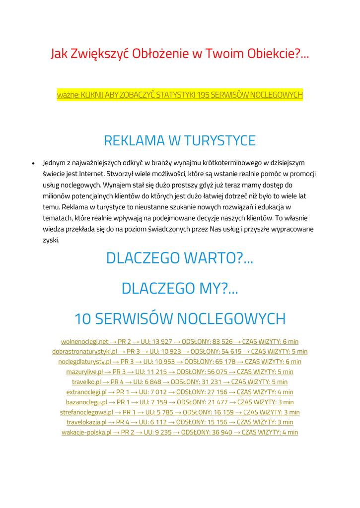 Jak Zwiększyć Obłożenie w Twoim Obiekcie?... ważne: KLIKNIJ ABY ZOBACZYĆ STATYSTYKI 195 SERWISÓW NOCLEGOWYCH REKLAMA W TURYSTYCE Jednym z najważniejszych odkryć w branży wynajmu krótkoterminowego w dzisiejszym świecie jest Internet. Stworzył wiele możliwości, które są wstanie realnie pomóc w promocji usług noclegowych. Wynajem stał się dużo prostszy gdyż już teraz mamy dostęp do milionów potencjalnych klientów do których jest dużo łatwiej dotrzeć niż było to wiele lat temu. Reklama w turystyce to nieustanne szukanie nowych rozwiązań i edukacja w tematach, które realnie wpływają na podejmowane decyzje naszych klientów. To własnie wiedza przekłada się do na poziom świadczonych przez Nas usług i przyszłe wypracowane zyski. DLACZEGO WARTO?... DLACZEGO MY?... 10 SERWISÓW NOCLEGOWYCH wolnenoclegi.net → PR 2 → UU: 13 927 → ODSŁONY: 83 526 → CZAS WIZYTY: 6 min dobrastronaturystyki.pl → PR 3 → UU: 10 923 → ODSŁONY: 54 615 → CZAS WIZYTY: 5 min noclegdlaturysty.pl → PR 3 → UU: 10 953 → ODSŁONY: 65 178 → CZAS WIZYTY: 6 min mazurylive.pl → PR 3 → UU: 11 215 → ODSŁONY: 56 075 → CZAS WIZYTY: 5 min travelko.pl → PR 4 → UU: 6 848 → ODSŁONY: 31 231 → CZAS WIZYTY: 5 min extranoclegi.pl → PR 1 → UU: 7 012 → ODSŁONY: 27 156 → CZAS WIZYTY: 4 min bazanoclegu.pl → PR 1 → UU: 7 159 → ODSŁONY: 21 477 → CZAS WIZYTY: 3 min strefanoclegowa.pl → PR 1 → UU: 5 785 → ODSŁONY: 16 159 → CZAS WIZYTY: 3 min travelokazja.pl → PR 4 → UU: 6 112 → ODSŁONY: 15 156 → CZAS WIZYTY: 3 min wakacje-polska.pl → PR 2 → UU: 9 235 → ODSŁONY: 36 940 → CZAS WIZYTY: 4 min KORZYŚCI Z PUBLIKACJI Wyświetlanie na 10 serwisach noclegowych, Poprawa rozpoznawalności marki jako obiektu noclegowego, Umiejscowienie obiektu wśród wszystkich kategorii noclegowych w Polsce, Dotarcie do klientów szukających noclegu, Wzrost i umocnienie PR obiektu, Zwiększenie sprzedaży wynajmowych noclegów, Możliwość zaprezentowania usług klientom zagranicznym. CHARAKTERYSTYKA PORTALI Reklama w turystyce dzięki prezentacji na 10 serwisach noclegowych, PAGE RANK SERWISÓW wynosi: 4, 4, 3, 3, 3, 2, 2, 2, 1, 1 Przyjazne linki, wartość serwisu przechodzi na Twoją stronę, 4 000 – 10 000 unikalnych użytkowników miesięcznie, 20 000 – 50 000 odsłon miesięcznie, 4:20 – średni czas odwiedzin serwisu, 8,73 – strony/odwiedziny na użytkownika, Współczynnik odrzuceń – 43%. POTENCJALNI KLIENCI Klienci biznesowi, Użytkownicy prywatni, Organizatorzy konferencji, Firmy szkoleniowe, Agencje PR, Firmy eventowe, Rodziny z dziećmi, Osoby starsze, Samotni/Single. DAWCOM W DARZE... Jeśli Twój obiekt jeszcze nie uczestniczy w Akcji warto się przyjrzeć bliżej. Udzielając od 10% do 50% rabatu noclegowego wszystkim aktywnym Honorowym Dawcom Krwi otrzymasz: bezpłatną reklamę - informacja o uczestnikach Akcji opublikowana jest na stronie www.dawcomwdarze.pl oraz w profilach Facebook i Nasza Klasa Akcji. Wiadomość o firmach dołączających do Akcji trafia też do wszystkich Regionalnych Centrów Krwiodawstwa i Krwiolecznictwa, większości Klubów Honorowych Dawców Krwi oraz wybranych mediów. zwiększenie dochodów - liczba krwiodawców w Polsce sięga obecnie blisko 700.000 osób, jest to więc grupa do której warto skierować swoją ofertę, bo przecież lepiej mieć u siebie rzeszę klientów, którzy zapłacą 80% ceny, niż nie mieć ich w ogóle... poprawę wizerunku obiektu - rabat jest gestem wdzięczności za donację i stanowi równocześnie dodatkową zachętę do oddawania krwi. reklama w turystyce - idealnie nadaje się do tego aby przedstawić swój obiekt w dobrym świetle otwartym na pomoc innym ludziom. Rabat przyznawany jest na podstawie legitymacji Honorowego Dawcy Krwi, pod warunkiem, że od ostatniego pobrania nie minął więcej niż rok. Rabat nie sumuje się z innymi ulgami. Obecnie w Akcji bierze udział blisko 100 obiektów. Ich wykaz znajduje się na stronie www.dawcomwdarze.pl Zarejestruj się jako "HONOROWY" OBIEKT LUBIE TO FACEBOOK... Zobacz nasz profil na FACEBOOK SPRAWDŹ, PRZETESTUJ, WYPRÓBUJ... Dodaj swój obiekt już teraz testuj, próbuj, sprawdzaj i nie zwlekaj aby turyści w pełni mogli poznać korzyści z każdej chwili spędzonej w Twoim obiekcie. Pozycjonuj swoją stronę i szukaj nowych rozwiązań, które ciągle pojawiają się w Internecie. Nic nie trwa wiecznie, dlatego korzystaj z nowych rozwiązań, które masz na wyciągniecie rąk. Dodaj swój obiekt już teraz i przekonaj się, że warto! TESTUJ TERAZ - REKLAMA W TURYSTYCE - 30 DNI FREE 10 SERWISÓW NOCLEGOWYCH DODAJ OBIEKT TERAZ - 30 DNI GRATIS PO PIERWSZE REKLAMA W TURYSTYCE PO DRUGIE REKLAMA W TURYSTYCE PO TRZECIE REKLAMA W TURYSTYCE TAK DODAJ OBIEKT TERAZ - 30 DNI GRATIS BLOG Z PORADAMI... Aby jeszcze bardziej zrozumieć, jak działa reklama w turystyce do dyspozycji udostępniłem Tobie blog z ciekawymi informacjami. Możesz na nim zobaczyć różne artykuły, pomysły, a także porady, które mogą pomóc Ci lepiej zarządzać obiektem noclegowym. Mam nadzieje, że wykorzystasz zawarte w nim instrukcje, a dzięki nim Twój obiekt będzie lepiej zaoptymalizowany, a koszty jakie ponosisz obniżą się w sposób widoczny dla Twojej kieszeni. ZOBACZ BLOG JUŻ TERAZ KAŻDY PAKIET ZAWIERA... Widoczność w 10 serwisach noclegowych Dane kontaktowe, opis i adres Galeria zdjęć (ilość 10 szt.) Prezentacja wideo Prezentacja wirtualne spaceru Szczegółowy cennik Spis atrakcji turystycznych Możliwość edycji danych Twojego obiektu Link do strony WWW Klienta Zniżki w obiekcie Możliwość przystąpienia do akcji DAWCOM W DARZE Formularz rezerwacyjny Statystyki odwiedzin prezentacji Lokalizacja obiektu na mapie Komentarze i ocena Wyposażenie i udogodnienia Moduł organizacji spotkań okolicznościowych Warto zobaczyć i potrawy regionalne Reklama w profilu Facebook Artykuł w sekcji atrakcje DODAJ OBIEKT TERAZ -