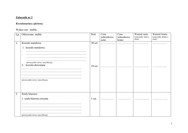 Załacznik nr 2 Kwestionariusz ofertowy Wykaz cen - meble. Lp. Oferowane meble 1. Krzesło metalowe Ilość Cena jednostkowa netto Cena jednostkowa brutto Wartość netto Wartość brutto (cena jedn. netto x ilość) (cena jedn. brutto x ilość) 30 szt. ……………. ……………. ……………. ……………. 10 szt. ……………. ……………. ……………. ……………. 1 szt. ………….. …………….. …………….. 1. krzesło metalowe. …………………………………………………………. …………………………………………………………. …………………………………………………………. …………………………………………………………. (proszę podać nazwę i specyfikację) 2. krzesło drewniane …………………………………………………………. …………………………………………………………. …………………………………………………………. …………………………………………………………. (proszę podać nazwę i specyfikację) 2. Szafy biurowe 1. szafa biurowa otwarta …………… …………………………………………………………. …………………………………………………………. …………………………………………………………. …………………………………………………………. (proszę podać nazwę i specyfikację) 1 2. szafa biurowa zamknięta 2 szt. ………….. 2 szt. ………….. ………….. ………….. ……………. ……………. ……………. ……………. 2 szt. ……………. ……………. ……………. ……………. 5 szt. …………… ……………. …………….. …………….. …………………………………………………………. …………………………………………………………. …………………………………………………………. …………………………………………………………. (proszę podać nazwę i specyfikację) 3. 1. Biurko komputerowe …………………………………………………………. …………………………………………………………. …………………………………………………………. …………………………………………………………. (proszę podać nazwę i specyfikację) 4 Stoły 1. stół drewniany …………………………………………………………. …………………………………………………………. …………………………………………………………. …………………………………………………………. (proszę podać nazwę i specyfikację) 2. stół okrągły …………………………………………………………. …………………………………………………………. …………………………………………………………. …………………………………………………………. (proszę podać nazwę i specyfikację) 2 5. 1. stolik podłuŜny (ława) …………………………………………………………. …………………………………………………………. …………………………………………………………. …………………………………………………………. 1 szt. …………… …………… …………… ……………… 4 szt. …………… …………… …………… ……………… 1 szt. …………… …………… …………… …………… 1 szt. …………… …………… ……………. …………….. 1szt. …………… …………… …………… …………… (proszę podać nazwę i specyfikację) 6. 1. Fotel finka …………………………………………………………. …………………………………………………………. …………………………………………………………. …………………………………………………………. (proszę podać nazwę i specyfikację 7. Meblościanka 1. witryna oszklona …………………………………………………………. …………………………………………………………. …………………………………………………………. …………………………………………………………. (proszę podać nazwę i specyfikację 2. komoda …………………………………………………………. …………………………………………………………. …………………………………………………………. …………………………………………………………. (proszę podać nazwę i specyfikację 3. regał z półkami …………………………………………………………. …………………………………………………………. …………………………………………………………. …………………………………………………………. (proszę podać nazwę i specyfikację 3 8. Kanapa 1. Kanapa 3 osobowa 3 szt. …………… …………… …………… …………… 1 szt. …………… …………… …………… …………… …………………………………………………………. …………………………………………………………. …………………………………………………………. …………………………………………………………. (proszę podać nazwę i specyfikację 2. Kanapa 2 osobowa …………………………………………………………. …………………………………………………………. …………………………………………………………. …………………………………………………………. (proszę podać nazwę i specyfikację 4