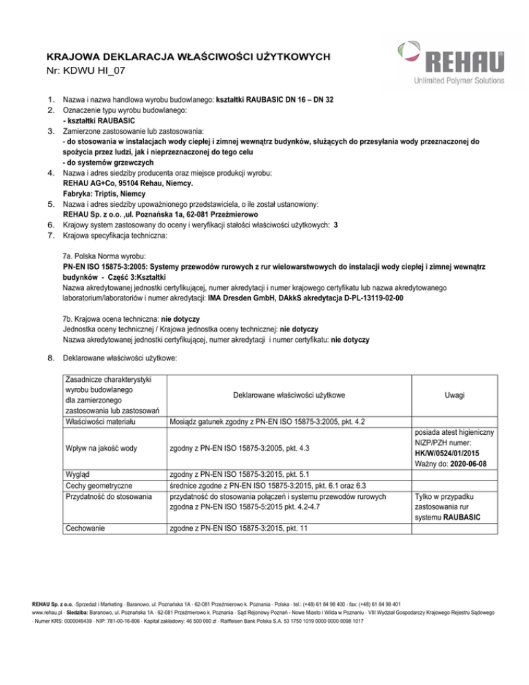 KRAJOWA DEKLARACJA WŁAŚCIWOŚCI UŻYTKOWYCH Nr: KDWU HI_07 1. Nazwa i nazwa handlowa wyrobu budowlanego: kształtki RAUBASIC DN 16 – DN 32 2. Oznaczenie typu wyrobu budowlanego: - kształtki RAUBASIC 3. Zamierzone zastosowanie lub zastosowania: - do stosowania w instalacjach wody ciepłej i zimnej wewnątrz budynków, służących do przesyłania wody przeznaczonej do spożycia przez ludzi, jak i nieprzeznaczonej do tego celu - do systemów grzewczych 4. Nazwa i adres siedziby producenta oraz miejsce produkcji wyrobu: REHAU AG+Co, 95104 Rehau, Niemcy. Fabryka: Triptis, Niemcy 5. Nazwa i adres siedziby upoważnionego przedstawiciela, o ile został ustanowiony: REHAU Sp. z o.o. ,ul. Poznańska 1a, 62-081 Przeźmierowo 6. Krajowy system zastosowany do oceny i weryfikacji stałości właściwości użytkowych: 3 7. Krajowa specyfikacja techniczna: 7a. Polska Norma wyrobu: PN-EN ISO 15875-3:2005: Systemy przewodów rurowych z rur wielowarstwowych do instalacji wody ciepłej i zimnej wewnątrz budynków - Część 3:Kształtki Nazwa akredytowanej jednostki certyfikującej, numer akredytacji i numer krajowego certyfikatu lub nazwa akredytowanego laboratorium/laboratoriów i numer akredytacji: IMA Dresden GmbH, DAkkS akredytacja D-PL-13119-02-00 7b. Krajowa ocena techniczna: nie dotyczy Jednostka oceny technicznej / Krajowa jednostka oceny technicznej: nie dotyczy Nazwa akredytowanej jednostki certyfikującej, numer akredytacji i numer certyfikatu: nie dotyczy 8. Deklarowane właściwości użytkowe: Zasadnicze charakterystyki wyrobu budowlanego dla zamierzonego zastosowania lub zastosowań Właściwości materiału Deklarowane właściwości użytkowe Uwagi Mosiądz gatunek zgodny z PN-EN ISO 15875-3:2005, pkt. 4.2 Wpływ na jakość wody zgodny z PN-EN ISO 15875-3:2005, pkt. 4.3 Wygląd Cechy geometryczne Przydatność do stosowania zgodny z PN-EN ISO 15875-3:2015, pkt. 5.1 średnice zgodne z PN-EN ISO 15875-3:2015, pkt. 6.1 oraz 6.3 przydatność do stosowania połączeń i systemu przewodów rurowych zgodna z PN-EN ISO 15875-5:2015 pkt. 4.2-4.7 Cechowanie zgodne z PN-EN ISO 15875-3:2015, pkt. 11 posiada atest higieniczny NIZP/PZH numer: HK/W/0524/01/2015 Ważny do: 2020-06-08 Tylko w przypadku zastosowania rur systemu RAUBASIC REHAU Sp. z o.o. Sprzedaż i Marketing Baranowo, ul. Poznańska 1A 62-081 Przeźmierowo k. Poznania Polska tel.: (+48) 61 84 98 400 fax: (+48) 61 84 98 401 www.rehau.pl Siedziba: Baranowo, ul. Poznańska 1A 62-081 Przeźmierowo k. Poznania Sąd Rejonowy Poznań - Nowe Miasto i Wilda w Poznaniu VIII Wydział Gospodarczy Krajowego Rejestru Sądowego Numer KRS: 0000049439 NIP: 781-00-16-806 Kapitał zakładowy: 46 500 000 zł Raiffeisen Bank Polska S.A. 53 1750 1019 0000 0000 0098 1017 9. Właściwości użytkowe określonego powyżej wyrobu są zgodne z wszystkimi wymienionymi w pkt. 8 deklarowanymi właściwościami użytkowymi. Niniejsza krajowa deklaracja właściwości użytkowych wydana zostaje zgodnie z ustawą z dnia 16 kwietnia 2004 r. o wyrobach budowlanych, na wyłączną odpowiedzialność producenta. W imieniu producenta podpisał(-a): Michał Zając Manager ds. Technicznych Technika instalacyjna - systemy grzewcze, sanitarne i geotermalne ………………….......................................................................................................................... ( imię i nazwisko oraz stanowisko) Poznań 02.01.2017 (miejsce i data wydania) ............................................. (podpis) REHAU Sp. z o.o. Sprzedaż i Marketing Baranowo, ul. Poznańska 1A 62-081 Przeźmierowo k. Poznania Polska tel.: (+48) 61 84 98 400 fax: (+48) 61 84 98 401 www.rehau.pl Siedziba: Baranowo, ul. Poznańska 1A 62-081 Przeźmierowo k. Poznania Sąd Rejonowy Poznań - Nowe Miasto i Wilda w Poznaniu VIII Wydział Gospodarczy Krajowego Rejestru Sądowego Numer KRS: 0000049439 NIP: 781-00-16-806 Kapitał zakładowy: 46 500 000 zł Raiffeisen Bank Polska S.A. 53 1750 1019 0000 0000 0098 1017