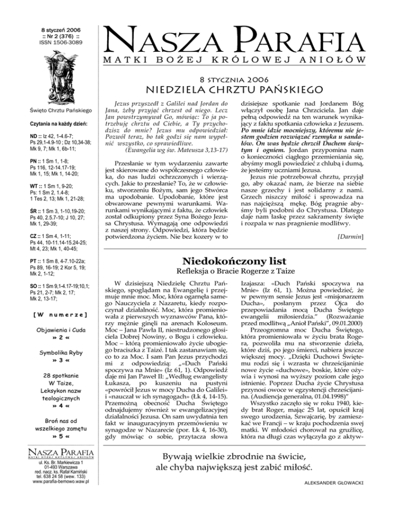 8 styczeń 2006 :: Nr 2 (376) :: ISSN 1506-3089 8 stycznia 2006 NIEDZIELA CHRZTU PAŃSKIEGO Święto Chrztu Pańskiego Czytania na każdy dzień: ND :: Iz 42, 1-4.6-7; Ps 29,1-4.9-10 ; Dz 10,34-38; Mk 9, 7; Mk 1, 6b-11; PN :: 1 Sm 1, 1-8; Ps 116, 12-14.17-19; Mk 1, 15; Mk 1, 14-20; WT :: 1 Sm 1, 9-20; Ps: 1 Sm 2, 1.4-8; 1 Tes 2, 13; Mk 1, 21-28; ŚR :: 1 Sm 3, 1-10,19-20; Ps 40, 2.5.7-10; J 10, 27; Mk 1, 29-39; CZ :: 1 Sm 4, 1-11; Ps 44, 10-11.14-15.24-25; Mt 4, 23; Mk 1, 40-45; PT :: 1 Sm 8, 4-7.10-22a; Ps 89, 16-19; 2 Kor 5, 19; Mk 2, 1-12; SO :: 1 Sm 9,1-4.17-19;10,1; Ps 21, 2-7; Mk 2, 17; Mk 2, 13-17; [W numerze] Objawienia i Cuda » 2 « Symbolika Ryby » 3 « 28 spotkanie W Taize, Leksykon nazw teologicznych » 4 « Broń nas od wszelkiego zamętu » 5 « ul. Ks. Br. Markiewicza 1 01-493 Warszawa red. nacz. ks. Rafał Kamiński tel. 638 24 58 (wew. 133) www.parafia-bemowo.waw.pl Jezus przyszedł z Galilei nad Jordan do Jana, żeby przyjąć chrzest od niego. Lecz Jan powstrzymywał Go, mówiąc: To ja po‐ trzebuję chrztu od Ciebie, a Ty przycho‐ dzisz do mnie? Jezus mu odpowiedział: Pozwól teraz, bo tak godzi się nam wypeł‐ nić wszystko, co sprawiedliwe. (Ewangelia wg św. Mateusza 3,13‐17) Przesłanie w tym wydarzeniu zawarte jest skierowane do współczesnego człowie‐ ka, do nas ludzi ochrzczonych i wierzą‐ cych. Jakie to przesłanie? To, że w człowie‐ ku, stworzeniu Bożym, sam jego Stwórca ma upodobanie. Upodobanie, które jest obwarowane pewnymi warunkami. Wa‐ runkami wynikającymi z faktu, że człowiek został odkupiony przez Syna Bożego Jezu‐ sa Chrystusa. Wymagają one odpowiedzi z naszej strony. Odpowiedzi, która będzie potwierdzona życiem. Nie bez kozery w to dzisiejsze spotkanie nad Jordanem Bóg włączył osobę Jana Chrzciciela. Jan daje pełną odpowiedź na ten warunek wynika‐ jący z faktu spotkania człowieka z Jezusem. Po mnie idzie mocniejszy, któremu nie je‐ stem godzien rozwiązać rzemyka u sanda‐ łów. On was będzie chrzcił Duchem świę‐ tym i ogniem. Jordan przypomina nam o konieczności ciągłego przemieniania się, abyśmy mogli powiedzieć z chlubą i dumą, że jesteśmy uczniami Jezusa. Jezus nie potrzebował chrztu, przyjął go, aby okazać nam, że bierze na siebie nasze grzechy i jest solidarny z nami. Grzech niszczy miłość i sprowadza na nas najcięższą mękę. Bóg pragnie aby‐ śmy byli podobni do Chrystusa. Dlatego daje nam łaskę przez sakramenty święte i rozpala w nas pragnienie modlitwy. [Darmin] Niedokończony list Refleksja o Bracie Rogerze z Taize W dzisiejszą Niedzielę Chrztu Pań‐ skiego, spoglądam na Ewangelię i przej‐ muje mnie moc. Moc, która ogarnęła same‐ go Nauczyciela z Nazaretu, kiedy rozpo‐ czynał działalność. Moc, która promienio‐ wała z pierwszych wyznawców Pana, któ‐ rzy mężnie ginęli na arenach Koloseum. Moc – Jana Pawła II, niestrudzonego głosi‐ ciela Dobrej Nowiny, o Bogu i człowieku. Moc – którą promieniowało życie ubogie‐ go braciszka z Taizé. I tak zastanawiam się, co to za Moc. I sam Pan Jezus przychodzi mi z odpowiedzią: „«Duch Pański spoczywa na Mnie» (Iz 61, 1). Odpowiedź daje mi Jan Paweł II: „Według ewangelisty Łukasza, po kuszeniu na pustyni «powrócił Jezus w mocy Ducha do Galilei» i «nauczał w ich synagogach» (Łk 4, 14‐15). Przemożną obecność Ducha Świętego odnajdujemy również w ewangelizacyjnej działalności Jezusa. On sam uwydatnia ten fakt w inauguracyjnym przemówieniu w synagodze w Nazarecie (por. Łk 4, 16‐30), gdy mówiąc o sobie, przytacza słowa Izajasza: «Duch Pański spoczywa na Mnie» (Iz 61, 1). Można powiedzieć, że w pewnym sensie Jezus jest «misjonarzem Ducha», posłanym przez Ojca do przepowiadania mocą Ducha Świętego ewangelii miłosierdzia.” (Rozważanie przed modlitwą „Anioł Pański”, 09.01.2000) Przeogromna moc Ducha Świętego, która promieniowała w życiu brata Roge‐ ra, pozwoliła mu na stworzenie dzieła, które dziś, po jego śmierci, nabiera jeszcze większej mocy. „Dzięki Duchowi Święte‐ mu rodzi się i wzrasta w chrześcijaninie nowe życie «duchowe», boskie, które oży‐ wia i wynosi na wyższy poziom całe jego istnienie. Poprzez Ducha życie Chrystusa przynosi owoce w egzystencji chrześcijani‐ na. (Audiencja generalna, 01.04.1998)” Wszystko zaczęło się w roku 1940, kie‐ dy brat Roger, mając 25 lat, opuścił kraj swego urodzenia, Szwajcarię, by zamiesz‐ kać we Francji – w kraju pochodzenia swej matki. W młodości chorował na gruźlicę, która na długi czas wyłączyła go z aktyw‐ Bywają wielkie zbrodnie na świcie, ale chyba największą jest zabić miłość. ALEKSANDER GŁOWACKI 2 nego życia. Wtedy dojrzało w nim wewnętrzne wezwanie do stwo‐ rzenia wspólnoty, która w cen‐ trum swego życia umieściłaby dwie podstawowe rzeczywistości ewangeliczne: prostotę i dobroć serca. W Taizé, dzięki niewielkiej pożyczce, brat Roger kupił opuszczony od wielu lat dom wraz z przyległościami. Zaproponował jednej ze swych sióstr, Geneviève, by przyjechała mu pomóc. Wśród uchodźców, których przyjął, byli również Żydzi. Warunki życia były bardzo skromne. Nie było bieżącej wody; po wodę pitną chodziło się do studni w wiosce. Ubogie było także wyżywienie; składało się głównie z zupy robionej z kukurydzianej mąki kupowanej tanio w pobliskim młynie. W 1945 roku pewien młody człowiek mieszkający w regionie powołał do życia stowarzyszenie, które miało opiekować się dziećmi osieroconymi przez wojnę. Zaproponował braciom, by przyjęli kilkoro z nich u siebie w Taizé. Ponieważ wspólnota mężczyzn nie mogła zajmować się dziećmi, brat Roger poprosił swą siostrę Geneviève, by wróciła do Taizé i zaopiekowała się dziećmi jako ich przybrana matka. W niedziele bracia gościli również u siebie niemieckich więźniów internowanych w oboz