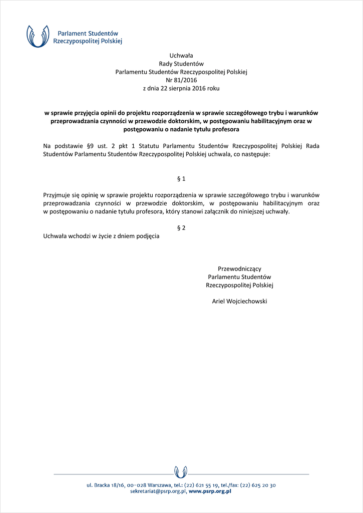 Uchwała Rady Studentów Parlamentu Studentów Rzeczypospolitej Polskiej Nr 81/2016 z dnia 22 sierpnia 2016 roku w sprawie przyjęcia opinii do projektu rozporządzenia w sprawie szczegółowego trybu i warunków przeprowadzania czynności w przewodzie doktorskim, w postępowaniu habilitacyjnym oraz w postępowaniu o nadanie tytułu profesora Na podstawie §9 ust. 2 pkt 1 Statutu Parlamentu Studentów Rzeczypospolitej Polskiej Rada Studentów Parlamentu Studentów Rzeczypospolitej Polskiej uchwala, co następuje: §1 Przyjmuje się opinię w sprawie projektu rozporządzenia w sprawie szczegółowego trybu i warunków przeprowadzania czynności w przewodzie doktorskim, w postępowaniu habilitacyjnym oraz w postępowaniu o nadanie tytułu profesora, który stanowi załącznik do niniejszej uchwały. §2 Uchwała wchodzi w życie z dniem podjęcia Przewodniczący Parlamentu Studentów Rzeczypospolitej Polskiej Ariel Wojciechowski Opinia Parlamentu Studentów Rzeczypospolitej Polskiej do projektu rozporządzenia w sprawie szczegółowego trybu i warunków przeprowadzania czynności w przewodzie doktorskim, w postępowaniu habilitacyjnym oraz w postępowaniu o nadanie tytułu profesora Wstęp Parlament Studentów Rzeczypospolitej Polskiej przedstawia swoją opinię do projektu rozporządzenia w sprawie szczegółowego trybu i warunków przeprowadzania czynności w przewodzie doktorskim, postępowaniu habilitacyjnym oraz w postępowaniu o nadanie tytułu profesora. Parlament Studentów Rzeczypospolitej Polskiej zastrzega przy tym możliwość rozbudowania niniejszego stanowiska po otrzymaniu dodatkowych uwag od środowiska studenckiego w Polsce. Treść Opinii Parlament Studentów Rzeczypospolitej Polskiej wyraża swoje poparcie i pozytywnie odnosi się do większości postanowień projektu rozporządzenia w sprawie szczegółowego trybu i warunków przeprowadzania czynności w przewodzie doktorskim, postępowaniu habilitacyjnym oraz w postępowaniu o nadanie tytułu profesora. Przedstawione propozycje treści normatywnej projektu rozporządzenia stanowiące niewielką modyfikację w stosunku do obowiązującego obecnie rozporządzenia Ministra Nauki i Szkolnictwa Wyższego z dnia 30 października 2015 r. w sprawie szczegółowego trybu i warunków przeprowadzania czynności w przewodzie doktorskim, w postępowaniu habilitacyjnym oraz w postępowaniu o nadanie tytułu profesora zasługują na poparcie Parlamentu zrozumienie środowiska studenckiego. Niemniej szereg zaproponowanych zmian skupiających się przede wszystkim na wprowadzeniu nowych możliwości przeprowadzania obrony rozprawy doktorskiej, w opinii Parlamentu wydają się bezzasadne i budzą nasze wątpliwości. „Legalizacja/Uwierzytelnienie” Parlament Studentów Rzeczypospolitej Polskiej pozytywnie ocenia przedstawione propozycje zastąpienia występujących w dotychczasowym rozporządzeniu wyrazów „legalizacja” wyrazami „uwierzytelnianie”. Parlament w pełni uznaje zasadność powyższej zmiany będącej konsekwencją wynikającą z konieczności dostosowania przepisów rozporządzenia do zmienionej terminologii ustawy z dnia 14 marca 2003 r. o stopniach naukowych i tytule naukowym oraz o stopniach i tytule w zakresie sztuki. Rezygnacja z obowiązku przedkładania kopii dokumentów oraz informacji o składzie komisji habilitacyjnej Parlament Studentów Rzeczypospolitej Polskiej pozytywnie ocenia przedstawione propozycje usuwające obowiązek przedkładania kopii dokumentów wymaganych w poszczególnych przepisach rozporządzenia uprzednio poświadczonych przez jednostkę organizacyjną wybraną do prowadzenia danego postępowania oraz zastąpienie wymogu przekazywania informacji o składzie komisji habilitacyjnej wymogiem przekazywania kopii uchwały podjętej przez tę komisję. Parlament w pełni uznaje zasadność powyższych zmian podkreślając przewidziane przez ustawodawcę inne narzędzia weryfikacji prawdziwości właściwych dokumentów takich jak weryfikacja wątpliwych danych przy pomocy Zintegrowanego Systemu Informacji o Nauce i Szkolnictwie Wyższym „POL-on”. Wideokonferencja Parlament Studentów Rzeczypospolitej Polskiej wyraża swoje wątpliwości i negatywnie odnosi się do uwzględnienia możliwości przeprowadzania obrony rozprawy doktorskiej w formie wideokonferencji. W opinii Parlamentu zastąpienie tradycyjnej formy obrony formą przeprowadzania obrony rozprawy doktorskiej w postaci wideokonferencji stanowi przejaw obniżenia standardów naukowych, dewaluacji kluczowego etapu przewodu, od którego zależy nadanie bądź odmowa nadania stopnia doktora (rada jednostki podejmuje również uchwałę o przyjęciu publicznej obrony pracy doktorskiej). Publiczna obrona pracy doktorskiej w jej tradycyjnej formie ma szczególne znaczenie w przypadku przewodów doktorskich przeprowadzanych w obszarze sztuki, gdzie niejednokrotnie publiczna prezentacja dzieła, czy to plastycznego, czy muzycznego i sposób jego prezentacji stanowią podstawę do nadania stopnia doktora. W przypadku prac doktorskich artystycznych (a nie rozpraw naukowych) publiczna obrona stanowi pierwszą publiczną prezentację dzieła wcześniej niepublikowanego. Wystawa prac jest jedyną szansą zaznajomienia się z pracą doktorską, zwłaszcza dla odbiorców spoza jednostki naukowej a bez prezentacji prac artystycznych w oryginalnym rozmiarze czy oryginalnym wykonaniu i w odpowiedniej przestrzeni, rada jednostki nie może (i nie powinna) dokonywać właściwej i rzetelnej oceny poziomu prac i obrony doktoranta. Ogłaszanie w dzienniku urzędowym informacji o nadanych stopniach doktora i doktora habilitowanego Parlament Studentów Rzeczypospolitej Polskiej nie ma również zastrzeżeń do rezygnacji z regulacji dotyczącej ogłaszania przez ministra właściwego do spraw szkolnictwa wyższego w dzienniku urzędowym informacji o nadanych stopniach doktora i doktora habilitowanego w poprzednim roku kalendarzowym, podkreślając prze
