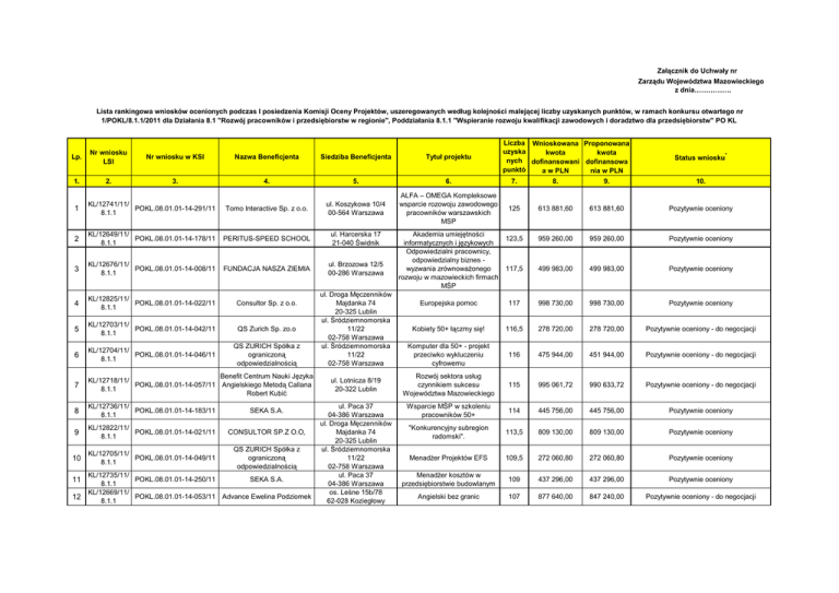 Załącznik do Uchwały nr Zarządu Województwa Mazowieckiego z dnia……………. Lista rankingowa wniosków ocenionych podczas I posiedzenia Komisji Oceny Projektów, uszeregowanych według kolejności malejącej liczby uzyskanych punktów, w ramach konkursu otwartego nr 1/POKL/8.1.1/2011 dla Działania 8.1 "Rozwój pracowników i przedsiębiorstw w regionie", Poddziałania 8.1.1 "Wspieranie rozwoju kwalifikacji zawodowych i doradztwo dla przedsiębiorstw" PO KL Lp. Nr wniosku LSI Nr wniosku w KSI Nazwa Beneficjenta Siedziba Beneficjenta 1. 2. 3. 4. 5. 6. ALFA – OMEGA Kompleksowe wsparcie rozowoju zawodowego pracowników warszawskich MSP 1 KL/12741/11/ POKL.08.01.01-14-291/11 8.1.1 Tomo Interactive Sp. z o.o. ul. Koszykowa 10/4 00-564 Warszawa 2 KL/12649/11/ POKL.08.01.01-14-178/11 8.1.1 PERITUS-SPEED SCHOOL ul. Harcerska 17 21-040 Świdnik 3 KL/12676/11/ POKL.08.01.01-14-008/11 8.1.1 FUNDACJA NASZA ZIEMIA ul. Brzozowa 12/5 00-286 Warszawa 4 KL/12825/11/ POKL.08.01.01-14-022/11 8.1.1 Consultor Sp. z o.o. 5 KL/12703/11/ POKL.08.01.01-14-042/11 8.1.1 QS Zurich Sp. zo.o 6 KL/12704/11/ POKL.08.01.01-14-046/11 8.1.1 QS ZURICH Spółka z ograniczoną odpowiedzialnością 7 Benefit Centrum Nauki Języka KL/12718/11/ POKL.08.01.01-14-057/11 Angielskiego Metodą Callana 8.1.1 Robert Kubić 8 KL/12736/11/ POKL.08.01.01-14-183/11 8.1.1 SEKA S.A. 9 KL/12822/11/ POKL.08.01.01-14-021/11 8.1.1 CONSULTOR SP.Z O.O, 10 KL/12705/11/ POKL.08.01.01-14-049/11 8.1.1 QS ZURICH Spółka z ograniczoną odpowiedzialnością 11 12 KL/12735/11/ POKL.08.01.01-14-250/11 SEKA S.A. 8.1.1 KL/12669/11/ POKL.08.01.01-14-053/11 Advance Ewelina Podziomek 8.1.1 ul. Droga Męczenników Majdanka 74 20-325 Lublin ul. Śródziemnomorska 11/22 02-758 Warszawa ul. Śródziemnomorska 11/22 02-758 Warszawa ul. Lotnicza 8/19 20-322 Lublin ul. Paca 37 04-386 Warszawa ul. Droga Męczenników Majdanka 74 20-325 Lublin ul. Śródziemnomorska 11/22 02-758 Warszawa ul. Paca 37 04-386 Warszawa os. Leśne 15b/78 62-028 Koziegłowy Tytuł projektu Liczba Wnioskowana Proponowana uzyska kwota kwota nych dofinansowani dofinansowa punktó a w PLN nia w PLN w 7. 8. 9. * Status wniosku 10. 125 613 881,60 613 881,60 Pozytywnie oceniony 123,5 959 260,00 959 260,00 Pozytywnie oceniony 117,5 499 983,00 499 983,00 Pozytywnie oceniony Europejska pomoc 117 998 730,00 998 730,00 Pozytywnie oceniony Kobiety 50+ łączmy się! 116,5 278 720,00 278 720,00 Pozytywnie oceniony - do negocjacji Komputer dla 50+ - projekt przeciwko wykluczeniu cyfrowemu 116 475 944,00 451 944,00 Pozytywnie oceniony - do negocjacji Rozwój sektora usług czynnikiem sukcesu Województwa Mazowieckiego 115 995 061,72 990 633,72 Pozytywnie oceniony - do negocjacji Wsparcie MŚP w szkoleniu pracowników 50+ 114 445 756,00 445 756,00 Pozytywnie oceniony "Konkurencyjny subregion radomski". 113,5 809 130,00 809 130,00 Pozytywnie oceniony Menadżer Projektów EFS 109,5 272 060,80 272 060,80 Pozytywnie oceniony Menadżer kosztów w przedsiębiorstwie budowlanym 109 437 296,00 437 296,00 Pozytywnie oceniony Angielski bez granic 107 877 640,00 847 240,00 Pozytywnie oceniony - do negocjacji Akademia umiejętności informatycznych i językowych Odpowiedzialni pracownicy, odpowiedzialny biznes wyzwania zrównoważonego rozwoju w mazowieckich firmach MŚP Ogólnopolskie Centrum Edukacji Samorządu i Administracji Spółka z ograniczoną odpowiedzialnością ul. Chałubińskiego 8 00-613 Warszawa PROFESJONALNA OBSŁUGA KLIENTA W BRANŻY TURYSTYCZNOHOTELARSKIEJ 106,5 418 490,57 418 490,57 Pozytywnie oceniony ul. Wiertnicza 138 02-952 Warszawa Menager ds.energii 106 805 393,12 805 393,12 Pozytywnie oceniony - do negocjacji Cukiernicza Spółdzielnia Inwalidów "Jedność" ul. Piłsudskiego 32 05-600 Grójec Wzrost kwalifikacji zawodowych pracowników CSI Jedność podstawą do umocnienia pozycji w branży cukierniczej 105,5 467 487,51 467 487,51 Pozytywnie oceniony - do negocjacji Centrum Edukacji Sp. z o.o. ul. Kobylińskiego 25 09-400 Płock 105 759 630,00 710 830,00 Pozytywnie oceniony - do negocjacji 102,5 614 684,00 614 684,00 Pozytywnie oceniony 102,5 327 039,52 327 039,52 Pozytywnie oceniony Nowy wymiar obsługi klienta szkolenia podnoszące 102,5 kwalifikacje w branży hotelarskogastronomicznej 715 000,00 710 000,00 Pozytywnie oceniony - do negocjacji 13 KL/12654/11/ POKL.08.01.01-14-032/11 8.1.1 14 KL/12834/11/ EKO-WILANÓW A.J. POKL.08.01.01-14-079/11 8.1.1 Kowalczyk Sp. komandytowa 15 KL/12615/11/ POKL.08.01.01-14-003/11 8.1.1 16 KL/12728/11/ POKL.08.01.01-14-131/11 8.1.1 17 18 19 20 21 22 23 24 25 26 27 KL/12665/11/ POKL.08.01.01-14-050/11 TAJFUN Grzegorz Mularczyk 8.1.1 KL/12848/11/ POKL.08.01.01-14-102/11 Europrofes Sp. z o.o. 8.1.1 ul. Zdziarska 57/1 05-800 Pruszków ul. Sielecka 22 00-738 Warszawa KL/12745/11/ POKL.08.01.01-14-083/11 8.1.1 HPR GROUP Sp. z o.o. SELECTONE Sp.k Pl. Lelewela 8 01-624 Warszawa KL/12798/11/ POKL.08.01.01-14-071/11 8.1.1 KL/12862/11/ POKL.08.01.01-14-200/11 8.1.1 COMBIDATA Poland sp. z o.o. Mazowieckie Centrum Szkoleń Sp. z o.o. ul. Emilii Plater 12 81-777 Sopot ul. Sobieszyńska 30 00-764 Warszawa KL/12821/11/ POKL.08.01.01-14-220/11 0 CTC Polska Sp. z o.o. ul. Ostrobramska 101A 04-041 Warszawa KL/12793/11/ POKL.08.01.01-14-098/11 8.1.1 KL/12794/11/ POKL.08.01.01-14-075/11 8.1.1 KL/12761/11/ POKL.08.01.01-14-135/11 8.1.1 Combidata Poland Sp. z o.o. Combidata Poland Sp. z o.o. Aromes Group Sp. z o.o. KL/12627/11/ "Koleje Mazowieckie - KM" sp. POKL.08.01.01-14-139/11 8.1.1 z o. o. KL/12746/11/ HPR GROUP Sp. z o.o. POKL.08.01.01-14-084/11 8.1.1 SELECTONE Sp.k 28 KL/12647/11/ POKL.08.01.01-14-018/11 8.1.1 Europejska Grupa Konsultingowa Sp. z o.o. 29 KL/12655/11/ POKL.08.01.01-14-152/11 8.1.1 Coface Poland Credit Management Services Sp z o.o. ul. Emilii Plater 12 81-777 Sopot ul. Emilii Plater 12 81-777 Sopot ul. Chrzanowska 10 05-825 Grodzisk Mazowiecki ul. Lubelska 1 03-802 Warszawa Pl. Lelewela 8 01-624 Warszawa ul. H.M.Kamieńskiego 201-219/16 51-126 