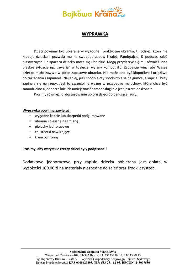WYPRAWKA Dzieci powinny być ubierane w wygodne i praktyczne ubranka, tj. odzież, która nie krępuje dziecka i pozwala mu na swobodę zabaw i zajęć. Pamiętajcie, iż podczas zajęć plastycznych lub spaceru dziecko może się ubrudzić. Mogą przydarzyć się mu również inne przykre sytuacje np. „awaria” w toalecie, wylany kompot itp. Zadbajcie więc, aby Wasze dziecko miało zawsze w półce zapasowe ubranko. Nie może ono być kłopotliwe i uciążliwe do zakładania i zapinania. Najlepiej, jeśli spodnie czy spódniczka są na gumce, a kapcie i buty zapinają się na rzepy. Jest to szczególnie ważne w przypadku maluchów, które chcą być samodzielne a jednocześnie ich umiejętność samoobsługi nie jest jeszcze doskonała. Prosimy również, o dostosowanie ubioru dzieci do panującej aury. Wyprawka powinna zawierać: wygodne kapcie lub skarpetki podgumowane ubranie i bieliznę na zmianę pieluchy jednorazowe chusteczki nawilżające krem ochronny Prosimy, aby wszystkie rzeczy dzieci były podpisane ! Dodatkowo jednorazowo przy zapisie dziecka pobierana jest opłata w wysokości 100,00 zł na materiały niezbędne do zajęć oraz środki czystości. Spółdzielnia Socjalna MINERWA Wieprz, ul. Żywiecka 404, 34-382 Bystra; tel. 33/ 333 89 12, 33/333 89 13 Sąd Rejonowy Bielsko - Biała VIII Wydział Gospodarczy Krajowego Rejestru Sądowego Rejestr Przedsiębiorców: KRS 0000429893, NIP: 553-251-12-93, REGON: 243007650