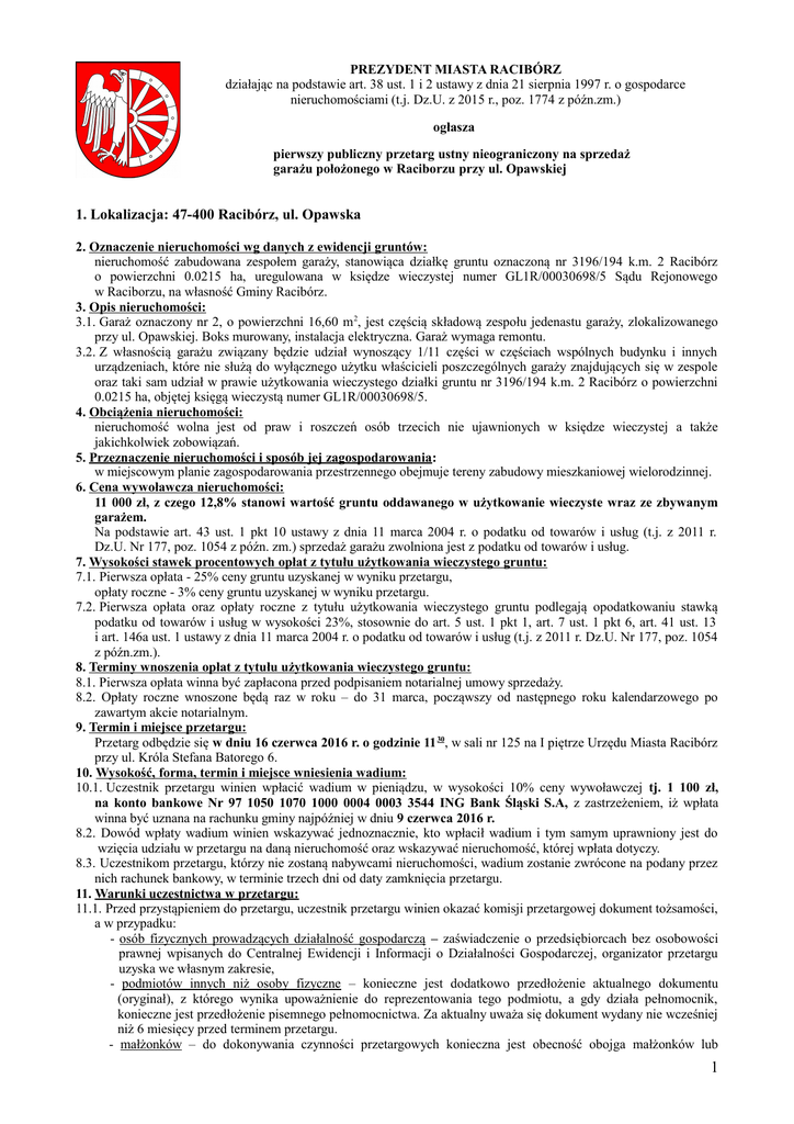 PREZYDENT MIASTA RACIBÓRZ działając na podstawie art. 38 ust. 1 i 2 ustawy z dnia 21 sierpnia 1997 r. o gospodarce nieruchomościami (t.j. Dz.U. z 2015 r., poz. 1774 z późn.zm.) ogłasza pierwszy publiczny przetarg ustny nieograniczony na sprzedaż garażu położonego w Raciborzu przy ul. Opawskiej 1. Lokalizacja: 47-400 Racibórz, ul. Opawska 2. Oznaczenie nieruchomości wg danych z ewidencji gruntów: nieruchomość zabudowana zespołem garaży, stanowiąca działkę gruntu oznaczoną nr 3196/194 k.m. 2 Racibórz o powierzchni 0.0215 ha, uregulowana w księdze wieczystej numer GL1R/00030698/5 Sądu Rejonowego w Raciborzu, na własność Gminy Racibórz. 3. Opis nieruchomości: 3.1. Garaż oznaczony nr 2, o powierzchni 16,60 m2, jest częścią składową zespołu jedenastu garaży, zlokalizowanego przy ul. Opawskiej. Boks murowany, instalacja elektryczna. Garaż wymaga remontu. 3.2. Z własnością garażu związany będzie udział wynoszący 1/11 części w częściach wspólnych budynku i innych urządzeniach, które nie służą do wyłącznego użytku właścicieli poszczególnych garaży znajdujących się w zespole oraz taki sam udział w prawie użytkowania wieczystego działki gruntu nr 3196/194 k.m. 2 Racibórz o powierzchni 0.0215 ha, objętej księgą wieczystą numer GL1R/00030698/5. 4. Obciążenia nieruchomości: nieruchomość wolna jest od praw i roszczeń osób trzecich nie ujawnionych w księdze wieczystej a także jakichkolwiek zobowiązań. 5. Przeznaczenie nieruchomości i sposób jej zagospodarowania: w miejscowym planie zagospodarowania przestrzennego obejmuje tereny zabudowy mieszkaniowej wielorodzinnej. 6. Cena wywoławcza nieruchomości: 11 000 zł, z czego 12,8% stanowi wartość gruntu oddawanego w użytkowanie wieczyste wraz ze zbywanym garażem. Na podstawie art. 43 ust. 1 pkt 10 ustawy z dnia 11 marca 2004 r. o podatku od towarów i usług (t.j. z 2011 r. Dz.U. Nr 177, poz. 1054 z późn. zm.) sprzedaż garażu zwolniona jest z podatku od towarów i usług. 7. Wysokości stawek procentowych opłat z tytułu użytkowania wieczystego gruntu: 7.1. Pierwsza opłata - 25% ceny gruntu uzyskanej w wyniku przetargu, opłaty roczne - 3% ceny gruntu uzyskanej w wyniku przetargu. 7.2. Pierwsza opłata oraz opłaty roczne z tytułu użytkowania wieczystego gruntu podlegają opodatkowaniu stawką podatku od towarów i usług w wysokości 23%, stosownie do art. 5 ust. 1 pkt 1, art. 7 ust. 1 pkt 6, art. 41 ust. 13 i art. 146a ust. 1 ustawy z dnia 11 marca 2004 r. o podatku od towarów i usług (t.j. z 2011 r. Dz.U. Nr 177, poz. 1054 z późn.zm.). 8. Terminy wnoszenia opłat z tytułu użytkowania wieczystego gruntu: 8.1. Pierwsza opłata winna być zapłacona przed podpisaniem notarialnej umowy sprzedaży. 8.2. Opłaty roczne wnoszone będą raz w roku – do 31 marca, począwszy od następnego roku kalendarzowego po zawartym akcie notarialnym. 9. Termin i miejsce przetargu: Przetarg odbędzie się w dniu 16 czerwca 2016 r. o godzinie 11 30, w sali nr 125 na I piętrze Urzędu Miasta Racibórz przy ul. Króla Stefana Batorego 6. 10. Wysokość, forma, termin i miejsce wniesienia wadium: 10.1. Uczestnik przetargu winien wpłacić wadium w pieniądzu, w wysokości 10% ceny wywoławczej tj. 1 100 zł, na konto bankowe Nr 97 1050 1070 1000 0004 0003 3544 ING Bank Śląski S.A, z zastrzeżeniem, iż wpłata winna być uznana na rachunku gminy najpóźniej w dniu 9 czerwca 2016 r. 8.2. Dowód wpłaty wadium winien wskazywać jednoznacznie, kto wpłacił wadium i tym samym uprawniony jest do wzięcia udziału w przetargu na daną nieruchomość oraz wskazywać nieruchomość, której wpłata dotyczy. 8.3. Uczestnikom przetargu, którzy nie zostaną nabywcami nieruchomości, wadium zostanie zwrócone na podany przez nich rachunek bankowy, w terminie trzech dni od daty zamknięcia przetargu. 11. Warunki uczestnictwa w przetargu: 11.1. Przed przystąpieniem do przetargu, uczestnik przetargu winien okazać komisji przetargowej dokument tożsamości, a w przypadku: - osób fizycznych prowadzących działalność gospodarczą – zaświadczenie o przedsiębiorcach bez osobowości prawnej wpisanych do Centralnej Ewidencji i Informacji o Działalności Gospodarczej, organizator przetargu uzyska we własnym zakresie, - podmiotów innych niż osoby fizyczne – konieczne jest dodatkowo przedłożenie aktualnego dokumentu (oryginał), z którego wynika upoważnienie do reprezentowania tego podmiotu, a gdy działa pełnomocnik, konieczne jest przedłożenie pisemnego pełnomocnictwa. Za aktualny uważa się dokument wydany nie wcześniej niż 6 miesięcy przed terminem przetargu. - małżonków – do dokonywania czynności przetargowych konieczna jest obecność obojga małżonków lub 1 jednego z nich z pisemnym pełnomocnictwem drugiego małżonka. W przypadku nabywania nieruchomości przez jednego małżonka, do dokonywania czynności przetargowych konieczne będzie złożenie przed komisją przetargową oświadczenia stwierdzającego, iż nabycie nieruchomości nastąpi z majątku osobistego małżonka (przy panującym ustroju wspólności majątkowej małżeńskiej) lub w przypadku rozdzielności majątkowej, przedłożenie umowy o wyłączeniu wspólności majątkowej małżeńskiej (oryginał lub uwierzytelniona kopia). 11.2. Pełnomocnictwo do udziału w przetargu, udzielone w formie pisemnej i zawierające zgodę na uczestnictwo w przetargu w celu odpłatnego nabycia wskazanej nieruchomości oraz na składanie wszelkich oświadczeń, jakie w trakcie przetargu okażą się konieczne, winno zostać przedłożone w oryginale. 11.3. Obywatele lub przedsiębiorcy nie będący członkami Europejskiego Obszaru Gospodarczego zobowiązani są przed spisaniem notarialnej umowy sprzedaży, przedłożyć zezwolenie na nabycie przez cudzoziemca nieruchomości, wydane przez Ministra Spraw Wewnętrznych. 12. Skutki uchylenia się od zawarcia umowy sprzedaży: 12.1. Osoba, która wygra p