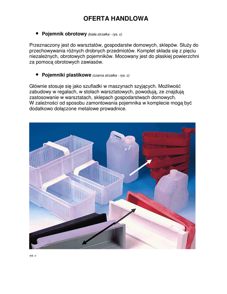 OFERTA HANDLOWA • Pojemnik obrotowy (biała strzałka - rys. c) Przeznaczony jest do warsztatów, gospodarstw domowych, sklepów. Służy do przechowywania różnych drobnych przedmiotów. Komplet składa się z pięciu niezależnych, obrotowych pojemników. Mocowany jest do płaskiej powierzchni za pomocą obrotowych zawiasów. • Pojemniki plastikowe (czarna strzałka - rys. c) Głównie stosuje się jako szufladki w maszynach szyjących. Możliwość zabudowy w regałach, w stołach warsztatowych, powodują, ze znajdują zastosowanie w warsztatach, sklepach gospodarstwach domowych. W zależności od sposobu zamontowania pojemnika w komplecie mogą być dodatkowo dołączone metalowe prowadnice. rys. c • Taśma z wkrętami do mechanicznego montażu (biała strzałka - rys. a) Przeznaczona jest do ręcznych wkrętarek z typowa przystawka podającą. Stosowanie taśm znacznie poprawia efektywność montażu. Wkrętarke możemy obsługiwać tylko jedna ręką, ponieważ wkręty automatycznie podawane są pod trzpień wkręcający. Średnica wkrętów ϕ 2,5 - ϕ 3,5 mm, długości 15 – 35 mm. • Kątowniki montażowe (czarna strzałka - rys. a) Maja zastosowanie w produkcji „architektury” ogrodowej np. plotki, pergole, zadaszenia, meble ogrodowe, wykonane z cynkowanej taśmy stalowej. rys. a • Boczki do parapetów zewnętrznych ( rys. b) Boczek parapetu wykonany jest z tworzywa sztucznego odpornego na promieniowanie słoneczne. Przeznaczony jest jako zakończenie blaszanych parapetów okiennych. Maksymalna szerokość parapetu 300 mm. rys. b. cena boczków 1 kpl – 2,00 zł netto W przypadku zamówień większych ilości istnieje możliwość negocjowania cen.