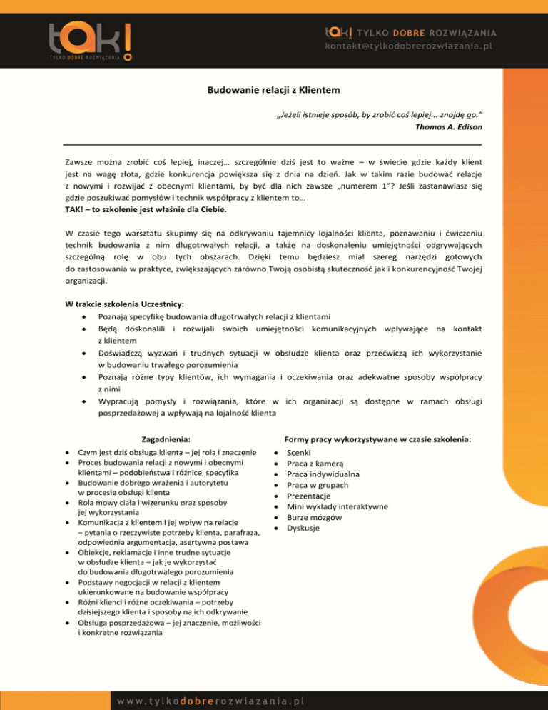 Budowanie relacji z Klientem „Jeżeli istnieje sposób, by zrobić coś lepiej... znajdę go.” Thomas A. Edison Zawsze można zrobić coś lepiej, inaczej… szczególnie dziś jest to ważne – w świecie gdzie każdy klient jest na wagę złota, gdzie konkurencja powiększa się z dnia na dzień. Jak w takim razie budować relacje z nowymi i rozwijać z obecnymi klientami, by być dla nich zawsze „numerem 1”? Jeśli zastanawiasz się gdzie poszukiwać pomysłów i technik współpracy z klientem to… TAK! – to szkolenie jest właśnie dla Ciebie. W czasie tego warsztatu skupimy się na odkrywaniu tajemnicy lojalności klienta, poznawaniu i ćwiczeniu technik budowania z nim długotrwałych relacji, a także na doskonaleniu umiejętności odgrywających szczególną rolę w obu tych obszarach. Dzięki temu będziesz miał szereg narzędzi gotowych do zastosowania w praktyce, zwiększających zarówno Twoją osobistą skuteczność jak i konkurencyjność Twojej organizacji. W trakcie szkolenia Uczestnicy: Poznają specyfikę budowania długotrwałych relacji z klientami Będą doskonalili i rozwijali swoich umiejętności komunikacyjnych wpływające na kontakt z klientem Doświadczą wyzwań i trudnych sytuacji w obsłudze klienta oraz przećwiczą ich wykorzystanie w budowaniu trwałego porozumienia Poznają różne typy klientów, ich wymagania i oczekiwania oraz adekwatne sposoby współpracy z nimi Wypracują pomysły i rozwiązania, które w ich organizacji są dostępne w ramach obsługi posprzedażowej a wpływają na lojalność klienta Zagadnienia: Czym jest dziś obsługa klienta – jej rola i znaczenie Proces budowania relacji z nowymi i obecnymi klientami – podobieństwa i różnice, specyfika Budowanie dobrego wrażenia i autorytetu w procesie obsługi klienta Rola mowy ciała i wizerunku oraz sposoby jej wykorzystania Komunikacja z klientem i jej wpływ na relacje – pytania o rzeczywiste potrzeby klienta, parafraza, odpowiednia argumentacja, asertywna postawa Obiekcje, reklamacje i inne trudne sytuacje w obsłudze klienta – jak je wykorzystać do budowania długotrwałego porozumienia Podstawy negocjacji w relacji z klientem ukierunkowane na budowanie współpracy Różni klienci i różne oczekiwania – potrzeby dzisiejszego klienta i sposoby na ich odkrywanie Obsługa posprzedażowa – jej znaczenie, możliwości i konkretne rozwiązania Formy pracy wykorzystywane w czasie szkolenia: Scenki Praca z kamerą Praca indywidualna Praca w grupach Prezentacje Mini wykłady interaktywne Burze mózgów Dyskusje Dostępne wsparcie po zakończeniu szkolenia: Rozwiązania dopasowane indywidualnie do oraz zakresu szkolenia/pakietu szkoleniowego grupy szkoleniowej, oczekiwań uczestników Po szkoleniu Uczestnicy: Otrzymują zadania związane z treściami szkolenia, które są omawiane w trakcie teleklas/konsultacji telefonicznych/spotkań indywidualnych Biorą udział w teleklasach pozwalających na omówienie zadań poszkoleniowych, znalezienie odpowiedzi na pojawiające się pytania oraz na dzielenie się pierwszymi doświadczeniami Otrzymują przez okres dwóch miesięcy wiadomości z pomocnymi wskazówkami Chętni Uczestnicy są prowadzeni w sposób coachingowy do uzyskania satysfakcjonujących wyników