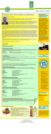 MIB—News No. 5/2008 MOGUNTIA INTERRUS Profesjonaliści w kwestii publikacji prasowych Drodzy Moguntianie, Powoli, ale pewnie zbliŜa się koniec roku. Okazja, aby powiedzieć dziękuję za Państwa wierność, Państwa niestrudzony wkład i entuzjazm dla marki MOGUNTIA. 2008 był i jest rokiem obfitującym w wydarzenia. MOGUNTIA świętowała Jubileusz 105lecia. Peter Murbach – opoka i inspirator ekspansji MOGUNTIA INTERNATIONAL wycofuje się z aktywnego Ŝycia zawodowego. HAYA East China wysyła pierwsze produkty. Intensywnie rosnące ceny surowców wymuszają podwyŜkę cen – pierwszą od lat. Skutki światowego kryzysu dotykają równieŜ zakłady mięsne. Prognozy na rok 2009 są bardzo pesymistyczne w wielu krajach. Niektórzy mówią o tym, Ŝe teraz chodzi o przeŜycie. W kaŜdym razie wychodzimy na przeciw niepewnym czasom. O tyle teŜ waŜne jest, abyśmy zwarli szeregi i jeszcze bardziej zacieśnili i zintensyfikowali współpracę. Wspólnie powinno nam się udać, być lepszym niŜ konkurencja, a na końcu wyjść wzmocnionym z tego kryzysu. W HAYA w Kirchbichl od 1 stycznia 2009 nastąpią zmiany. Wolfgang Leuschner przejmuje zarządzanie produkcją w „najnowocześniejszej fabryce przypraw w Europie“. Pan Leuschner jest nowym pracownikiem w grupie firm MOGUNTIA. Ma 48 lat i pracował dotychczas w róŜnych międzynarodowych zakładach przemysłu spoŜywczego, jako kierownik produkcji i zarządzający produkcją. Panu Leuschner Ŝyczymy wszystkiego dobrego na jego nowym stanowisku i cieszymy się na współpracę. Ernst Santer po krótkim czasie przejściowym obejmie nowe zadania dotyczące całej grupy z zakresu „zarządzania ryzykiem, controllingu i centralnego rozwoju produktu“. Zespół MIB dziękuje Panu Santerowi za jego dotychczasową, owocną współpracę, Ŝyczy wszystkiego dobrego w jego nowym obrębie działania i cieszy się równieŜ na przyszłą współpracę w zmienionej formie. MOGUNTIA INTERNATIONAL Ŝyczy Państwu i Państwa rodzinom wszystkiego najlepszego z okazji Świąt BoŜego Narodzenia oraz oczywiście dobrego startu w Nowym Roku. DuŜo zdrowia! MOGUNTIA jest producentem markowych artykułów. Dobre, innowacyjne produkty o wysokiej, stabilnej jakości, za dobrą cenę są bardzo istotne w odniesieniu sukcesu na rynku. Zgodnie z motto „czyń dobro i mów o tym” publikacje prasowe w czasopismach fachowych są niezastąpioną częścią składową owocnej polityki komunikacyjnej. Image marki rozwija się pozytywnie poprzez artykuły prasowe. Klienci, którzy odnieśli sukces chętnie kupują u wziętych dostawców. Typy wygrywających i zwycięzców szukają bliskości wygraMOGUNTIA INTERRUS jest absolutnym profesjonalistą w zakresie publikacji prasowych. Zespół MOGUNTIA INTERNATIONAL bardzo serdecznie dziękuje MIR, a szczególnie Vadimowi Prijanischnikowi, który odpowiada za treść artykułów. Z radością odsyłamy do załączonej próbki jednego z wielu artykułów prasowych, które opublikował MIR. Jednocześnie chcielibyśmy Państwa prosić, a nawet ośmielić, abyście szli śladem przykładu MIR i przyczyniali się do globalnego rozwoju marki MOGUNTIA. Cieszymy się juŜ teraz na dalszą, owocną współpracę. Johannes Tonauer i cały zespół MIB MOGUNTIA nowe produkty Pełne smaku, intensywne przyprawy do mięsa mielonego #50749 Hackfleisch po ukraińsku Jest nowym produktem do produkcji wszystkich potraw z mięsa mielonego, profil smakowy odpowiada wschodnioeuropejskiemu rynkowi i spełnia oczekiwania konsumenta. Jest to preparat przyprawowy bez dodatków technologicznych, moŜe być stosowany w wysokowydajnych recepturach jak równieŜ w tych czysto mięsnych Dawkowanie: 5g/kg Skład: przyprawy (gorczyca), sól, skrobia, wzmacniacz smaku E621, dekstroza, cukier, aromat Profil smakowy: pieprz, kardamon, kolendra, ziele angielskie Przykładowa receptura Uszlachetniacz smaku nowej generacji, super czysty i naprawdę dobry #7585 AROSTAR® pur Uszlachetniacz smaku bez dodatku hydrolizatu i bez dodatkowych substancji wzmacniających smak. Co waŜne nie zawiera dodatków E podlegających obowiązkowi deklarowania. Stosowany do intensyfikacji smaku wszystkich wędlin i wędzonek. Preparat bez dodatku glutaminianu i hydrolizatu nada Państwa kiełbasom indywidualną nutę. Doskonale komponuje się równieŜ z drobiem, w zupach i sosach. Skład: droŜdŜe i ekstrakt droŜdŜy, przyprawy, sól, cukier, skrobia Znak jakości w podpisie e-mail (instrukcja do Outlooka) Smak – Plus, tradycyjne uszlachetniacze smaku z super aromatem Opracowane tradycyjnie na bazie glutaminianu i wzbogacone duŜą dawką dodatkowego smaku, dla podkreślenia nuty kiełbasy, czy szynki. Szczególnie produkty z udziałem mięsa drobiowego lub MDOM-em zyskują tutaj pełny aromat. Wszystkie inne wyroby mięsne dzięki tym preparatom mają wyraźny smak, tak jak oczekuje tego konsument. #50138 Uszlachetniacz smaku typ dym Produktu nadaje się do wielokierunkowego zastosowania, nie tylko w kiełbasach, lecz równieŜ w szynkach gotowanych, konserwach, zupach i sosach. Szczególnie polecany do wszystkich rodzajów kiełbas, z udziałem gdzie zastosowano mięso drobiowe. Kiełbasy: Konserwy: Wędzonki: MroŜona wątroba: Zupy i sosy: Skład: Profil smakowy: 0,5 - 1 g tego preparatu na kg masy 0,5 - 1 g tego preparatu na kg masy 5 g preparatu na l solanki 2 g preparatu na kg wątroby 0,5 -1 g preparatu na kg Wsypać na sucho; w zupach i sosach najpierw zagotować. sól, wzmacniacz smaku E621, dekstroza, hydrolizat, naturalny aromat korzenny, dym #50139 Uszlachetniacz smaku typ dym czosnek Produkt ma wielorakie zastosowanie, nie tylko do kiełbas, lecz równieŜ do szynek gotowanych, konserw, zup, sosów. Szczególnie nadaje się do kiełbas, produkowanych na bazie MDOM. Kiełbasy: Konserwy: Wędzonki: MroŜona wątroba: Zupy i sosy: Skład: Profil smakowy: 0,5 - 1 g tego preparatu na kg masy 0,5 - 1 g tego preparatu na kg masy 5 g preparatu na l solanki 