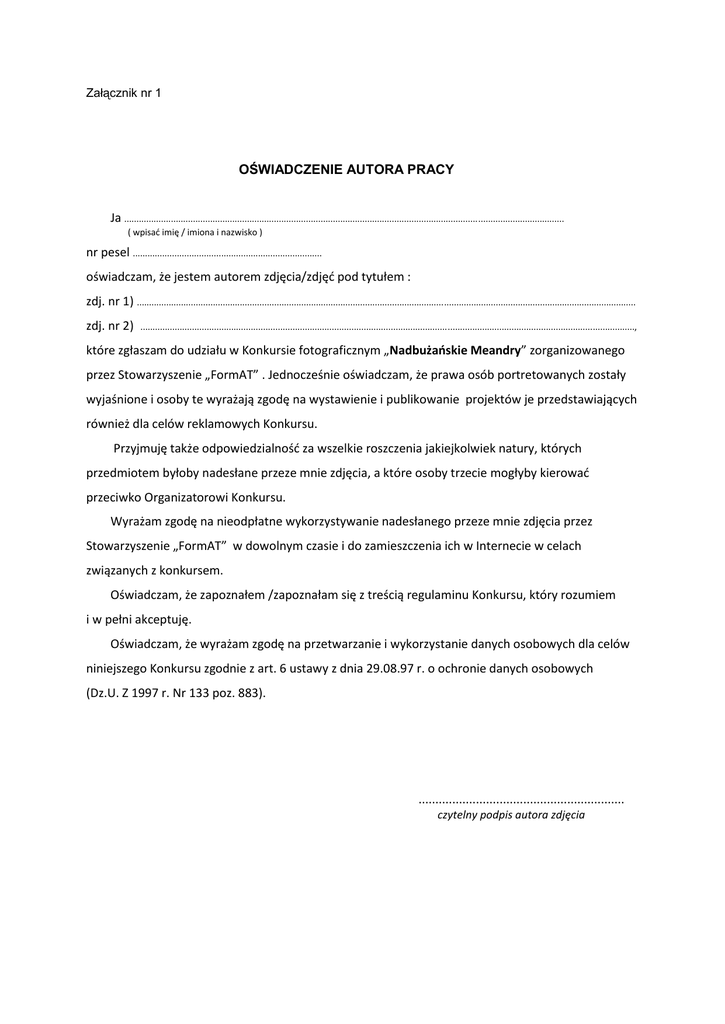 Załącznik nr 1 OŚWIADCZENIE AUTORA PRACY Ja ................................................................................................................................................................................... ( wpisać imię / imiona i nazwisko ) nr pesel ............................................................................. oświadczam, że jestem autorem zdjęcia/zdjęć pod tytułem : zdj. nr 1) ........................................................................................................................................................................................................... zdj. nr 2) ........................................................................................................................................................................................................., które zgłaszam do udziału w Konkursie fotograficznym „Nadbużańskie Meandry” zorganizowanego przez Stowarzyszenie „FormAT” . Jednocześnie oświadczam, że prawa osób portretowanych zostały wyjaśnione i osoby te wyrażają zgodę na wystawienie i publikowanie projektów je przedstawiających również dla celów reklamowych Konkursu. Przyjmuję także odpowiedzialność za wszelkie roszczenia jakiejkolwiek natury, których przedmiotem byłoby nadesłane przeze mnie zdjęcia, a które osoby trzecie mogłyby kierować przeciwko Organizatorowi Konkursu. Wyrażam zgodę na nieodpłatne wykorzystywanie nadesłanego przeze mnie zdjęcia przez Stowarzyszenie „FormAT” w dowolnym czasie i do zamieszczenia ich w Internecie w celach związanych z konkursem. Oświadczam, że zapoznałem /zapoznałam się z treścią regulaminu Konkursu, który rozumiem i w pełni akceptuję. Oświadczam, że wyrażam zgodę na przetwarzanie i wykorzystanie danych osobowych dla celów niniejszego Konkursu zgodnie z art. 6 ustawy z dnia 29.08.97 r. o ochronie danych osobowych (Dz.U. Z 1997 r. Nr 133 poz. 883). ............................................................. czytelny podpis autora zdjęcia