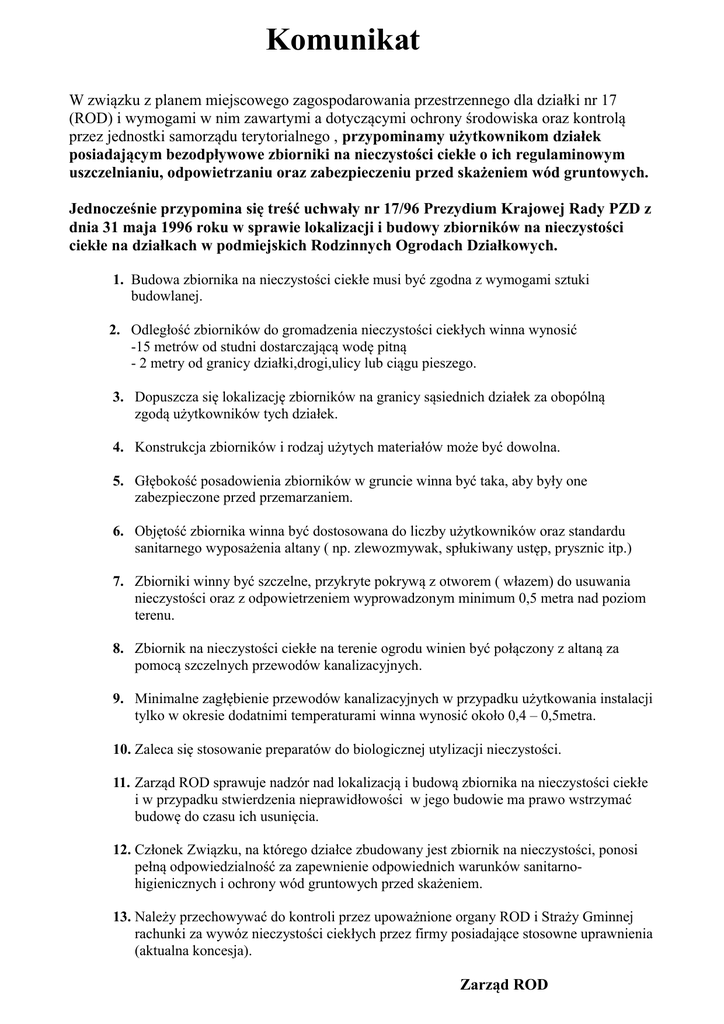 Komunikat W związku z planem miejscowego zagospodarowania przestrzennego dla działki nr 17 (ROD) i wymogami w nim zawartymi a dotyczącymi ochrony środowiska oraz kontrolą przez jednostki samorządu terytorialnego , przypominamy użytkownikom działek posiadającym bezodpływowe zbiorniki na nieczystości ciekłe o ich regulaminowym uszczelnianiu, odpowietrzaniu oraz zabezpieczeniu przed skażeniem wód gruntowych. Jednocześnie przypomina się treść uchwały nr 17/96 Prezydium Krajowej Rady PZD z dnia 31 maja 1996 roku w sprawie lokalizacji i budowy zbiorników na nieczystości ciekłe na działkach w podmiejskich Rodzinnych Ogrodach Działkowych. 1. Budowa zbiornika na nieczystości ciekłe musi być zgodna z wymogami sztuki budowlanej. 2. Odległość zbiorników do gromadzenia nieczystości ciekłych winna wynosić -15 metrów od studni dostarczającą wodę pitną - 2 metry od granicy działki,drogi,ulicy lub ciągu pieszego. 3. Dopuszcza się lokalizację zbiorników na granicy sąsiednich działek za obopólną zgodą użytkowników tych działek. 4. Konstrukcja zbiorników i rodzaj użytych materiałów może być dowolna. 5. Głębokość posadowienia zbiorników w gruncie winna być taka, aby były one zabezpieczone przed przemarzaniem. 6. Objętość zbiornika winna być dostosowana do liczby użytkowników oraz standardu sanitarnego wyposażenia altany ( np. zlewozmywak, spłukiwany ustęp, prysznic itp.) 7. Zbiorniki winny być szczelne, przykryte pokrywą z otworem ( włazem) do usuwania nieczystości oraz z odpowietrzeniem wyprowadzonym minimum 0,5 metra nad poziom terenu. 8. Zbiornik na nieczystości ciekłe na terenie ogrodu winien być połączony z altaną za pomocą szczelnych przewodów kanalizacyjnych. 9. Minimalne zagłębienie przewodów kanalizacyjnych w przypadku użytkowania instalacji tylko w okresie dodatnimi temperaturami winna wynosić około 0,4 – 0,5metra. 10. Zaleca się stosowanie preparatów do biologicznej utylizacji nieczystości. 11. Zarząd ROD sprawuje nadzór nad lokalizacją i budową zbiornika na nieczystości ciekłe i w przypadku stwierdzenia nieprawidłowości w jego budowie ma prawo wstrzymać budowę do czasu ich usunięcia. 12. Członek Związku, na którego działce zbudowany jest zbiornik na nieczystości, ponosi pełną odpowiedzialność za zapewnienie odpowiednich warunków sanitarnohigienicznych i ochrony wód gruntowych przed skażeniem. 13. Należy przechowywać do kontroli przez upoważnione organy ROD i Straży Gminnej rachunki za wywóz nieczystości ciekłych przez firmy posiadające stosowne uprawnienia (aktualna koncesja). Zarząd ROD