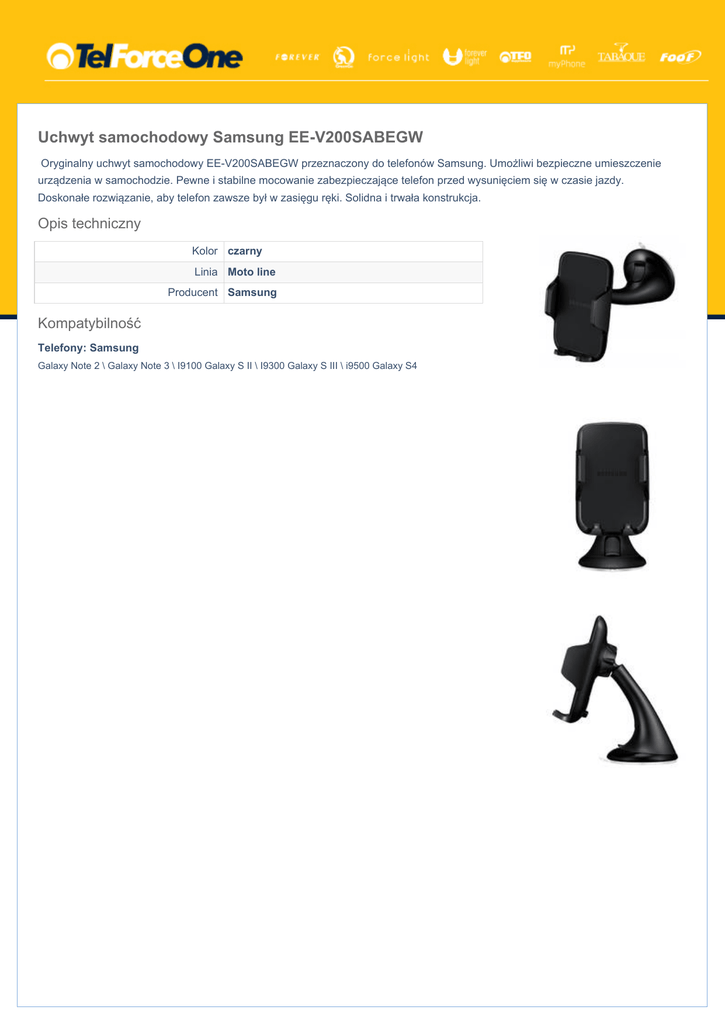 Uchwyt samochodowy Samsung EE-V200SABEGW Oryginalny uchwyt samochodowy EE-V200SABEGW przeznaczony do telefonów Samsung. Umożliwi bezpieczne umieszczenie urządzenia w samochodzie. Pewne i stabilne mocowanie zabezpieczające telefon przed wysunięciem się w czasie jazdy. Doskonałe rozwiązanie, aby telefon zawsze był w zasięgu ręki. Solidna i trwała konstrukcja. Opis techniczny Kolor czarny Linia Moto line Producent Samsung Kompatybilność Telefony: Samsung Galaxy Note 2 \ Galaxy Note 3 \ I9100 Galaxy S II \ I9300 Galaxy S III \ i9500 Galaxy S4