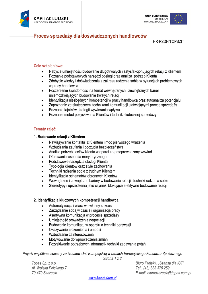 Proces sprzedaży dla doświadczonych handlowców HR-PSDH/TOPSZIT Cele szkoleniowe: Nabycie umiejętności budowanie długotrwałych i satysfakcjonujących relacji z Klientem Poznanie podstawowych narzędzi obsługi oraz analiza potrzeb Klienta Zdobycie wiedzy i doświadczenia z zakresu radzenia sobie w sytuacjach problemowych w pracy handlowca Poszerzenie świadomości na temat wewnętrznych i zewnętrznych barier uniemożliwiających budowanie trwałych relacji Identyfikacja niezbędnych kompetencji w pracy handlowca oraz autoanaliza potencjału Zapoznanie ze skutecznymi technikami komunikacji ułatwiającymi proces sprzedaży Poznanie tajników strategii wywierania wpływu Poznanie metod pozyskiwania Klientów i technik skutecznej sprzedaży Tematy zajęć: 1. Budowanie relacji z Klientem Nawiązywanie kontaktu z Klientem i moc pierwszego wrażenia Wzbudzania zaufania i poczucia bezpieczeństwa Analiza potrzeb i celów klienta w oparciu o przeprowadzony wywiad Oferowanie wsparcia merytorycznego Podstawowe narzędzia obsługi Klienta Typologia klientów oraz style zachowania Techniki radzenia sobie z trudnym Klientem Identyfikacja schematów obronnych Klientów Wewnętrzne i zewnętrzne bariery w budowaniu relacji i techniki radzenia sobie Stereotypy i uprzedzenia jako czynniki blokujące efektywne budowanie relacji 2. Identyfikacja kluczowych kompetencji handlowca Automotywacja i wiara we własny sukces Zarządzanie sobą w czasie i organizacja pracy Asertywna komunikacja w procesie sprzedaży Umiejętność prowadzenia negocjacji Budowanie komunikatu w oparciu o techniki perswazji Okazywanie zrozumienia i empatii Wzbudzanie zainteresowania Motywowanie do wprowadzenia zmian Pozyskiwanie potrzebnych informacji- techniki zadawania pytań Projekt współfinansowany ze środków Unii Europejskiej w ramach Europejskiego Funduszu Społecznego Strona 1 z 2 Topas Sp. z o.o. Biuro Projektu „Szansa dla ICT” Al. Wojska Polskiego 7 Tel.: (48) 883 375 259 70-470 Szczecin E-mail: [email protected] www.topas.com.pl Proces sprzedaży dla doświadczonych handlowców HR-PSDH/TOPSZIT Profil idealnego handlowca Indywidualna analiza własnego potencjału w kontekście pracy handlowca 3. Komunikacja i autoprezentacja Podstawowe zagadnienia z zakresu skutecznej komunikacji Komunikacja bezpośrednia a komunikacja telefoniczna Budowanie wiarygodnego wizerunku profesjonalisty Psychologiczne mechanizmy i techniki wywierania wpływu Wewnętrzne i zewnętrzne bariery w komunikacji Analiza własnego stylu komunikowania się 4. Zarządzanie procesem sprzedaży Identyfikacja grupy docelowej i sposoby pozyskiwania Klienteli Poszczególne etapy procesu sprzedaży Techniki sprzedaży oraz ich dopasowanie do odbiorcy Przygotowanie prezentacji produktu z wykorzystaniem języka korzyści Identyfikacja zasobów koniecznych do realizacji zamierzonych celów Skuteczne zamykanie procesu sprzedaży Metody szkolenia: Wykład i dyskusje Ćwiczenia i gry grupowe Studia przypadków Symulacje Dyskusje moderowane Czas trwania: 3 dni Projekt współfinansowany ze środków Unii Europejskiej w ramach Europejskiego Funduszu Społecznego Strona 2 z 2 Topas Sp. z o.o. Biuro Projektu „Szansa dla ICT” Al. Wojska Polskiego 7 Tel.: (48) 883 375 259 70-470 Szczecin E-mail: [email protected] www.topas.com.pl