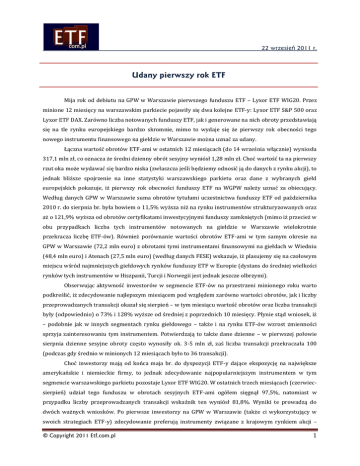22 wrzesień 2011 r. Udany pierwszy rok ETF Mija rok od debiutu na GPW w Warszawie pierwszego funduszu ETF – Lyxor ETF WIG20. Przez minione 12 miesięcy na warszawskim parkiecie pojawiły się dwa kolejne ETF-y: Lyxor ETF S&P 500 oraz Lyxor ETF DAX. Zarówno liczba notowanych funduszy ETF, jak i generowane na nich obroty przedstawiają się na tle rynku europejskiego bardzo skromnie, mimo to wydaje się że pierwszy rok obecności tego nowego instrumentu finansowego na giełdzie w Warszawie można uznać za udany. Łączna wartość obrotów ETF-ami w ostatnich 12 miesiącach (do 14 września włącznie) wyniosła 317,1 mln zł, co oznacza że średni dzienny obrót sesyjny wyniósł 1,28 mln zł. Choć wartość ta na pierwszy rzut oka może wydawać się bardzo niska (zwłaszcza jeśli będziemy odnosić ją do danych z rynku akcji), to jednak bliższe spojrzenie na inne statystyki warszawskiego parkietu oraz dane z wybranych giełd europejskich pokazuje, iż pierwszy rok obecności funduszy ETF na WGPW należy uznać za obiecujący. Według danych GPW w Warszawie suma obrotów tytułami uczestnictwa funduszy ETF od października 2010 r. do sierpnia br. była bowiem o 11,5% wyższa niż na rynku instrumentów strukturyzowanych oraz aż o 121,9% wyższa od obrotów certyfikatami inwestycyjnymi funduszy zamkniętych (mimo iż przecież w obu przypadkach liczba tych instrumentów notowanych na giełdzie w Warszawie wielokrotnie przekracza liczbę ETF-ów). Również porównanie wartości obrotów ETF-ami w tym samym okresie na GPW w Warszawie (72,2 mln euro) z obrotami tymi instrumentami finansowymi na giełdach w Wiedniu (48,4 mln euro) i Atenach (27,5 mln euro) (według danych FESE) wskazuje, iż plasujemy się na czołowym miejscu wśród najmniejszych giełdowych rynków funduszy ETF w Europie (dystans do średniej wielkości rynków tych instrumentów w Hiszpanii, Turcji i Norwegii jest jednak jeszcze olbrzymi). Obserwując aktywność inwestorów w segmencie ETF-ów na przestrzeni minionego roku warto podkreślić, iż zdecydowanie najlepszym miesiącem pod względem zarówno wartości obrotów, jak i liczby przeprowadzanych transakcji okazał się sierpień – w tym miesiącu wartość obrotów oraz liczba transakcji były (odpowiednio) o 73% i 128% wyższe od średniej z poprzednich 10 miesięcy. Płynie stąd wniosek, iż – podobnie jak w innych segmentach rynku giełdowego – także i na rynku ETF-ów wzrost zmienności sprzyja zainteresowaniu tym instrumentem. Potwierdzają to także dane dzienne – w pierwszej połowie sierpnia dzienne sesyjne obroty często wynosiły ok. 3-5 mln zł, zaś liczba transakcji przekraczała 100 (podczas gdy średnio w minionych 12 miesiącach było to 36 transakcji). Choć inwestorzy mają od końca maja br. do dyspozycji ETF-y dające ekspozycję na największe amerykańskie i niemieckie firmy, to jednak zdecydowanie najpopularniejszym instrumentem w tym segmencie warszawskiego parkietu pozostaje Lyxor ETF WIG20. W ostatnich trzech miesiącach (czerwiecsierpień) udział tego funduszu w obrotach sesyjnych ETF-ami ogółem sięgnął 97,5%, natomiast w przypadku liczby przeprowadzanych transakcji wskaźnik ten wyniósł 81,8%. Wyniki te prowadzą do dwóch ważnych wniosków. Po pierwsze inwestorzy na GPW w Warszawie (także ci wykorzystujący w swoich strategiach ETF-y) zdecydowanie preferują instrumenty związane z krajowym rynkiem akcji – © Copyright 2011 Etf.com.pl 1 Udany pierwszy rok ETF 22 wrzesień 2011 r. powinni to wziąć pod uwagę emitenci ETF-ów planując wprowadzenie na rynek w Warszawie kolejnych tego typu instrumentów. Według sondy przeprowadzonej przez portal etf.com.pl inwestorzy najbardziej czekają na fundusz ETF typu „short” na WIG20, pozwalający zarabiać na spadkach tego indeksu (o potencjale funduszy realizujących tego typu strategię można było przekonać się w sierpniu na przykładzie tradycyjnych funduszy inwestycyjnych Quercus short i Alior Short Equity); stosunkowo dużym zainteresowaniem mogłyby cieszyć się również ETF-y na WIG i mWIG40. Po drugie zdecydowana dominacja funduszu odwzorowującego indeks WIG20 pokazuje, iż rynek ETF-ów w Polsce należy obecnie do krajowych inwestorów indywidualnych. Potwierdzają to również dane na temat wartości transakcji ETF-ami (średnio statystycznie jest to 29,6 tys. zł, choć często jest to zaledwie kilka tysięcy złotych) oraz liczby transakcji pakietowych (tylko 10 w minionym roku). Niewątpliwie bardzo ważnym czynnikiem wpływającym na zainteresowanie ETF-ami jest koniunktura giełdowa (zwłaszcza w sytuacji, gdy na naszym rynku funkcjonują jedynie instrumenty pozwalające zarabiać podczas wzrostów) oraz sytuacja na rynku walutowym (w przypadku funduszy replikujących indeksy denominowane w obcych walutach). Inwestorzy, którzy nabyli tytuły uczestnictwa funduszu Lyxor ETF WIG20 na pierwszej sesji stracili przez rok (do 14 września) 13,6% (WIG20 w tym samym czasie zniżkował o 14,7%). To oczywiście skutek gwałtownej przeceny jaka dotknęła nasz (i nie tylko) rynek na początku sierpnia – do tego momentu rynkowe wyceny ETFW20L utrzymywały się bowiem powyżej wyceny z pierwszej sesji (w najlepszym dla dużych spółek okresie, tj. w kwietniu br., przekraczały ten poziom o ponad 10%). Nie należy też zapominać, iż faktyczna strata z inwestycji w Lyxor ETF WIG20 jest mniejsza, gdyż fundusz wypłacił na początku marca br. każdemu jego uczestnikowi 4,59 zł dywidendy (na 1 walor). Bardzo pozytywnie ocenić należy także stopień dopasowania wyników funduszu do wyników naśladowanego przezeń indeksu – potwierdza to m.in. bardzo wysoka wartość współczynnika korelacji (0,99). Mówiąc o dywidendzie wypłaconej przez fundusz Lyxor ETF WIG20 należy też przypomnieć, iż jest to główny czynnik „odpowiedzialny” za istniejące różnice między notowaniami jego tytułów uczestnictwa a wartością indeksu WIG20 (