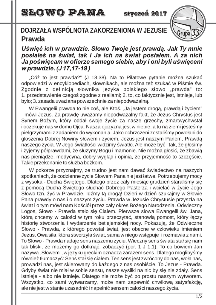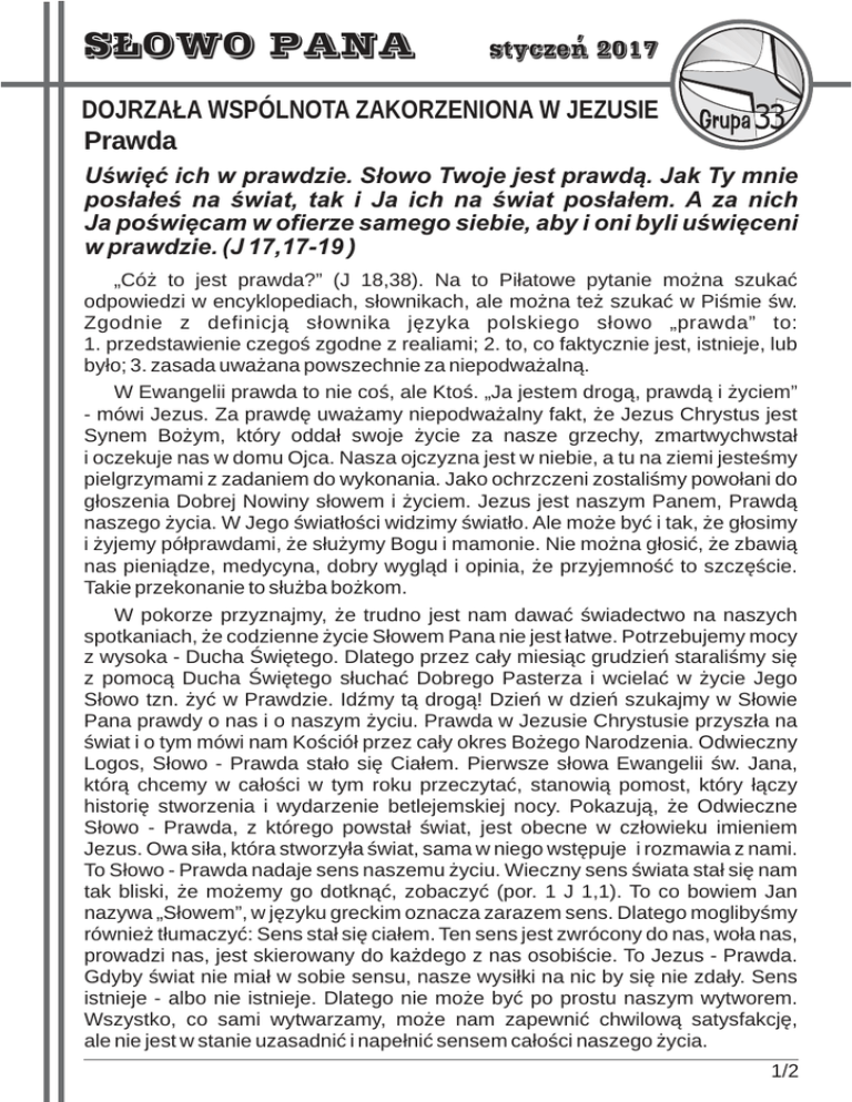 SŁOWO PANA ‚ styczen 2017 DOJRZAŁA WSPÓLNOTA ZAKORZENIONA W JEZUSIE Prawda Uświęć ich w prawdzie. Słowo Twoje jest prawdą. Jak Ty mnie posłałeś na świat, tak i Ja ich na świat posłałem. A za nich Ja poświęcam w ofierze samego siebie, aby i oni byli uświęceni w prawdzie. (J 17,17-19 ) „Cóż to jest prawda?” (J 18,38). Na to Piłatowe pytanie można szukać odpowiedzi w encyklopediach, słownikach, ale można też szukać w Piśmie św. Zgodnie z definicją słownika języka polskiego słowo „prawda” to: 1. przedstawienie czegoś zgodne z realiami; 2. to, co faktycznie jest, istnieje, lub było; 3. zasada uważana powszechnie za niepodważalną. W Ewangelii prawda to nie coś, ale Ktoś. „Ja jestem drogą, prawdą i życiem” - mówi Jezus. Za prawdę uważamy niepodważalny fakt, że Jezus Chrystus jest Synem Bożym, który oddał swoje życie za nasze grzechy, zmartwychwstał i oczekuje nas w domu Ojca. Nasza ojczyzna jest w niebie, a tu na ziemi jesteśmy pielgrzymami z zadaniem do wykonania. Jako ochrzczeni zostaliśmy powołani do głoszenia Dobrej Nowiny słowem i życiem. Jezus jest naszym Panem, Prawdą naszego życia. W Jego światłości widzimy światło. Ale może być i tak, że głosimy i żyjemy półprawdami, że służymy Bogu i mamonie. Nie można głosić, że zbawią nas pieniądze, medycyna, dobry wygląd i opinia, że przyjemność to szczęście. Takie przekonanie to służba bożkom. W pokorze przyznajmy, że trudno jest nam dawać świadectwo na naszych spotkaniach, że codzienne życie Słowem Pana nie jest łatwe. Potrzebujemy mocy z wysoka - Ducha Świętego. Dlatego przez cały miesiąc grudzień staraliśmy się z pomocą Ducha Świętego słuchać Dobrego Pasterza i wcielać w życie Jego Słowo tzn. żyć w Prawdzie. Idźmy tą drogą! Dzień w dzień szukajmy w Słowie Pana prawdy o nas i o naszym życiu. Prawda w Jezusie Chrystusie przyszła na świat i o tym mówi nam Kościół przez cały okres Bożego Narodzenia. Odwieczny Logos, Słowo - Prawda stało się Ciałem. Pierwsze słowa Ewangelii św. Jana, którą chcemy w całości w tym roku przeczytać, stanowią pomost, który łączy historię stworzenia i wydarzenie betlejemskiej nocy. Pokazują, że Odwieczne Słowo - Prawda, z którego powstał świat, jest obecne w człowieku imieniem Jezus. Owa siła, która stworzyła świat, sama w niego wstępuje i rozmawia z nami. To Słowo - Prawda nadaje sens naszemu życiu. Wieczny sens świata stał się nam tak bliski, że możemy go dotknąć, zobaczyć (por. 1 J 1,1). To co bowiem Jan nazywa „Słowem”, w języku greckim oznacza zarazem sens. Dlatego moglibyśmy również tłumaczyć: Sens stał się ciałem. Ten sens jest zwrócony do nas, woła nas, prowadzi nas, jest skierowany do każdego z nas osobiście. To Jezus - Prawda. Gdyby świat nie miał w sobie sensu, nasze wysiłki na nic by się nie zdały. Sens istnieje - albo nie istnieje. Dlatego nie może być po prostu naszym wytworem. Wszystko, co sami wytwarzamy, może nam zapewnić chwilową satysfakcję, ale nie jest w stanie uzasadnić i napełnić sensem całości naszego życia. 1/2 SŁOWO PANA Uświęć ich w prawdzie. Słowo Twoje jest prawdą. Jak Ty mnie posłałeś na świat, tak i Ja ich na świat posłałem. A za nich Ja poświęcam w ofierze samego siebie, aby i oni byli uświęceni w prawdzie. (J 17,17-19 ) Tak należy rozumieć stanowisko Kościoła, który uważa, że sens nie jest konstruowany przez nas, lecz pochodzi od Boga, jest czymś, na czym się opieramy. Jak mamy żyć tym Słowem Pana? Wszystko streszcza się w nakazie: „miłujcie się wzajemnie”, a „miłość współweseli się z prawdą” (1 Kor 13,6). „Poznajcie prawdę, a prawda was wyzwoli” powiedział Jezus. Mamy zatem obowiązek poznawania Go i Jego nauki. Co zatem studiuję? Co czytam? Czy sięgam po Katechizm Kościoła Katolickiego? Co stanowi moją codzienną, tygodniową katechezę? Czy szukam odpowiedzi na pytanie jak żyć? A żyć trzeba zgodnie z sumieniem dobrze ukształtowanym. Dobrze - to znaczy przez Chrystusową prawdę. A ona pobrzmiewa nie tylko w sercach chrześcijan. Mahatma Gandhi mówił: „Zwyciężajcie nienawiść miłością, nieprawdę - prawdą, przemoc cierpieniem”. Żyjmy w Prawdzie, a nie w kłamstwie. „Kłamstwo nie staje się prawdą tylko dlatego, że wierzy w nie więcej osób” (Oscar Wilde). Słowo, które stworzyło wszystko jest Miłością, Ono rozświetla nasz umysł, abyśmy potrafili dostrzec przesłanie ukryte w stworzeniu, ukryte także w naszym sercu, że początkiem wszystkiego jest stwórcza Mądrość, że ta Mądrość jest też miłością i dobrocią. Chrystus przekazuje nam, że kto poznaje prawdę, cieszy się darem wolności wewnętrznej. Wolny człowiek czerpiąc z daru ofiary Chrystusa uświęca siebie i innych. To Chrystus poprzez swoją nieograniczoną miłość sprzeciwia się kłamstwu świata i wyprowadza na drogę prawdy błądzących w ciemności. Pragnie, aby w naszych sercach pojawiła się nadzieja świętości, godności, sprawiedliwości, uczciwości, radości i pokoju. Świadectwo Nasza mała grupa formowała się cały rok, by po rekolekcjach ewangelizacyjnych w Wiśle powiedzieć głośno i wyraźnie: Tak Jezu, Ty jesteś Moim Panem i Zbawicielem. Co mnie urzekło, gdy po raz pierwszy przyszłam na spotkanie grupy: naturalność, prawdomówność i niezwykły pokój. Wtedy poczułam więź, jak w domu, mimo, że byłam pośród pierwszy raz spotkanych osób. Od razu wiedziałam, że jestem we właściwym miejscu. Rekolekcje, wspólne spotkania, wyjazdy i modlitwa wzajemna tylko mnie o tym utwierdzają. Ale by tak było potrzeba współpracy z Jezusem, w osobistym spotkaniu na modlitwie oraz wprowadzeniu słowa w czyn. Basia, Grupa XXII „Wprowadzajcie słowo w czyn” (Jk 1,22) 2/2