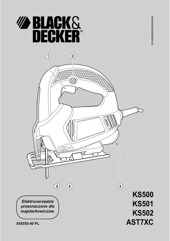 www.blackanddecker.eu Elektronarzędzie przeznaczone dla majsterkowiczów. 555555-40 PL KS500 KS501 KS502 AST7XC 2 POLSKI Użycie przewodu zasilającego przeznaczonego do stosowania poza pomieszczeniami zamkniętymi zmniejsza ryzyko porażenia prądem elektrycznym. Przeznaczenie Opisywana wyrzynarka Black & Decker przeznaczona jest do cięcia drewna, tworzyw sztucznych i blach. Narzędzie przeznaczone jest wyłącznie do użytku amatorskiego. 3. Środki ochrony osobistej a. W czasie pracy elektronarzędziem zachowaj czujność, patrz uważnie i kieruj się zdrowym rozsądkiem. Nie używaj elektronarzędzi, jeżeli jesteś zmęczony, pod wpływem narkotyków, alkoholu czy leków. Nawet chwila nieuwagi, w czasie pracy elektronarzędziem, może doprowadzić do poważnego uszkodzenia ciała. b. Używaj sprzętu ochrony osobistej. Zawsze zakładaj okulary ochronne. Stosowanie odpowiedniego do sytuacji sprzętu ochrony osobistej takiego, jak maska przeciwpyłowa, buty z podeszwą antypoślizgową, hełm ochronny lub ochrona słuchu, zmniejsza ryzyko uszkodzenia ciała. c. Unikaj przypadkowego włączenia. Przed włożeniem wtyczki do gniazda upewnij się, czy wyłącznik znajduje się w pozycji wyłączone. Trzymanie palca na wyłączniku w czasie przenoszenia elektronarzędzia oraz wkładanie wtyczki do gniazda, gdy przełącznik jest wciśnięty, zwiększa ryzyko uszkodzenia ciała. d. Przed uruchomieniem narzędzia usuń wszelkie klucze i narzędzia do regulacji. Pozostawienie klucza lub narzędzia do regulacji połączonego z częściami wirującymi elektronarzędzia może spowodować uszkodzenie ciała. e. Nie wychylaj się. Zadbaj o dobre podparcie nóg i stabilną postawę. Umożliwia to lepszą kontrolę nad pracą urządzenia w nagłych sytuacjach. f. Załóż odpowiedni strój. Nie zakładaj luźnych ubrań i biżuterii. Nie dopuszczaj do zbliżania się włosów, ubrania i rękawic do ruchomych części. Luźne ubranie, biżuteria lub długie włosy mogą zostać pochwycone przez ruchome części. g. Upewnij się, że dostępne urządzenia do zbierania pyłów są przyłączone i właściwie pracują. Używanie takich urządzeń może zmniejszyć zagrożenia związane z obecnością pyłów. Ogólne zasady bezpiecznej pracy Uważnie przeczytaj całą instrukcję obsługi. Nie zastosowanie się do wszystkich poniższych zaleceń może być przyczyną porażenia prądem elektrycznym, pożaru i / lub uszkodzenia ciała. Pojęcie „elektronarzędzie“ używane w poniższych ostrzeżeniach dotyczy narzędzi zasilanych sieciowo (przewodem zasilającym) oraz zasilanych bateriami lub akumulatorami (bezprzewodowych). ZACHOWAJ INSTRUKCJĘ OBSŁUGI. 1. Miejsce pracy a. Utrzymuj miejsce pracy w czystości i dbaj o dobre oświetlenie. Brak porządku i złe oświetlenie są częstą przyczyną wypadków. b. Nie używaj elektronarzędzi w strefach zagrożonych wybuchem, na przykład w pobliżu palnych cieczy, gazów lub pyłów. W czasie pracy elektronarzędziami powstają iskry, które mogą spowodować zapłon pyłów lub oparów. c. W czasie pracy elektronarzędziami nie pozwalaj na przebywanie w pobliżu dzieci i innych osób postronnych. Brak skupienia może spowodować utratę kontroli nad narzędziem. 2. O c h r o n a p r z e d p o r a ż e n i e m p r ą d e m elektrycznym a. Gniazdo musi być dostosowane do wtyczki elektronarzędzia. Nie wolno dokonywać przeróbek wtyczki. Nie wolno używać przejściówek do zasilania uziemionych elektronarzędzi. Nie przerabiane wtyczki i odpowiednie gniazda zmniejszają ryzyko porażenia prądem elektrycznym. b. Unikaj bezpośredniego kontaktu ciała z uziemionymi i zerowanymi elementami takimi, jak rurociągi, grzejniki, kuchenki i lodówki. Ryzyko porażenia prądem elektrycznym wzrasta, jeśli twoje ciało jest zerowane lub uziemione. c. Nie narażaj elektronarzędzi na działanie deszczu lub zwiększonej wilgotności. Woda wnikająca do wnętrza elektronarzędzia zwiększa ryzyko porażenia prądem elektrycznym. d. Nie wolno niszczyć przewodu zasilającego. Nie podnoś, nie ciągnij i nie wyciągaj z gniazda wtyczki, poprzez ciągnięcie za przewód zasilający elektronarzędzie. Chroń przewód zasilający przed kontaktem z gorącymi elementami, olejami, ostrymi krawędziami i ruchomymi częściami. Uszkodzenie lub zaplątanie przewodu zasilającego zwiększa ryzyko porażenia prądem elektrycznym. e. W czasie pracy elektronarzędziem poza pomieszczeniami zamkniętymi, należy używać przystosowanych do tego przedłużaczy. 4. Obsługa i konserwacja elektronarzędzi a. Nie wolno przeciążać elektronarzędzi. Zawsze używaj elektronarzędzi odpowiednich dla danego zastosowania. Dzięki odpowiednim elektronarzędziom wykonasz pracę lepiej i w sposób bezpieczny, w tempie, do jakiego narzędzie zostało zaprojektowane. b. Nie wolno używać elektronarzędzia z zepsutym wyłącznikiem, który nie pozwala na sprawne włączanie i wyłączanie. Elektronarzędzie, którego pracy nie można kontrolować wyłącznikiem, stanowi zagrożenie i musi zostać naprawione. c. Przed przystąpieniem do regulacji, wymiany akcesoriów oraz do przechowywania, należy odłączyć wtyczkę od źródła zasilania. Stosowanie takich środków zapobiegawczych 3 zwiększa bezpieczeństwo i zmniejsza ryzyko przypadkowego uruchomienia elektronarzędzia. d. Nieużywane elektronarzędzia przechowuj poza zasięgiem dzieci. Nie zezwalaj osobom niedoświadczonym lub niezaznajomionym z instrukcją obsługi na pracę elektronarzędziem. Elektronarzędzia obsługiwane przez osoby nieprzygotowane stanowią zagrożenie. e. R e g u l a r n i e d o k o n u j k o n s e r w a c j i elektronarzędzi. Sprawdź, czy ruchome części są właściwie połączone i zamocowane, czy części nie są uszkodzone oraz skontroluj wszelkie inne elementy mogące mieć wpływ na pracę elektronarzędzia. Wszelkie uszkodzenia urządzenia, należy naprawić przed rozpoczęciem pracy. Wiele wypadkó
