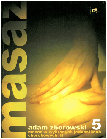 • ■3 adam Zborowski w masaż w wybranych jednostkach chorobowych II Adam Zborowski MASAŻ W WYBRANYCH JEDNOSTKACH CHOROBOWYCH cz.II wydanie II zmienione Kraków 2 0 1 2 S p is treści Od autora........................................................... ................ 11 W prowadzenie.................................................................. 13 1. CHOROBY UKŁADU O D D E C H O W EG O ........15 Wprowadzenie.................................................................... 16 Leczenie........................................................................ 34 M asaż...................................................................... 42 Masaż po leczeniu chirurgicznym........................46 Przewlekła obturacyjna choroba płuc - P O C h P ........48 Leczenie........................................................................51 M asaż...................................................................... 52 Przewlekłe zapalenie o sk rze li........................................ 68 Leczenie........................................................................ 69 Rozedma p łu c ....................................................................70 Leczenie........................................................................ 72 Rozstrzenie oskrzeli......................................................... 73 Leczenie........................................................................ 75 M asaż...................................................................... 76 A stm a oskrzelow a............................................................ 78 Leczenie........................................................................ 81 Zabiegi fizykalne w okresie napadu............................ 83 M asaż...................................................................... 84 Zabiegi fizykalne w okresie rem isji............................86 M asaż...................................................................... 86 Zapalenie p łu c ...................................................................90 Leczenie........................................................................ 93 5 Zabiegi fizykalne w I okresie....................................... 94 M asaż...................................................................... 95 Zabiegi fizykalne w II okresie.................................... 95 M asaż...................................................................... 96 Zabiegi fizykalne w III okresie...................................97 M asaż...................................................................... 97 2. CHOROBY UKŁADU SERCOWO-NACZYNIOW E G O .............................................................................. 101 Wprowadzenie..................................................................102 Leczenie zachowawcze..............................................114 M asaż.....................................................................118 Koncepcja opracowania obwodowego........120 Koncepcja opracowania centralnego........... 127 Koncepcja połączonego opracowania obwodo wego z elementami gimnastyki.................... 134 Opracowanie segmentame............................ 137 Leczenie inwazyjne....................................................140 Uwagi do masażu po leczeniu inwazyjnym . . . 146 CHOROBY SERCA.........................................................147 Zapalenie o sierdzia........................................................ 148 Leczenie...................................................................... 151 M asaż.....................................................................152 Infekcyjne zapalenie w sierdzia.............. 154 Leczenie...................................................................... 160 M asaż.....................................................................162 Zapalenie mięśnia sercow ego....................................... 165 Leczenie...................................................................... 166 M asaż.....................................................................167 K ardiom iopatie............................................................... 169 Leczenie...................................................................... 171 M asaż.....................................................................171 6 Choroba niedokrwienna serca - C h N S .......................173 Leczenie...................................................................... 174 M asaż.................................................................... 176 Zawał mięśnia sercowego - M I .....................................178 Leczenie...................................................................... 179 M asaż.................................................................... 180 CHOROBY NACZYŃ OBWODOWYCH................... 182 Stw ardnienie tętnic - m iażdżyca..................................183 L eczenie...................................................................... 184 M asaż.................................................................... 185 Zakrzepowo-zarostowe zapalenie naczyń - TAO . . . 187 Leczenie...................................................................... 189 M asaż.................................................................... 191 O bjaw R a y n au d a............................................................196 Leczenie...................................................................... 198 M asaż.................................................................... 199 Akrocyjanoza - samoistna sinica kończyn................ 202 Leczenie......................................................................203 M asaż....................................................................203 3. CHOROBY UKŁADU N E R W O W E G O ........... 207 W prowadzenie................................................................. 208 Plastyczność układu nerwowo-mięśniowego.........216 Spastyka a 