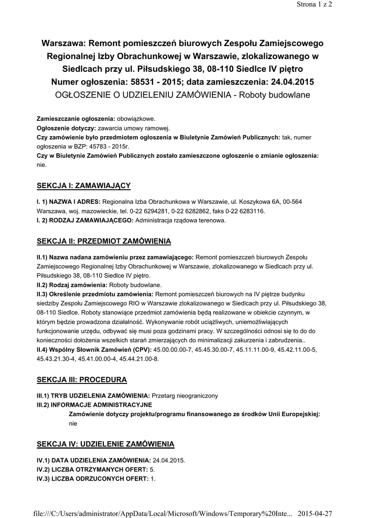 Strona 1 z 2 Warszawa: Remont pomieszczeń biurowych Zespołu Zamiejscowego Regionalnej Izby Obrachunkowej w Warszawie, zlokalizowanego w Siedlcach przy ul. Piłsudskiego 38, 08-110 Siedlce IV piętro Numer ogłoszenia: 58531 - 2015; data zamieszczenia: 24.04.2015 OGŁOSZENIE O UDZIELENIU ZAMÓWIENIA - Roboty budowlane Zamieszczanie ogłoszenia: obowiązkowe. Ogłoszenie dotyczy: zawarcia umowy ramowej. Czy zamówienie było przedmiotem ogłoszenia w Biuletynie Zamówień Publicznych: tak, numer ogłoszenia w BZP: 45783 - 2015r. Czy w Biuletynie Zamówień Publicznych zostało zamieszczone ogłoszenie o zmianie ogłoszenia: nie. SEKCJA I: ZAMAWIAJĄCY I. 1) NAZWA I ADRES: Regionalna Izba Obrachunkowa w Warszawie, ul. Koszykowa 6A, 00-564 Warszawa, woj. mazowieckie, tel. 0-22 6294281, 0-22 6282862, faks 0-22 6283116. I. 2) RODZAJ ZAMAWIAJĄCEGO: Administracja rządowa terenowa. SEKCJA II: PRZEDMIOT ZAMÓWIENIA II.1) Nazwa nadana zamówieniu przez zamawiającego: Remont pomieszczeń biurowych Zespołu Zamiejscowego Regionalnej Izby Obrachunkowej w Warszawie, zlokalizowanego w Siedlcach przy ul. Piłsudskiego 38, 08-110 Siedlce IV piętro. II.2) Rodzaj zamówienia: Roboty budowlane. II.3) Określenie przedmiotu zamówienia: Remont pomieszczeń biurowych na IV piętrze budynku siedziby Zespołu Zamiejscowego RIO w Warszawie zlokalizowanego w Siedlcach przy ul. Piłsudskiego 38, 08-110 Siedlce. Roboty stanowiące przedmiot zamówienia będą realizowane w obiekcie czynnym, w którym będzie prowadzona działalność. Wykonywanie robót uciążliwych, uniemożliwiających funkcjonowanie urzędu, odbywać się musi poza godzinami pracy. W szczególności odnosi się to do do konieczności dołożenia wszelkich starań zmierzających do minimalizacji zakurzenia i zabrudzenia.. II.4) Wspólny Słownik Zamówień (CPV): 45.00.00.00-7, 45.45.30.00-7, 45.11.11.00-9, 45.42.11.00-5, 45.43.21.30-4, 45.41.00.00-4, 45.44.21.00-8. SEKCJA III: PROCEDURA III.1) TRYB UDZIELENIA ZAMÓWIENIA: Przetarg nieograniczony III.2) INFORMACJE ADMINISTRACYJNE Zamówienie dotyczy projektu/programu finansowanego ze środków Unii Europejskiej: nie SEKCJA IV: UDZIELENIE ZAMÓWIENIA IV.1) DATA UDZIELENIA ZAMÓWIENIA: 24.04.2015. IV.2) LICZBA OTRZYMANYCH OFERT: 5. IV.3) LICZBA ODRZUCONYCH OFERT: 1. file:///C:/Users/administrator/AppData/Local/Microsoft/Windows/Temporary%20Inte... 2015-04-27 Strona 2 z 2 IV.4) NAZWA I ADRES WYKONAWCY, KTÓREMU UDZIELONO ZAMÓWIENIA: Usługi Budowlane Marek Siuchta, Ruchna 58, 07-100 Węgrów, kraj/woj. mazowieckie. IV.5) Szacunkowa wartość zamówienia (bez VAT): 158316,00 PLN. IV.6) INFORMACJA O CENIE WYBRANEJ OFERTY ORAZ O OFERTACH Z NAJNIŻSZĄ I NAJWYŻSZĄ CENĄ Cena wybranej oferty: 139693,87 Oferta z najniższą ceną: 124227,72 / Oferta z najwyższą ceną: 195000,85 Waluta: PLN. file:///C:/Users/administrator/AppData/Local/Microsoft/Windows/Temporary%20Inte... 2015-04-27