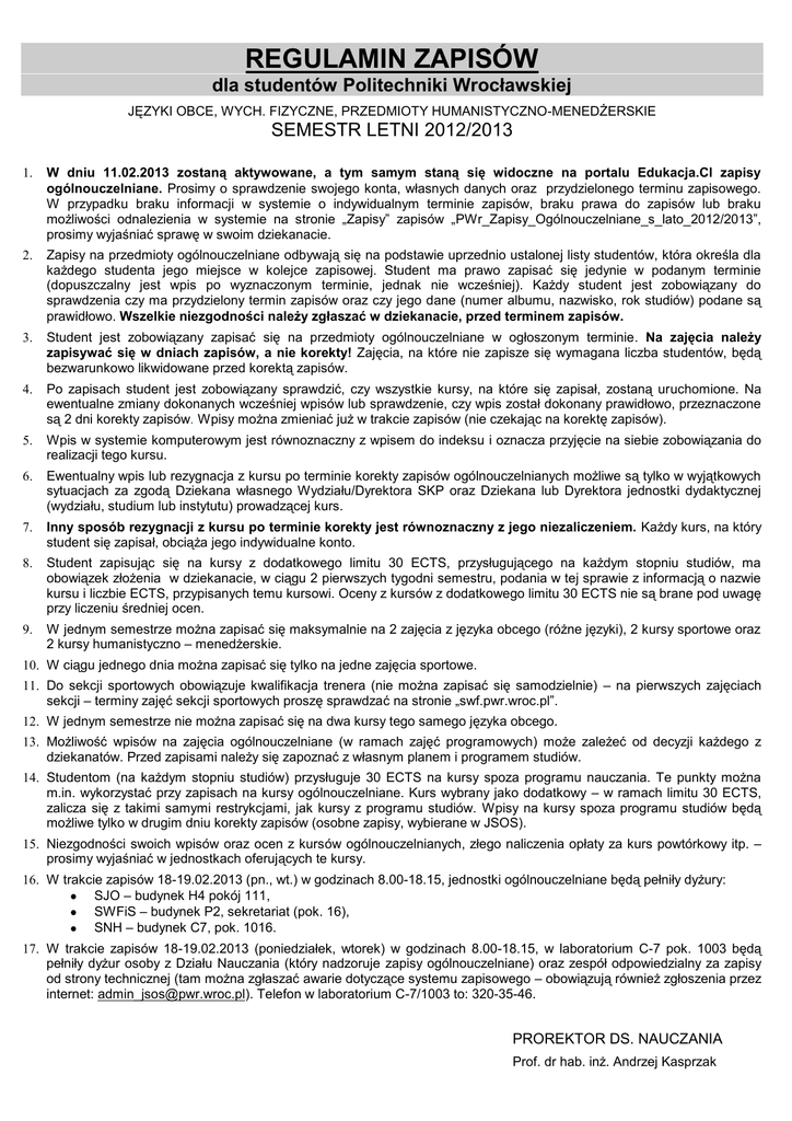 REGULAMIN ZAPISÓW dla studentów Politechniki Wrocławskiej JĘZYKI OBCE, WYCH. FIZYCZNE, PRZEDMIOTY HUMANISTYCZNO-MENEDŻERSKIE SEMESTR LETNI 2012/2013 1. W dniu 11.02.2013 zostaną aktywowane, a tym samym staną się widoczne na portalu Edukacja.Cl zapisy ogólnouczelniane. Prosimy o sprawdzenie swojego konta, własnych danych oraz przydzielonego terminu zapisowego. W przypadku braku informacji w systemie o indywidualnym terminie zapisów, braku prawa do zapisów lub braku możliwości odnalezienia w systemie na stronie „Zapisy” zapisów „PWr_Zapisy_Ogólnouczelniane_s_lato_2012/2013”, prosimy wyjaśniać sprawę w swoim dziekanacie. 2. Zapisy na przedmioty ogólnouczelniane odbywają się na podstawie uprzednio ustalonej listy studentów, która określa dla każdego studenta jego miejsce w kolejce zapisowej. Student ma prawo zapisać się jedynie w podanym terminie (dopuszczalny jest wpis po wyznaczonym terminie, jednak nie wcześniej). Każdy student jest zobowiązany do sprawdzenia czy ma przydzielony termin zapisów oraz czy jego dane (numer albumu, nazwisko, rok studiów) podane są prawidłowo. Wszelkie niezgodności należy zgłaszać w dziekanacie, przed terminem zapisów. 3. Student jest zobowiązany zapisać się na przedmioty ogólnouczelniane w ogłoszonym terminie. Na zajęcia należy zapisywać się w dniach zapisów, a nie korekty! Zajęcia, na które nie zapisze się wymagana liczba studentów, będą bezwarunkowo likwidowane przed korektą zapisów. 4. Po zapisach student jest zobowiązany sprawdzić, czy wszystkie kursy, na które się zapisał, zostaną uruchomione. Na ewentualne zmiany dokonanych wcześniej wpisów lub sprawdzenie, czy wpis został dokonany prawidłowo, przeznaczone są 2 dni korekty zapisów. Wpisy można zmieniać już w trakcie zapisów (nie czekając na korektę zapisów). 5. Wpis w systemie komputerowym jest równoznaczny z wpisem do indeksu i oznacza przyjęcie na siebie zobowiązania do realizacji tego kursu. 6. Ewentualny wpis lub rezygnacja z kursu po terminie korekty zapisów ogólnouczelnianych możliwe są tylko w wyjątkowych sytuacjach za zgodą Dziekana własnego Wydziału/Dyrektora SKP oraz Dziekana lub Dyrektora jednostki dydaktycznej (wydziału, studium lub instytutu) prowadzącej kurs. 7. Inny sposób rezygnacji z kursu po terminie korekty jest równoznaczny z jego niezaliczeniem. Każdy kurs, na który student się zapisał, obciąża jego indywidualne konto. 8. Student zapisując się na kursy z dodatkowego limitu 30 ECTS, przysługującego na każdym stopniu studiów, ma obowiązek złożenia w dziekanacie, w ciągu 2 pierwszych tygodni semestru, podania w tej sprawie z informacją o nazwie kursu i liczbie ECTS, przypisanych temu kursowi. Oceny z kursów z dodatkowego limitu 30 ECTS nie są brane pod uwagę przy liczeniu średniej ocen. 9. W jednym semestrze można zapisać się maksymalnie na 2 zajęcia z języka obcego (różne języki), 2 kursy sportowe oraz 2 kursy humanistyczno – menedżerskie. 10. W ciągu jednego dnia można zapisać się tylko na jedne zajęcia sportowe. 11. Do sekcji sportowych obowiązuje kwalifikacja trenera (nie można zapisać się samodzielnie) – na pierwszych zajęciach sekcji – terminy zajęć sekcji sportowych proszę sprawdzać na stronie „swf.pwr.wroc.pl”. 12. W jednym semestrze nie można zapisać się na dwa kursy tego samego języka obcego. 13. Możliwość wpisów na zajęcia ogólnouczelniane (w ramach zajęć programowych) może zależeć od decyzji każdego z dziekanatów. Przed zapisami należy się zapoznać z własnym planem i programem studiów. 14. Studentom (na każdym stopniu studiów) przysługuje 30 ECTS na kursy spoza programu nauczania. Te punkty można m.in. wykorzystać przy zapisach na kursy ogólnouczelniane. Kurs wybrany jako dodatkowy – w ramach limitu 30 ECTS, zalicza się z takimi samymi restrykcjami, jak kursy z programu studiów. Wpisy na kursy spoza programu studiów będą możliwe tylko w drugim dniu korekty zapisów (osobne zapisy, wybierane w JSOS). 15. Niezgodności swoich wpisów oraz ocen z kursów ogólnouczelnianych, złego naliczenia opłaty za kurs powtórkowy itp. – prosimy wyjaśniać w jednostkach oferujących te kursy. 16. W trakcie zapisów 18-19.02.2013 (pn., wt.) w godzinach 8.00-18.15, jednostki ogólnouczelniane będą pełniły dyżury: SJO – budynek H4 pokój 111, SWFiS – budynek P2, sekretariat (pok. 16), SNH – budynek C7, pok. 1016. 17. W trakcie zapisów 18-19.02.2013 (poniedziałek, wtorek) w godzinach 8.00-18.15, w laboratorium C-7 pok. 1003 będą pełniły dyżur osoby z Działu Nauczania (który nadzoruje zapisy ogólnouczelniane) oraz zespół odpowiedzialny za zapisy od strony technicznej (tam można zgłaszać awarie dotyczące systemu zapisowego – obowiązują również zgłoszenia przez internet: [email protected]). Telefon w laboratorium C-7/1003 to: 320-35-46. PROREKTOR DS. NAUCZANIA Prof. dr hab. inż. Andrzej Kasprzak