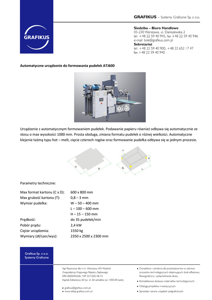 Automatyczne urządzenie do formowania pudełek ATJ600 Urządzenie z automatycznym formowaniem pudełek. Podawanie papieru również odbywa się automatycznie ze stosu o max wysokości 1000 mm. Prosta obsługa, zmiana formatu pudełek o różnej wielkości. Automatyczne klejenie taśmą typu hot – melt, cięcie czterech rogów oraz formowanie pudełka odbywa się w jednym procesie. Parametry techniczne: Max format kartonu (C x D): Max grubość kartonu (T): Wymiar pudełka: Prędkość: Pobór prądu: Ciężar urządzenia: Wymiary (dł/szer/wys): 600 x 800 mm 0,8 – 3 mm W – 50 – 400 mm L – 100 – 600 mm H – 15 – 150 mm do 35 pudełek/min 2,4 kW 1550 kg 2350 x 2500 x 2300 mm