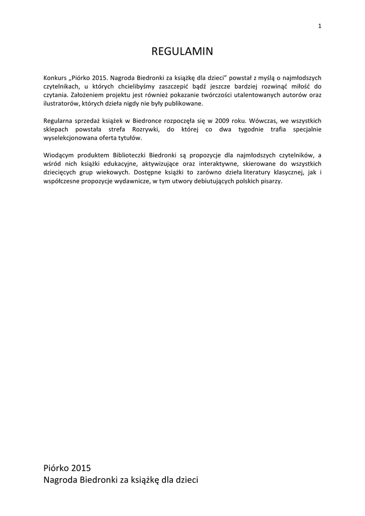 1 REGULAMIN Konkurs „Piórko 2015. Nagroda Biedronki za książkę dla dzieci” powstał z myślą o najmłodszych czytelnikach, u których chcielibyśmy zaszczepić bądź jeszcze bardziej rozwinąć miłość do czytania. Założeniem projektu jest również pokazanie twórczości utalentowanych autorów oraz ilustratorów, których dzieła nigdy nie były publikowane. Regularna sprzedaż książek w Biedronce rozpoczęła się w 2009 roku. Wówczas, we wszystkich sklepach powstała strefa Rozrywki, do której co dwa tygodnie trafia specjalnie wyselekcjonowana oferta tytułów. Wiodącym produktem Biblioteczki Biedronki są propozycje dla najmłodszych czytelników, a wśród nich książki edukacyjne, aktywizujące oraz interaktywne, skierowane do wszystkich dziecięcych grup wiekowych. Dostępne książki to zarówno dzieła literatury klasycznej, jak i współczesne propozycje wydawnicze, w tym utwory debiutujących polskich pisarzy. Piórko 2015 Nagroda Biedronki za książkę dla dzieci 2 Artykuł 1 (Cel) 1. Konkurs literacki pod nazwą „Piórko 2015. Nagroda Biedronki za książkę dla dzieci” (dalej „Konkurs”) to inicjatywa stworzona w celu promowania literatury dziecięcej. 2. W Konkursie zostaną przyznane nagrody w dwóch kategoriach (dalej „Kategorie”): a) w Kategorii tekst -‐ dla autora najlepszej pracy literackiej dla dzieci w wieku od 4 do 10 lat (dalej „Kategoria Tekst”), b) w Kategorii ilustracja -‐ dla autora najlepszych ilustracji do pracy literackiej dla dzieci w wieku od 4 do 10 lat (dalej „Kategoria Ilustracja”). 3. Niniejszy Regulamin (dalej „Regulamin”) określa warunki i zasady na jakich odbywa się Konkurs. Artykuł 2 (Postanowienia ogólne) 1. Organizatorem Konkursu jest Jeronimo Martins Polska S.A. z siedzibą w Kostrzynie (kod pocztowy 62-‐025), przy ul. Żniwnej 5, wpisana do rejestru przedsiębiorców, prowadzonego przez Sąd Rejonowy dla Poznania -‐ Nowe Miasto i Wilda w Poznaniu, IX Wydział Gospodarczy Krajowego Rejestru Sądowego, pod numerem KRS 0000222483, NIP 779-‐101-‐ 13-‐27, REGON 63030302300000, kapitał zakładowy 715 000 000,00 zł w całości wpłacony (dalej „Organizator”). 2. W imieniu i na rzecz Organizatora, czynności związane z obsługą Konkursu wykonuje koordynator Konkursu AM Art-‐Media Agencja PR Sp. z o.o. z siedzibą w Warszawie (kod pocztowy 00-‐410), przy ul. Solec 22, wpisana do rejestru przedsiębiorców, prowadzonego przez Sąd Rejonowy dla m.st. Warszawy w Warszawie, XII Wydział Gospodarczy Krajowego Rejestru Sądowego, pod numerem KRS 0000188054, NIP 525-‐220-‐00-‐89, REGON 01721689900000, kapitał zakładowy 100 000,00 zł (dalej „Koordynator”). 3. Konkurs organizowany jest na terenie Rzeczypospolitej Polskiej i prowadzony jest przy wykorzystaniu strony internetowej www.piorko2015.biedronka.pl (dalej „Strona Konkursowa”). 4. Konkurs składa się z 2 (dwóch) etapów, tj.: a) I etap Konkursu trwa od dnia 5 marca 2015 r. do dnia 21 kwietnia 2015 r. (dalej „I Etap Konkursu”), b) II etap Konkursu trwa od dnia 11 czerwca 2015 r. do dnia 6 sierpnia 2015 r. (dalej „II Etap Konkursu”). 5. Konkurs trwa od dnia 5 marca 2015 r. do dnia 2 września 2015 r., przy czym datą zakończenia Konkursu jest dzień opublikowania wyników II Etapu Konkursu. Szczegółowy harmonogram przeprowadzenia Konkursu stanowi Załącznik nr 1 do Regulaminu. 6. Organizator jest przyrzekającym nagrodę w rozumieniu art. 919 i 921 Kodeksu Cywilnego. 7. Warunkiem udziału w Konkursie jest zapoznanie się z tekstem Regulaminu oraz jego zaakceptowanie. 8. Niniejszy Regulamin dostępny jest na Stronie Konkursowej oraz w wersji papierowej w siedzibie Organizatora. Piórko 2015 Nagroda Biedronki za książkę dla dzieci 3 Artykuł 3 (Uczestnictwo w Konkursie) 1. W Konkursie mogą uczestniczyć pełnoletnie osoby fizyczne, posiadające obywatelstwo polskie oraz pełną zdolność do czynności prawnych, zamieszkałe na terytorium Rzeczypospolitej Polskiej, których prace literackie (dotyczy uczestników I Etapu Konkursu) lub prace graficzne (dotyczy uczestników II Etapu Konkursu) nigdy wcześniej nie były publikowane w drukach lub wydawnictwach oznaczonych numerami ISBN lub ISSN, takich jak w szczególności książki, czasopisma, ebooki, audiobooki (dalej „Uczestnicy”). 2. Z uczestnictwa w Konkursie wyłączeni są: a) pracownicy Organizatora oraz członkowie ich rodzin, b) pracownicy Koordynatora oraz członkowie ich rodzin, c) pracownicy Wydawnictwa Zielona Sowa Sp. z o.o., z siedzibą w Warszawie 00-‐807, przy Al. Jerozolimskich 96, wpisanej do rejestru przedsiębiorców, prowadzonego przez Sąd Rejonowy dla m. st. Warszawy w Warszawie, XII Wydział Gospodarczy Krajowego Rejestru Sądowego pod numerem KRS 0000174857, NIP 521-‐32-‐60-‐087, REGON 01556668400000, kapitał zakładowy w wysokości 1.050.000 zł (opłacony w całości), (dalej „Wydawca”) oraz członkowie ich rodzin, d) członkowie Komisji Opiniującej oraz członkowie ich rodzin, e) członkowie Kapituły Nagrody w Kategorii Tekst oraz członkowie ich rodzin, f) członkowie Kapituły Nagrody w Kategorii Ilustracja oraz członkowie ich rodzin. 3. Przez członków rodzin, o których mowa w ust. 2 powyżej, rozumie się: a) małżonków, b) wstępnych, zstępnych, c) rodzeństwo, d) osoby pozostające w stosunku przysposobienia, e) konkubentów. Artykuł 4 (Nagrody) 1. W Konkursie zostały przewidziane następujące nagrody (dalej łącznie: „Nagrody”, a każda z osobna „Nagroda”): a) Nagroda w Kategorii Tekst: i. nagroda pieniężna w wysokości 111 110,00 złotych (słownie: sto jedenaście tysięcy sto dziesięć zł), b) Nagroda w Kategorii Ilustracja i. nagroda pieniężna w wysokości 111 110,00 złotych (słownie: sto jedenaście tysięcy sto dziesięć zł), 2. Nagrody nie podlegają wymianie na inną nagrodę. 3. Uczestnik nie jest uprawniony do żądania wymiany Nagrody na nagrodę innego rodzaju