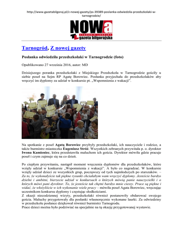 http://www.gazetabilgoraj.pl/z-nowej-gazety/ps-39389-poslanka-odwiedzila-przedszkolaki-wtarnogrodzie/ Tarnogród, Z nowej gazety Posłanka odwiedziła przedszkolaki w Tarnogrodzie (foto) Opublikowano 27 września 2016, autor: MD Dzisiejszego poranka przedszkolaki z Miejskiego Przedszkola w Tarnogrodzie gościły u siebie poseł na Sejm RP Agatę Borowiec. Posłanka przyjechała do przedszkolaków aby wręczyć im dyplomy za udział w konkursie pt. „Wspomnienia z wakacji”. Na spotkanie z poseł Agatą Borowiec przybyły przedszkolaki, ich nauczyciele i rodzice, a także burmistrz miasteczka Eugeniusz Stróż. Wszystkich zebranych przywitała p. o. dyrektor Iwona Kamieniec, która przedstawiła maluchom ich gościa. Dyrektor mówiła gdzie pracuje poseł i czym zajmuje się na co dzień. Po ciepłym przywitaniu, nastąpił moment wręczenia dyplomów dla przedszkolaków, które wzięły udział w konkursie „Wspomnienia z wakacji”. A było co nagradzać. W konkursie wzięły udział dzieci ze wszystkich grup, począwszy od tych najmłodszych po starszaków. – Za to, że wykonałyście tak piękne rysunki chciałabym wam wręczyć dyplomy. Jesteście bardzo dzielni i ambitni, bierzecie udział w konkursach o których mówią panie nauczycielki i o których mówi pani dyrektor. To, że jesteście tak chętni bardzo mnie cieszy. Prace są piękne i widać, że włożyliście w ich wykonanie wiele pracy – mówiła poseł Agata Borowiec, wręczając uczestnikom konkursu dyplomy i częstując słodkościami. Z okazji niecodziennej wizyty, przedszkolaki również postanowiły obdarować swojego gościa. Maluchy przygotowały dla posłanki własnoręcznie wykonane laurki. Za odwiedziny w przedszkolu posłance dziękował również burmistrz Tarnogrodu. Prace dzieci można było podziwiać na specjalnie na tą okazję przygotowanej wystawie.