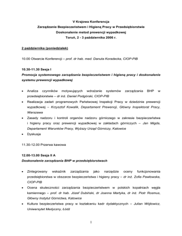 V Krajowa Konferencja Zarządzanie Bezpieczeństwem i Higieną Pracy w Przedsiębiorstwie Doskonalenie metod prewencji wypadkowej Toruń, 2 - 3 października 2006 r. 2 października (poniedziałek) 10.00 Otwarcie Konferencji – prof. dr hab. med. Danuta Koradecka, CIOP-PIB 10.30-11.30 Sesja I Promocja systemowego zarządzania bezpieczeństwem i higieną pracy i doskonalenie systemu prewencji wypadkowej • Analiza czynników motywujących wdrażanie systemów zarządzania BHP w przedsiębiorstwie – dr inż. Daniel Podgórski, CIOP-PIB • Realizacja zadań programowych Państwowej Inspekcji Pracy w dziedzinie prewencji wypadkowej – Krzysztof Kowalik, Departament Prewencji, Główny Inspektorat Pracy, Warszawa • Zasady nadzoru i kontroli organów nadzoru górniczego w zakresie bezpieczeństwa i higieny pracy oraz prewencji wypadkowej w zakładach górniczych – Jan Migda, Departament Warunków Pracy, Wyższy Urząd Górniczy, Katowice • Dyskusja 11.30-12.00 Przerwa kawowa 12.00-13.00 Sesja II A Doskonalenie zarządzania BHP w przedsiębiorstwach • Zintegrowany wskaźnik zarządzania jako narzędzie oceny funkcjonowania przedsiębiorstwa w obszarze bezpieczeństwa i higieny pracy – dr inż. Zofia Pawłowska, CIOP-PIB • Ocena skuteczności zarządzania bezpieczeństwem w polskich kopalniach węgla kamiennego – prof. dr hab. Józef Dubiński, dr Joanna Martyka, dr inż. Piotr Rosmus, Główny Instytut Górnictwa, Katowice • Kultura bezpieczeństwa pracy w kształceniu kadr dydaktycznych – Julian Wójtowicz, Uniwersytet Medyczny, Łódź 1 • Dyskusja 13.00-14.00 Przerwa obiadowa 14.00-15.30 Sesja II B Doskonalenie zarządzania BHP w przedsiębiorstwach • Skuteczność systemów zarządzania BHP – Bogusław Ziędalski, Oddział Toruńskiego Stowarzyszenia Ochrony Pracy, Toruń • Ocena zarządzania bezpieczeństwem i higieną pracy w ORLEN S.A. – Marek Witkowski, PKN ORLEN, Płock • Ocena zarządzania bezpieczeństwem i higieną pracy w przedsiębiorstwie – Jan Rogalski, BOT Elektrownia Bełchatów S.A. • Narzędzia zarządzania bezpieczeństwem i higieną pracy w Skanska S.A. - Wojciech Prusiński, Skanska S.A., Kielce • Dyskusja 15.30-16.00 Przerwa kawowa 16.00 – 17.00 Sesja III Czynniki środowiska pracy i profilaktyka wydarzeń wypadkowych • Zapobieganie zagrożeniom wypadkowym w magazynach wysokiego składowania – dr inż. Krystyna Myrcha, CIOP-PIB • Wybrane czynniki kształtujące środowisko pracy a ryzyko zawodowe w przedsiębiorstwie branży obuwniczej – Małgorzata Jaworska, Wydział Ekonomiczny Katedra Nauk o Jakości, Politechnika Radomska • Dyskusja 19. 00 Kolacja uroczysta 2 3 października (wtorek) 9.00-10.30 Sesja IV Badanie i rejestrowanie wydarzeń wypadkowych w przedsiębiorstwach • Rejestrowanie zdarzeń potencjalnie wypadkowych w przedsiębiorstwach – mgr inż. Grzegorz Dudka, CIOP-PIB • Technologia „Behavioral Accident Prevention Pocess- BAPP firmy BST – Proces Zapobiegania Wypadkom Przemysłowym Oparty na Zachowaniach – Antonina Polok, Mirosław Koźlik TUV Consulting Polska • Program rejestracji wypadków przy pracy w Poczcie Polskiej – Andrzej Garwacki, Poczta Polska, Dyrekcja Okręgu Poczty, Poznań • Motywowanie pracowników do bezpiecznych zachowań jako narzędzie prewencji wypadkowej - dr hab. Zygmunt Niczyporuk, mgr inż. Wioletta Przenniak, Wydział Organizacji i Zarządzania, Katedra Zarządzania Środowiskiem i Bezpieczeństwem, Politechnika Śląska, Gliwice • Dyskusja 10.30 – 11.00 Przerwa kawowa 11.00 – 12.00 Sesja V Stosowanie środków ochrony indywidualnej w prewencji wypadkowej • Zasady bezpiecznego stosowania środków ochrony indywidualnej – dr inż. Katarzyna Majchrzycka, CIOP-PIB • Programy komputerowe wspomagające dobór środków ochrony indywidualnej – dr inż. Adam Pościk, CIOP-PIB • Zasady doboru i stosowania sprzętu chroniącego przed upadkiem z wysokości – Jacek Sosnowski, Zygmunt Zrobek, PROTEKT Grzegorz Łaszkiewicz, Łódź • Dyskusja 12.00 – 12.30 Podsumowanie i zakończenie Konferencji 13.0 Przerwa obiadowa 3