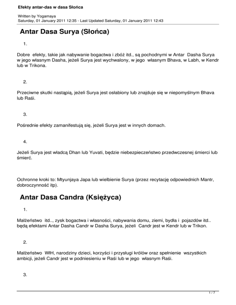 Efekty antar-das w dasa Słońca Written by Yogamaya Saturday, 01 January 2011 12:35 - Last Updated Saturday, 01 January 2011 12:43 Antar Dasa Surya (Słońca) 1. Dobre efekty, takie jak nabywanie bogactwa i zbóż itd., są pochodnymi w Antar Dasha Surya w jego własnym Dasha, jeżeli Surya jest wychwalony, w jego własnym Bhava, w Labh, w Kendr lub w Trikona. 2. Przeciwne skutki nastąpią, jeżeli Surya jest osłabiony lub znajduje się w niepomyślnym Bhava lub Raśi. 3. Pośrednie efekty zamanifestują się, jeżeli Surya jest w innych domach. 4. Jeżeli Surya jest władcą Dhan lub Yuvati, będzie niebezpieczeństwo przedwczesnej śmierci lub śmierć. Ochronne kroki to: Mtyunjaya Japa lub wielbienie Surya (przez recytację odpowiednich Mantr, dobroczynność itp). Antar Dasa Candra (Księżyca) 1. Małżeństwo itd.., zysk bogactwa i własności, nabywania domu, ziemi, bydła i pojazdów itd.. będą efektami Antar Dasha Candr w Dasha Surya, jeżeli Candr jest w Kendr lub w Trikon. 2. Małżeństwo WłH, narodziny dzieci, korzyści i przysługi królów oraz spełnienie wszystkich ambicji, jeżeli Candr jest w podniesieniu w Raśi lub w jego własnym Raśi. 3. 1/7 Efekty antar-das w dasa Słońca Written by Yogamaya Saturday, 01 January 2011 12:35 - Last Updated Saturday, 01 January 2011 12:43 Strapienie przez żonę i dzieci, niepowodzenia w przedsięwzięciach, spory z innymi, strata służących, antagonizm między właścicielem horoskopu a królem i zniszczenia bogactwa czy zboża będą efektami, jeżeli Candr będzie zanikać lub będzie związany z malefikami. 4. Efekty, takie jak niebezpieczeństwo od wody, umysłowa agonia, uwięzienie, niebezpieczeństwa od chorób, strata pozycji, podróż do złych miejsc, spory, złe pożywienie, problemy przez złodziei itd, niezadowolenie króla, problemy z układem moczowym, bóle cielesne będą doświadczeniami związanymi z pozycją Candra w Ari, Randhr lub Vyaya. 5. Luksus, komfort, przyjemności, świt losu (Bhagyodaya), wzrost w zadowolenia z żony i dzieci, nabywanie królestwa, małżeństwo i religijne funkcje, zyski związane z ubraniami, ziemią i pojazdami a także narodziny dzieci i wnuków będą pomyślnymi efektami, jeżeli benefiki zajmą 1., 9. lub Kendra od władcy Dasha. 6. Niesmaczne pożywienie lub pożywianie się w złych warunkach, wygnanie, będą efektami w Antar Dasha, jeżeli Candr jest w 6., 8. lub 12. od władcy Dasha lub, jeżeli Candr jest słaby. 7. Nastąpi przedwczesna śmierć, jeżeli Candr będzie władcą Marak Bhava. Aby zyskać spokój i komfort, zaradczymi środkami ku temu będą: dobroczynność, ofiarowanie białej krowy braminom Antar Dasha Mangal (Marsa) 1. Pomyślne efekty, jak nabywanie ziemi, zysk bogactwa i zboża, nabycie domu itd. nastąpią w Antar Dasha Mangala w Dasha Surya, jeżeli Mangal jest w podniesieniu w Raśi, w jego własnym Raśi, w Kendr lub w Trikona. 2. 2/7 Efekty antar-das w dasa Słońca Written by Yogamaya Saturday, 01 January 2011 12:35 - Last Updated Saturday, 01 January 2011 12:43 Zysk, osiągnięcie pozycji Dowódcy Armii, zniszczenia wrogów, komfort, dobre relacje z rodziną i wzrost spokoju umysłu, jest efektem, pozycji Mangala w yuti z władcą Lagna. 3. Brutalność, umysłowe dolegliwości, uwięzienie, strata krewnych, spory z braćmi i niepowodzenia w przedsięwzięciach wynikną, jeżeli Mangal będzie w 8. lub w 12. od władcy Dasha, jeżeli Mangal jest związany z malefikami lub, jeżeli Mangal jest bez godności czy siły. 4. Zniszczenie bogactwa przez niezadowolenie króla będzie efektem, pozycji Mangala w upadku w Raśi lub słabej jego pozycji. 5. Choroby umysłu i ciała wynikną, jeżeli Mangal będzie władcą Dhan lub Yuvati Bhava. Wyzdrowienie, wzrost długowieczności i sukcesy w podróżach są możliwe, jeżeli podejmiemy zaradcze działania, takie jak recytacja Ved, Japa i Vrashotsarg. Antar Dasha Rahu (Węzeł księżycowy) 1. W Dasha Surya, jeżeli Rahu jest w Kendra lub w Trikona od Lagna, w pierwszych dwóch miesiącach: strata bogactwa, niebezpieczeństwo przez złodziei, węże, rany i nieszczęścia spowodowane przez żonę i dzieci lub związane z nimi. Po 2 miesiącach niepomyślne efekty znikną i zadowolenie oraz komfort wzrosną, polepszy się zdrowie, nastąpi satysfakcja, przysługi od króla i rządu. Jeżeli Rahu jest yuti z benefikami lub, jeżeli Rahu jest w Navańś benefików. 2. Dowód uznania od króla, dobry los, imie i sława, strapienia związane z żoną i dziećmi, narodziny syna, szczęście w rodzinie itd, będą efektem położenia Rahu w Upachaya od Lagna, jeżeli Rahu związany jest z Yoga Karaka lub jest umieszczony korzystnie do władcy Dasha. 3/7 Efekty antar-das w dasa Słońca Written by Yogamaya Saturday, 01 January 2011 12:35 - Last Updated Saturday, 01 January 2011 12:43 3. Uwięzienie, strata pozycji, niebezpieczeństwo spowodowane przez złodziei i węże, rany, szczęście związane z żoną i dziećmi, zniszczenie bydła, domu i pól rolniczych, choroby, (Gulma - choroby skóry), biegunka itd, będą skutkami, pozycji Rahu jeżeli jest on słaby lub jest w 8 lub w 12 od władcy Dasha. 4. Przeciwne efekty, jak przedwczesna śmierć i niebezpieczeństwo od węży nastąpią, jeżeli Rahu jest w Dhan lub Yuvati lub jeżeli Rahu jest związany z władcami tych Bhavas. Wielbienie Bogini Durgi, Japa, dobroczynność są zaradczymi czynnościami dla spowodowania ulgi od powyższych złych efektów lub całkowitej ucieczki od nich. Antar Dasha Guru (Jowisza) 1. Małżeństwo WłH, przysług króla, zysk, bogactwo, narodziny syna, spełnienie ambicji przez władców i ich pomoc, to pomyślne efekty w Antar Dasha Guru w Dasha Surya, jeżeli Guru jest w Kendra lub w Trikona do Lagna, w podniesieniu w Raśi, w jego własnym Raśi lub w jego własnym Varga. 2. Nabywanie królestwa, komfort, podróże, także nabycie samochodu w obecnych czasach, zysk pozycji itd. wynikną, jeżeli Guru jest władcą