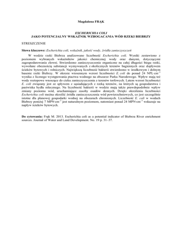 Magdalena FRĄK ESCHERICHIA COLI JAKO POTENCJALNY WSKAŹNIK WZBOGACANIA WÓD RZEKI BIEBRZY STRESZCZENIE Słowa kluczowe: Escherichia coli, wskaźnik, jakość wody, źródła zanieczyszczeń W wodzie rzeki Biebrza analizowano liczebność Escherichia coli. Wyniki zestawiono z poziomem wybranych wskaźników jakości chemicznej wody oraz danymi, dotyczącymi zagospodarowania zlewni. Stwierdzono zanieczyszczenie organiczne na całej długości biegu rzeki, wywołane obecnością substancji wymywanych z okolicznych terenów bagiennych oraz dopływem ścieków bytowych i rolniczych. Największą liczebność bakterii stwierdzono w środkowym i dolnym basenie rzeki Biebrzy. W okresie wiosennym wzrost liczebności E. coli do ponad 24 NPL·cm–3 wynika z licznego występowania ptactwa wodnego na obszarze Parku Narodowego. Wpływ mają też wody roztopowe wnoszące do cieku zanieczyszczenia z terenów torfowych. Latem wzrost liczebności E. coli związany jest ze spływem z sąsiadujących z rzeką terenów, na których są gospodarstwa i pastwiska bydła mlecznego. Na liczebność bakterii w wodzie mają także prawdopodobnie wpływ zmiany poziomu wód, uruchamiające zasoby osadów dennych. Dzięki określeniu liczebności Escherichia coli można określić źródła zanieczyszczenia wód powierzchniowych, co jest szczególnie istotne dla planowej gospodarki wodnej na obszarach chronionych. Liczebność E. coli w wodach Biebrzy poniżej 7 MPN·cm–3 jest naturalnym poziomem, natomiast ponad 24 MPN·cm–3 wskazuje na napływ ścieków bytowych. Do cytowania: Frąk M. 2013. Escherichia coli as a potential indicator of Biebrza River enrichment sources. Journal of Water and Land Development. No. 19 p. 31–37.