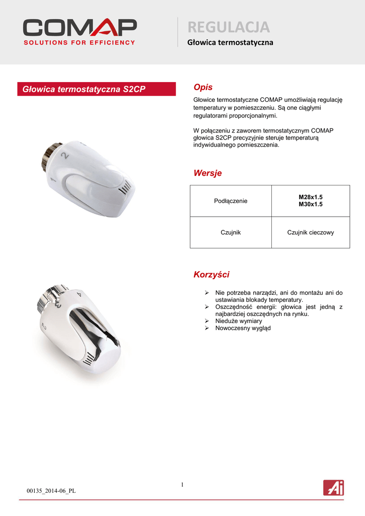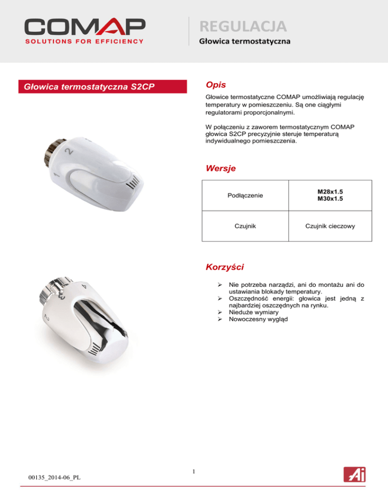REGULACJA Głowica termostatyczna Opis Głowica termostatyczna S2CP Głowice termostatyczne COMAP umożliwiają regulację temperatury w pomieszczeniu. Są one ciągłymi regulatorami proporcjonalnymi. W połączeniu z zaworem termostatycznym COMAP głowica S2CP precyzyjnie steruje temperaturą indywidualnego pomieszczenia. Wersje Podłączenie M28x1.5 M30x1.5 Czujnik Czujnik cieczowy Korzyści 1 00135_2014-06_PL Nie potrzeba narządzi, ani do montażu ani do ustawiania blokady temperatury. Oszczędność energii: głowica jest jedną z najbardziej oszczędnych na rynku. Nieduże wymiary Nowoczesny wygląd REGULACJA Głowica termostatyczna Zastosowanie Do tradycyjnych instalacji grzewczych. Minimalna temperatura: -10°C Maksymalna temperatura: +50°C Wymiary Model Kod D M nastawa 3 L nastawa 3 M nastawa 5 L nastawa 5 S2CP M28 L111003001 49 77 80 79 82 S2CP M30 L112005001 49 80 83 82 85 Wydajność (wartości certyfikowane EN 215) Model Kod Histereza Wpływ temperatury wody Czas reakcji Wpływ ciśnienia różnicowego Vt S2 CP M28 L111003001 0,7 1 18' 0,2 0,77 S2 CP M30 L112005001 0,6 0,6 18' 0,2 0,54 2 00135_2014-06_PL REGULACJA Głowica termostatyczna Linia produktów Zdjęcie Model Kod Czujnik Podłączenie Kompatybilność S2 CP M28 L111003001 Wewnętrzny cieczowy M28x1.5 Wszystkie zawory termostatyczne M28 od COMAP S2 CP M30 L112005001 Wewnętrzny cieczowy M30x1.5 Wszystkie zawory termostatyczne M30 od COMAP, wkłady typu Heimeier S2 CP M28 110028 Wewnętrzny cieczowy M28x1.5 Wszystkie zawory termostatyczne M28 od COMAP 110030 Wewnętrzny cieczowy M30x1.5 Wszystkie zawory termostatyczne M30 od COMAP, wkłady typu Heimeier S2 CP M30 Sposób montażu 1. Ustaw głowicę na pozycji 5 2. Zakręć nakrętkę montażową na zaworze termostatycznym. Maks. moment 2 Nm. Nie potrzeba narzędzi. Nastawa temperatury Nastawa * 1 2 3 4 5 Temperatura 7°C 11°C 16°C 20°C 24°C 28°C 3 00135_2014-06_PL REGULACJA Głowica termostatyczna Ograniczanie zakresu nastawy temperatury Ograniczanie zakresu nastawy temperatury wykonuje się przy pomocy pinu z tworzywa sztucznego Ograniczanie maksymalnej nastawy: 1. Ustaw głowicę na żądaną maksymalną nastawę 2. Umieść pin w sąsiadującym miejscu od strony wyższej nastawy Ograniczanie minimalnej nastawy: 1. Ustaw głowicę na żądaną minimalną nastawę 2. Umieść pin w sąsiadującym miejscu od strony niższej nastawy Ustawianie stałej nastawy: 1. Ustaw głowicę na żądaną minimalną nastawę 2. Umieść pin w rowku wskaźnika nastawy blokując jego ruch Akcesoria Zdjęcie Opis Kod Pin ograniczania zakresu nastawy W005422 Wzmocniony pierścień zabezpieczający przed niepowołanym demontażem M28 582500 Wzmocniony pierścień zabezpieczający przed niepowołanym demontażem M30 582530 4 00135_2014-06_PL