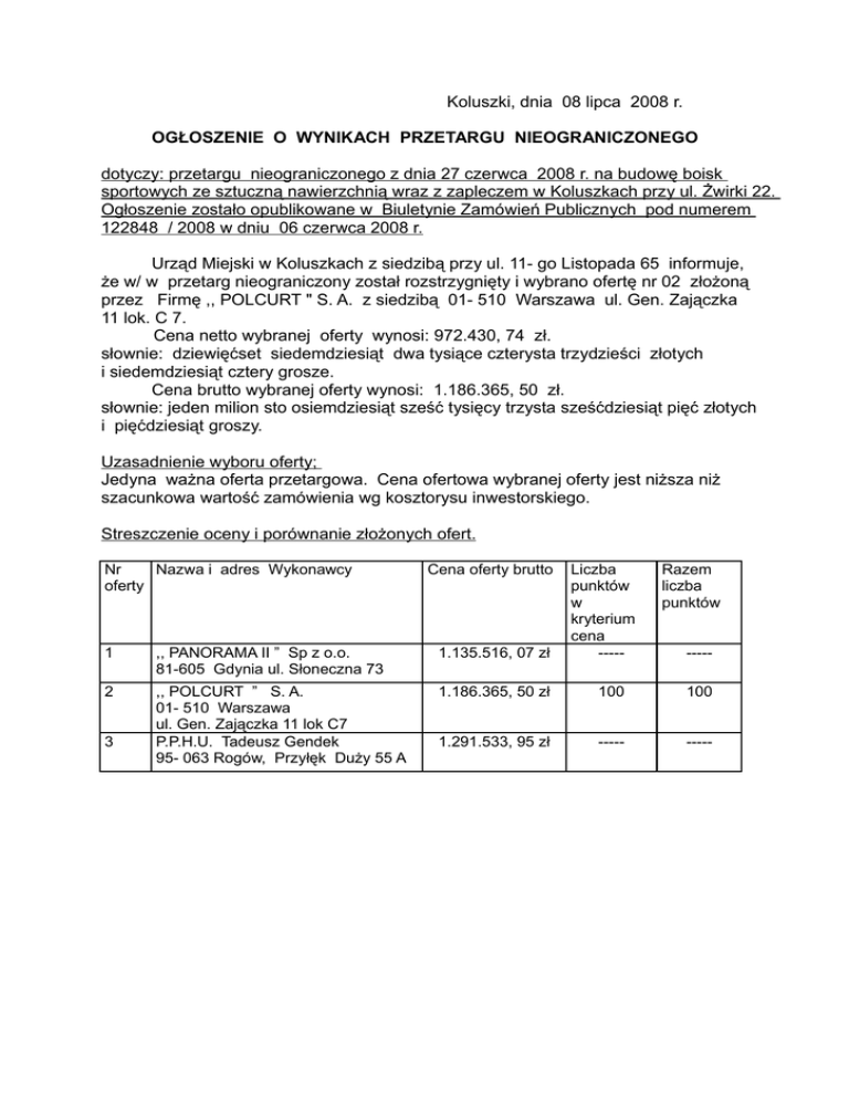 Koluszki, dnia 08 lipca 2008 r. OGŁOSZENIE O WYNIKACH PRZETARGU NIEOGRANICZONEGO dotyczy: przetargu nieograniczonego z dnia 27 czerwca 2008 r. na budowę boisk sportowych ze sztuczną nawierzchnią wraz z zapleczem w Koluszkach przy ul. Żwirki 22. Ogłoszenie zostało opublikowane w Biuletynie Zamówień Publicznych pod numerem 122848 / 2008 w dniu 06 czerwca 2008 r. Urząd Miejski w Koluszkach z siedzibą przy ul. 11- go Listopada 65 informuje, że w/ w przetarg nieograniczony został rozstrzygnięty i wybrano ofertę nr 02 złożoną przez Firmę ,, POLCURT " S. A. z siedzibą 01- 510 Warszawa ul. Gen. Zajączka 11 lok. C 7. Cena netto wybranej oferty wynosi: 972.430, 74 zł. słownie: dziewięćset siedemdziesiąt dwa tysiące czterysta trzydzieści złotych i siedemdziesiąt cztery grosze. Cena brutto wybranej oferty wynosi: 1.186.365, 50 zł. słownie: jeden milion sto osiemdziesiąt sześć tysięcy trzysta sześćdziesiąt pięć złotych i pięćdziesiąt groszy. Uzasadnienie wyboru oferty; Jedyna ważna oferta przetargowa. Cena ofertowa wybranej oferty jest niższa niż szacunkowa wartość zamówienia wg kosztorysu inwestorskiego. Streszczenie oceny i porównanie złożonych ofert. Nr Nazwa i adres Wykonawcy oferty Cena oferty brutto Liczba punktów w kryterium cena ----- Razem liczba punktów 1 ,, PANORAMA II ” Sp z o.o. 81-605 Gdynia ul. Słoneczna 73 1.135.516, 07 zł 2 ,, POLCURT ” S. A. 01- 510 Warszawa ul. Gen. Zajączka 11 lok C7 P.P.H.U. Tadeusz Gendek 95- 063 Rogów, Przyłęk Duży 55 A 1.186.365, 50 zł 100 100 1.291.533, 95 zł ----- ----- 3 -----