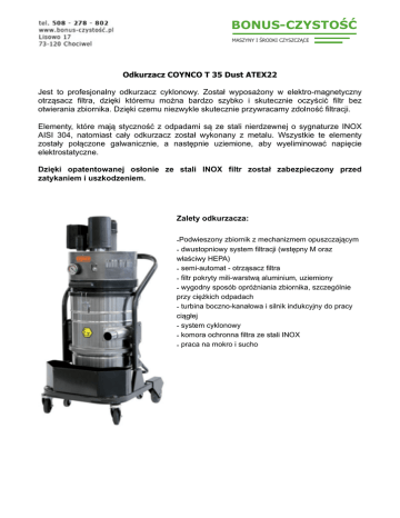 ! ! ! ! Odkurzacz COYNCO T 35 Dust ATEX22 ! Jest to profesjonalny odkurzacz cyklonowy. Został wyposażony w elektro-magnetyczny otrząsacz filtra, dzięki któremu można bardzo szybko i skutecznie oczyścić filtr bez otwierania zbiornika. Dzięki czemu niezwykle skutecznie przywracamy zdolność filtracji. ! Elementy, które mają styczność z odpadami są ze stali nierdzewnej o sygnaturze INOX AISI 304, natomiast cały odkurzacz został wykonany z metalu. Wszystkie te elementy zostały połączone galwanicznie, a następnie uziemione, aby wyeliminować napięcie elektrostatyczne. ! Dzięki opatentowanej osłonie ze stali INOX filtr został zabezpieczony przed zatykaniem i uszkodzeniem. ! ! Zalety odkurzacza: ! -Podwieszony zbiornik z mechanizmem opuszczającym - dwustopniowy system filtracji (wstępny M oraz właściwy HEPA) - semi-automat - otrząsacz filtra - filtr pokryty mili-warstwą aluminium, uziemiony - wygodny sposób opróżniania zbiornika, szczególnie przy ciężkich odpadach - turbina boczno-kanałowa i silnik indukcyjny do pracy ciągłej - system cyklonowy - komora ochronna filtra ze stali INOX - praca na mokro i sucho ! ! ! ! ! ! ! ! ! ! ! ! ! Dane techniczne T 35 Dust ATEX 22 Zasilanie 230V 50Hz 1N 400V 50Hz 3N Turbina boczno kanałowa SOLARYS 2,2 kW Przepływ powietrza 320 m3/h Podciśnienie max 320 mBar Powierzchnia filtra głównego 12.000 cm2 Klasa filtra głównego M Filtr HEPA H14 EN60335-2-69 99,995% 0,3µ (opcja) Pojemność zbiornika 35 litrów Średnica połączenia Ø 60 Klasa izolacji F Stopień ochronny IP 65 Głośność 73 dB Wymiar podstawowy 62 x 50 cm Wysokość 127 cm Waga 72 kg Certyfikacja ATEX II 3GD EEx nA II T4 / T135°C IP 65 ! ! Akceosoria: ! - wąż Condiflex Atex Ø 50 10 x 80 zł/m - Zakończenie węża Ø50 Atex x 2 szt. x 56 zł - Rura podwójnie zgięta do ssawy podłogowej - Ssawa podłogowa - Ssawa metalowo – gumowa ! Odkurzacz wyposażony jest w filtr klasy M, dodatkowo można doposażyć go w filtr HEPA