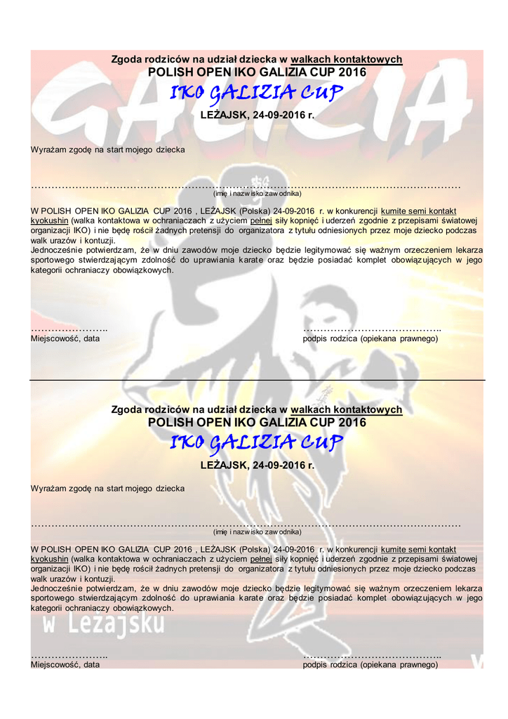 Zgoda rodziców na udział dziecka w walkach kontaktowych POLISH OPEN IKO GALIZIA CUP 2016 IKO GALIZIA CUP LEŻAJSK, 24-09-2016 r. Wyrażam zgodę na start mojego dziecka ……………………………………………………………………………………………………………… (imię i nazw isko zaw odnika) W POLISH OPEN IKO GALIZIA CUP 2016 , LEŻAJSK (Polska) 24-09-2016 r. w konkurencji kumite semi kontakt kyokushin (walka kontaktowa w ochraniaczach z użyciem pełnej siły kopnięć i uderzeń zgodnie z przepisami światowej organizacji IKO) i nie będę rościł żadnych pretensji do organizatora z tytułu odniesionych przez moje dziecko podczas walk urazów i kontuzji. Jednocześnie potwierdz am, że w dniu zawodów moje dziecko będzie legitymować się ważnym orzeczeniem lekarza sportowego stwierdzającym zdolność do uprawiania k arat e oraz będzie posiadać komplet obowiąz ujących w jego kategorii ochraniaczy obowiązkowych. ………………….. ………………………………….. Miejscowość, data podpis rodzica (opiekana prawnego) Zgoda rodziców na udział dziecka w walkach kontaktowych POLISH OPEN IKO GALIZIA CUP 2016 IKO GALIZIA CUP LEŻAJSK, 24-09-2016 r. Wyrażam zgodę na start mojego dziecka ……………………………………………………………………………………………………………… (imię i nazw isko zaw odnika) W POLISH OPEN IKO GALIZIA CUP 2016 , LEŻAJSK (Polska) 24-09-2016 r. w konkurencji kumite semi kontakt kyokushin (walka kontaktowa w ochraniaczach z użyciem pełnej siły kopnięć i uderzeń zgodnie z przepisami światowej organizacji IKO) i nie będę rościł żadnych pretensji do organizatora z tytułu odniesionych przez moje dziecko podczas walk urazów i kontuzji. Jednocześnie potwierdz am, że w dniu zawodów moje dziecko będzie legitymować się ważnym orzeczeniem lekarza sportowego stwierdzającym zdolność do uprawiania k arat e oraz będzie posiadać komplet obowiąz ujących w jego kategorii ochraniaczy obowiązkowych. ………………….. Miejscowość, data ………………………………….. podpis rodzica (opiekana prawnego) Zgoda pełnoletniego uczestnika na udział w walkach kontaktowych na Międzynarodowym Turnieju Karate Polish Open IKO „Galizia CUP” Leżajsk, sobota 24 wrzesień 2016r. ………………………………………………………………………………….… (imię i nazw isko zaw odnika) ……………………………… (PESEL zaw odnika) Ośw iadczam, że znam zasady w alki w Międzynarodowym Turnieju Karate Polish Open IKO „Galizia CUP” - Leżajsk, sobota 24 w rzesień 2016r. w konkurencji kumite ful kontakt karate kyokushin (walka kontaktowa z użyciem pełnej siły kopnięć i uderzeń) oraz obowiązujące regulaminy i przepis y. W pełni i bez jakichkolw iek zastrzeżeń zwalniam organizatorów zawodów, sędziów, instruktorów, trenerów, pracowników, przedstawic ieli, członków, autoryzowanych i zaproszonych gości od jakiejkolw iek odpowiedzialności wynikającej z zaistniałego wypadku, kontuzji lub utraty zdrow ia, którego to w ydarzenia mógłbym być ofiarą lub pow odem. Wyrażam zgodę, aby wszystkie dostarczone przeze mnie reprodukcje podobizny mojej osoby, stworzone w dowolny sposób oraz wszystkie reprodukcje podobizny mojej osoby wykonane w związku z ww. zawodami były wykorzystywane w dowolnej formie i dow olny sposób, między innymi, – choć nie wyłącznie – do celów reklamowych, promocyjnych, na kasetach w ideo, w filmach, telew iz ji, telew izji kablow ej, materiałach szkoleniowych i innych nośnikach dźwięku, obrazu i informacji i rezygnuję z wszelkich związanych z tym wynagrodzeń. Rezygnuję również z wszelkich roszczeń, jakie mógłbym/mogłabym mieć w związku z naruszeniem mojej pryw atności, zniesławieniem lub w oparciu o wszelkie inne odstaw y powództwa, wynikające z wyprodukowania, dystrybucji, nadania, rozpowszechniania, promocji wystawienia na w idok publiczny lub wykorzystania w jakikolw iek inny sposób mojej podobizny lub w ystępu utrwalonego na nośnikach dźwięku i obrazu w związku z ww. zawodami. Jednocześnie ośw iadczam , że w dniu zawodów będę legitymować się dowodem tożsamości ze zdjęciem, legitymacją IKO, będę posiadać komplet obowiązujących w mojej kategorii ochraniaczy obowiązkowych oraz że posiadam ważne w dniu zawodów (nie starsze niż sześć m iesięcy) orzeczenie lekarza sportowego stwierdzające zdolność do uprawiania karate i startu w zawodach. Niniejsze ośw iadczenie nie podlega zmianom ustnym. ………………….. Miejscowość, data ……………………………………………….. podpis pełnoletniego uczestnika turnieju ------------------------------------------------------------------------------------------------------------------------------------------------------------------------------- Zgoda pełnoletniego uczestnika na udział w walkach kontaktowych na Międzynarodowym Turnieju Karate Polish Open IKO „Galizia CUP” Leżajsk, sobota 24 wrzesień 2016r. ………………………………………………………………………………….… (imię i nazw isko zaw odnika) ……………………………… (PESEL zaw odnika) Ośw iadczam, że znam zasady w alki w Międzynarodowym Turnieju Karate Polish Open IKO „Galizia CUP” - Leżajsk, sobota 24 w rzesień 2016r. w konkurencji kum ite full kontakt karate kyokushin (walka kontaktowa z użyciem pełnej siły kopnięć i uderzeń) oraz obow iązujące regulaminy i przepis y. W pełni i bez jakichkolw iek zastrzeżeń zwalniam organizatorów zawodów, sędziów, instruktorów, trenerów, pracowników , przedstawic ieli, członków, autoryzowanych i zaproszonych gości od jakiejkolw iek odpowiedzialności wynikającej z zaistniałego wypadku, kontuzji lub utraty zdrow ia, którego to w ydarzenia mógłbym być ofiarą lub pow odem. Wyr